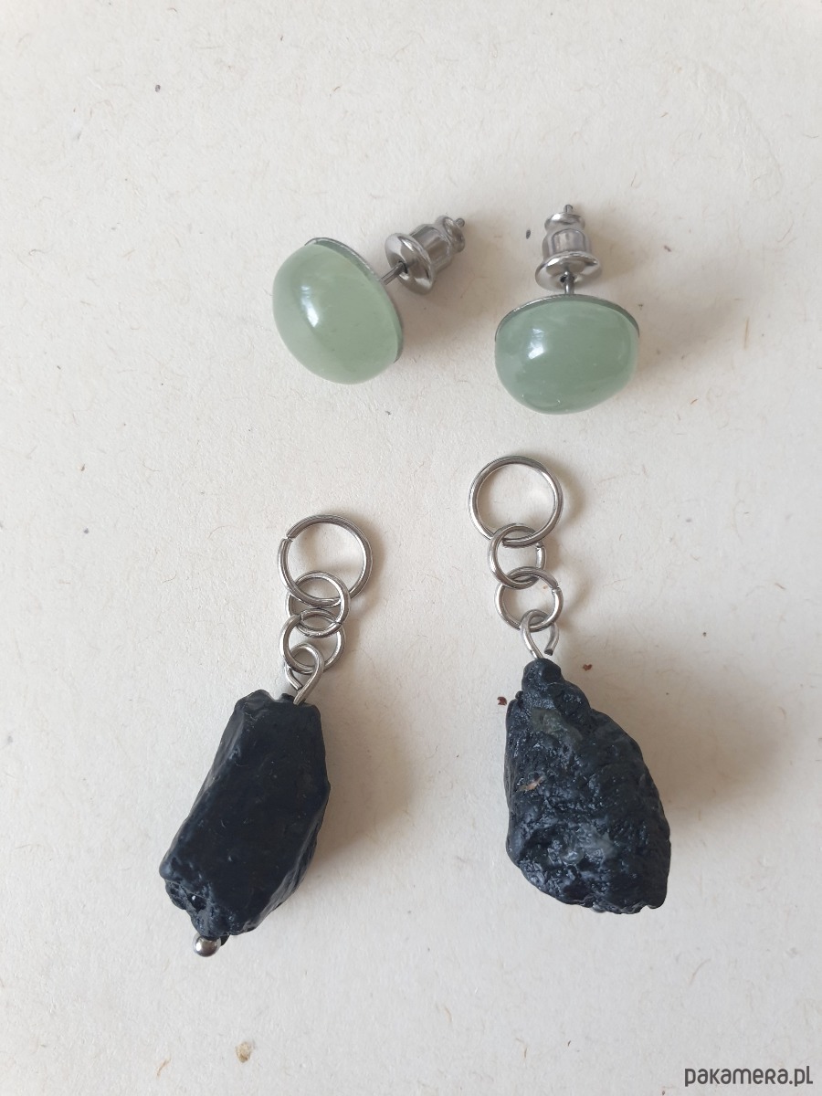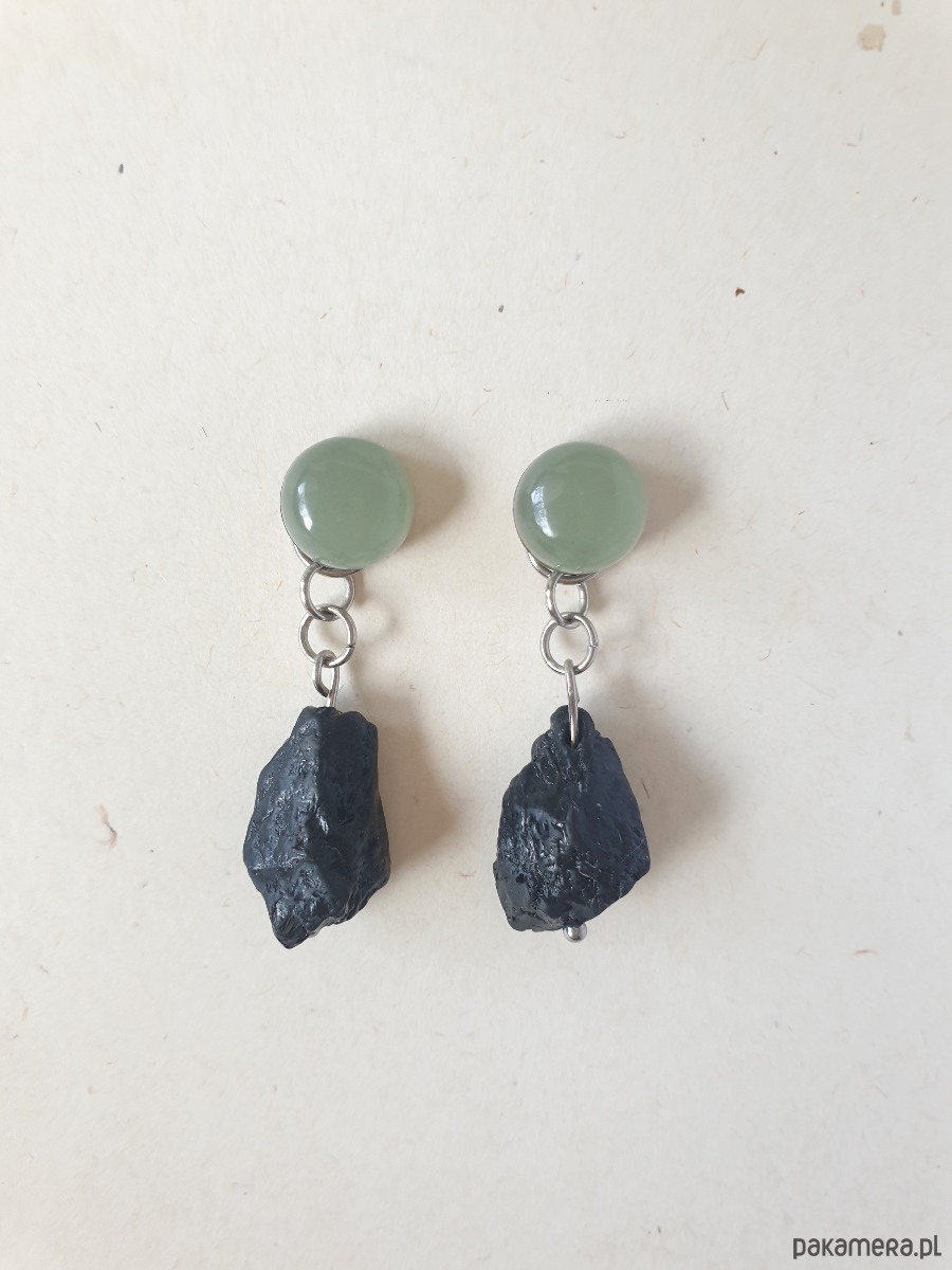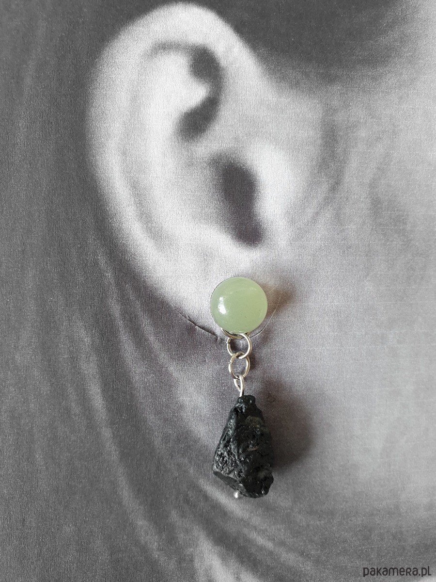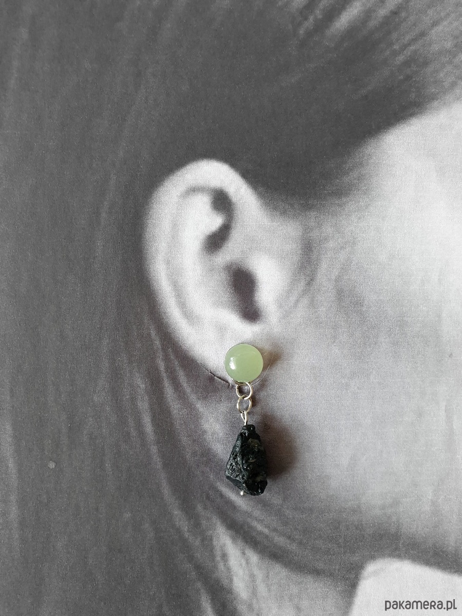 Kolczyki sztyfty, wiszące z kolekcji RAW, idealne na wieczorne wyjście ale też na co dzień. Wykonane ze stali szlachetnej (hipoalergicznej) z kamieniami naturalnymi: jadeit naturalny zielony z Birmy, surowy czarny turmalin. Kolczyki można nosić też jako same sztyfty kółka bez wiszącego elementu, bo jest osobno. Unikatowe egzemplarze ze względu na oryginalny kształt kamieni. Kolczyki są bardzo lekkie.