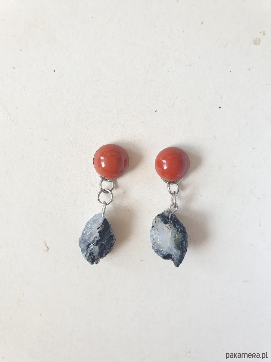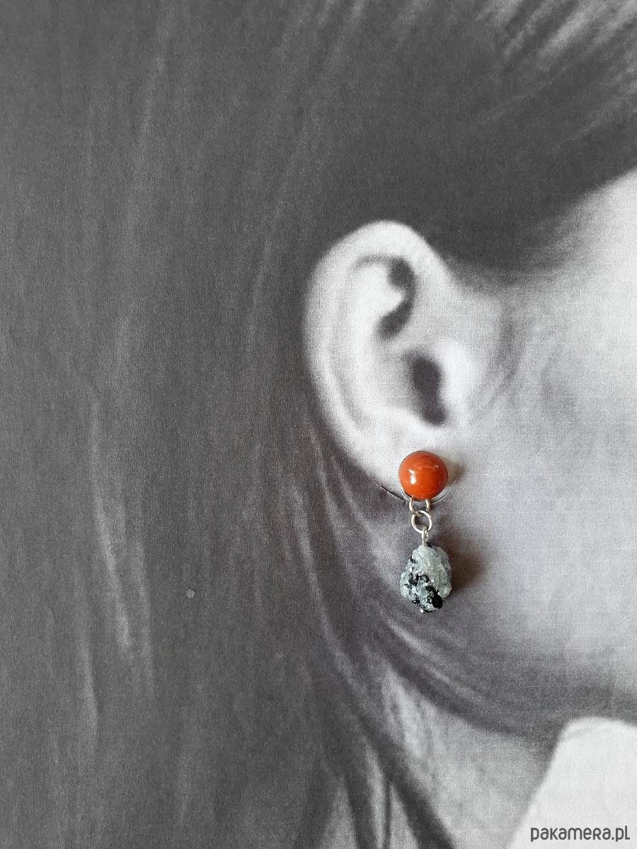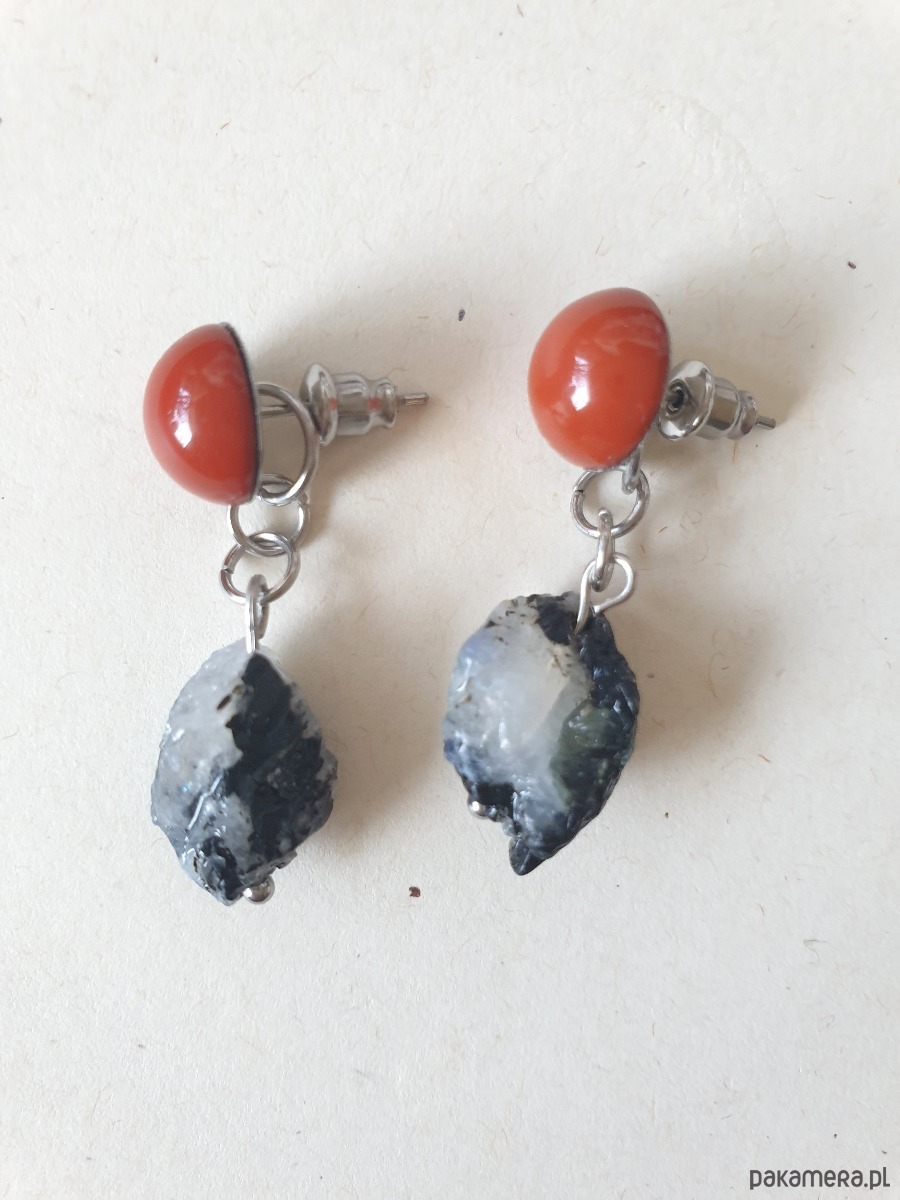 Kolczyki sztyfty, wiszące z kolekcji RAW, idealne na wieczorne wyjście ale też na co dzień. Wykonane ze stali szlachetnej (hipoalergicznej) z kamieniami naturalnymi: jaspis królewski czerwony, surowy kamień księżycowy (z inkluzjami czarnego turmalinu). Kolczyki można nosić też jako same sztyfty kółka bez wiszącego elementu, bo jest osobno. Unikatowe egzemplarze ze względu na oryginalny kształt kamieni. Kolczyki są bardzo lekkie.