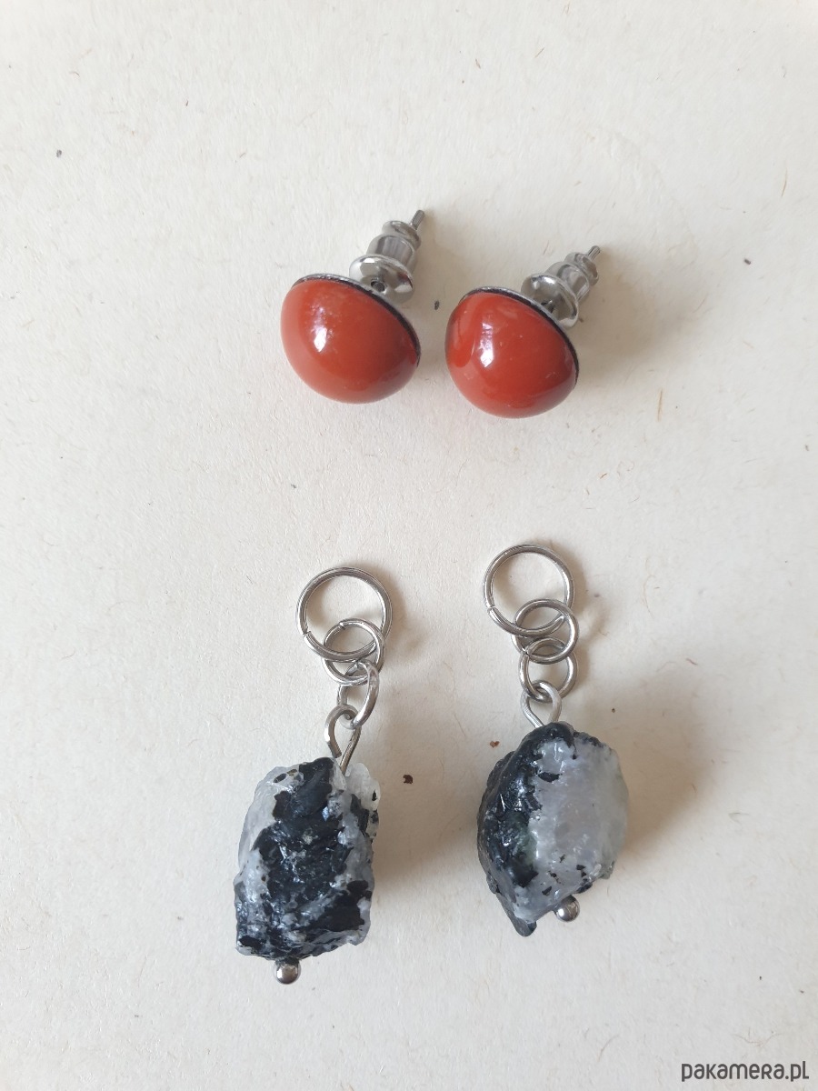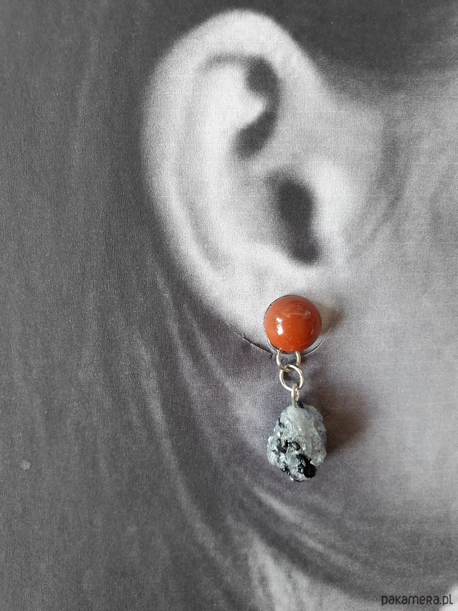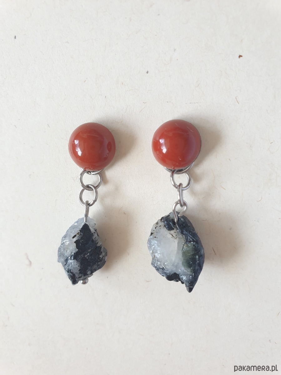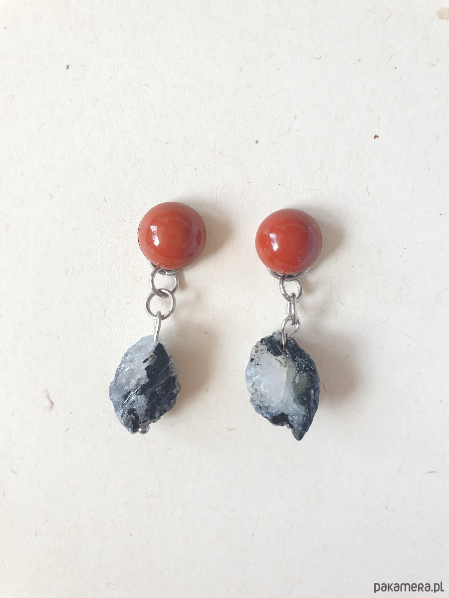Kolczyki sztyfty, wiszące z kolekcji RAW, idealne na wieczorne wyjście ale też na co dzień. Wykonane ze stali szlachetnej (hipoalergicznej) z kamieniami naturalnymi: jaspis królewski czerwony, surowy kamień księżycowy (z inkluzjami czarnego turmalinu). Kolczyki można nosić też jako same sztyfty kółka bez wiszącego elementu, bo jest osobno. Unikatowe egzemplarze ze względu na oryginalny kształt kamieni. Kolczyki są bardzo lekkie.