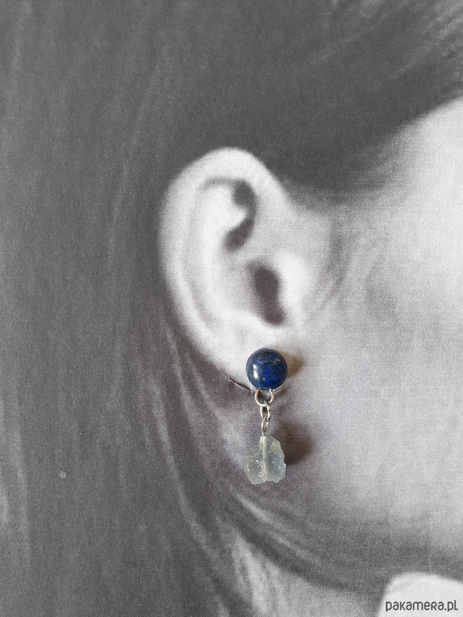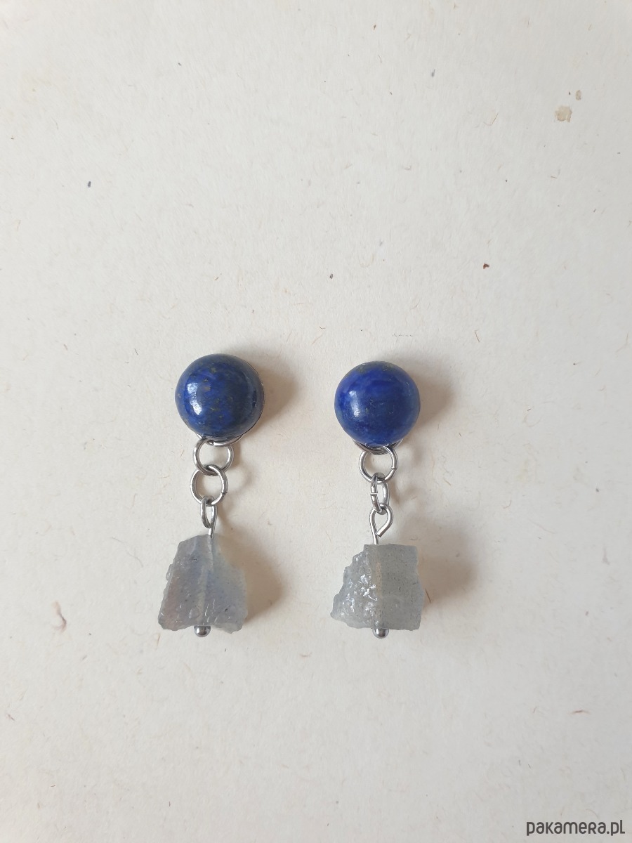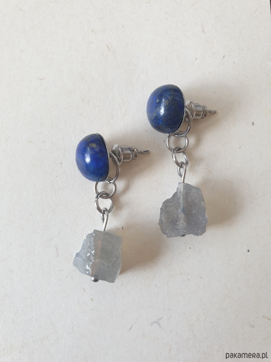 Kolczyki sztyfty, wiszące z kolekcji RAW, idealne na wieczorne wyjście ale też na co dzień. Wykonane ze stali szlachetnej (hipoalergicznej) z kamieniami naturalnymi: lapis lazuli, surowy labradoryt. Kolczyki można nosić też jako same sztyfty kółka bez wiszącego elementu, bo jest osobno. Unikatowe egzemplarze ze względu na oryginalny kształt kamieni. Kolczyki są bardzo lekkie.