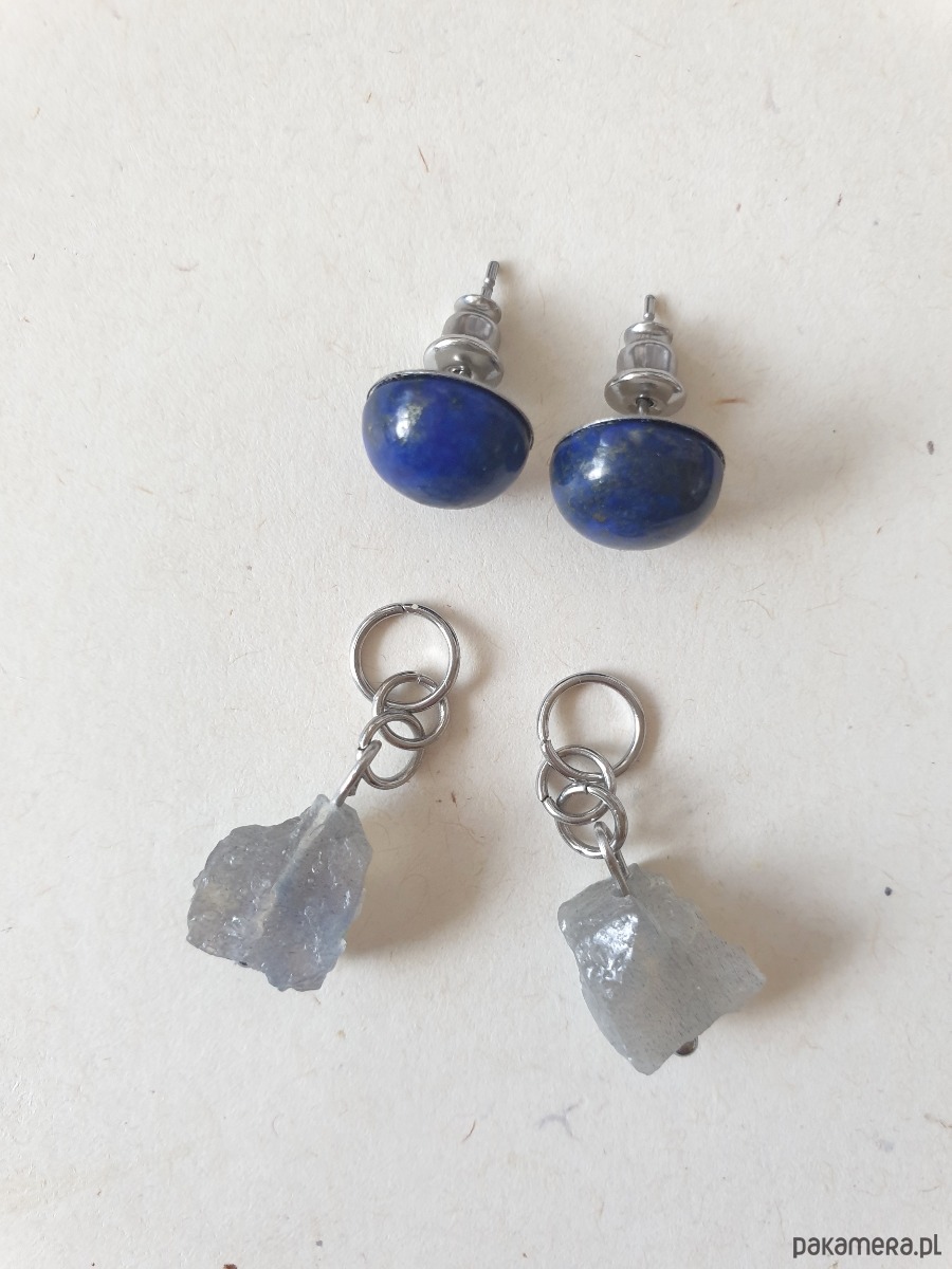 Wymiary: długość całego kolczyka z kamieniami ok 3,5 cm, średnica oczka lapisu ok 1 cm, wielkość surowego kamienia ok. 1/1 cm