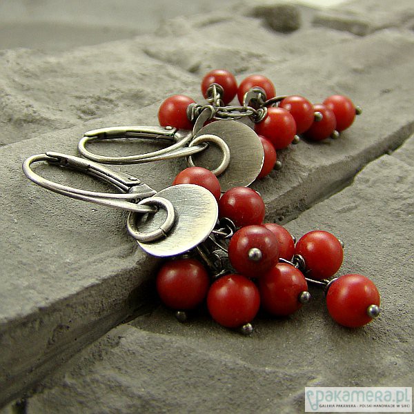 Kobiece i eleganckie kolczyki w formie gronek. Wykonane w całości z oksydowanego srebra próby 925 oraz 6 mm kulek czerwonego korala. Nad gronkami kamieni umieściłam srebrne blaszki wielkości 1 cm. W mojej galerii bransoletka do kompletu. Całkowita długość kolczyków to 5,5 cm. Ozdobnie zapakowane.