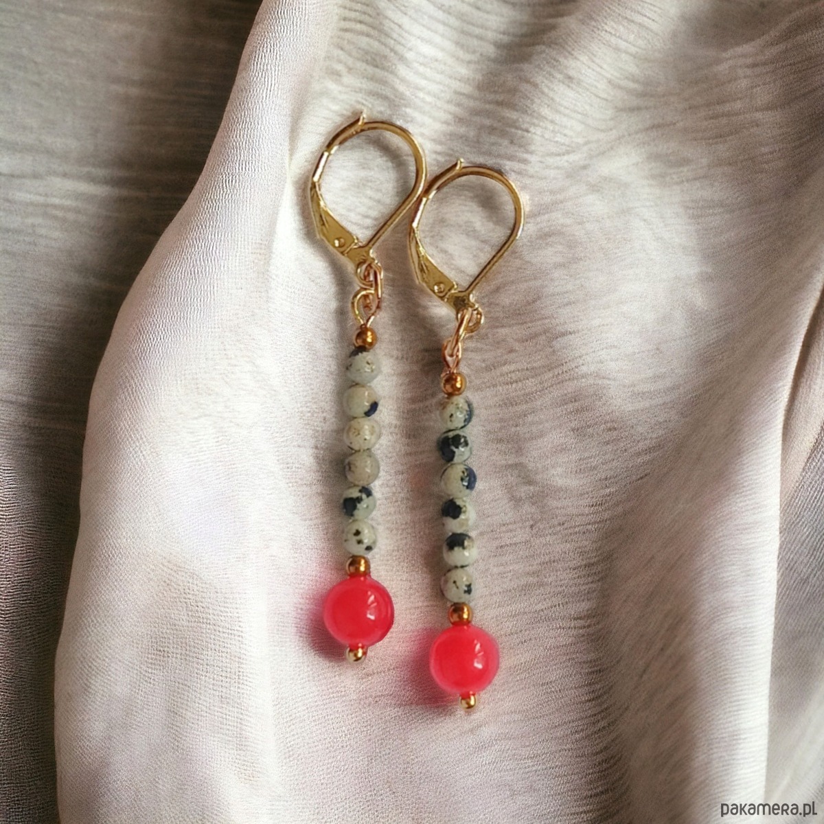 Kolczyki zostały wykonane z drobniutkich kuleczek jaspisu dalmatyńskiego 3mm, przekładek ze złotego hematytu oraz kontrastujących kul jadeitu w soczystym odcieniu czerwieni (6mm)