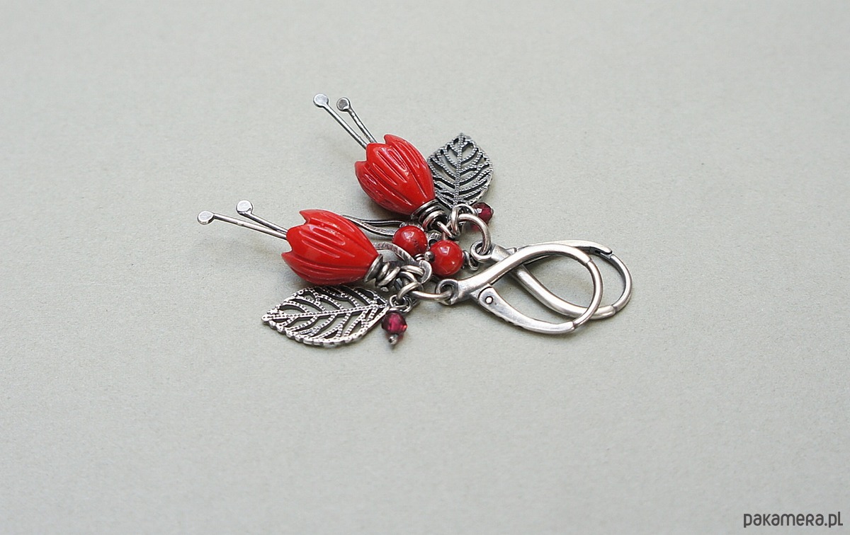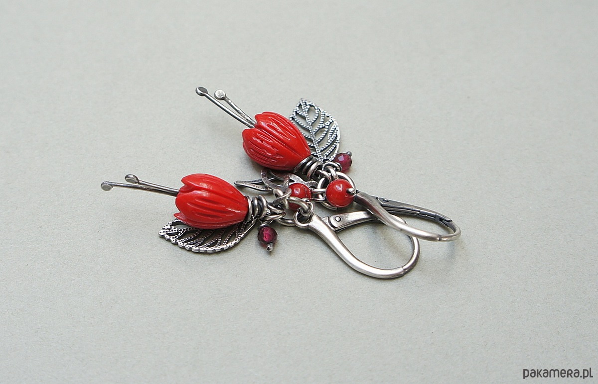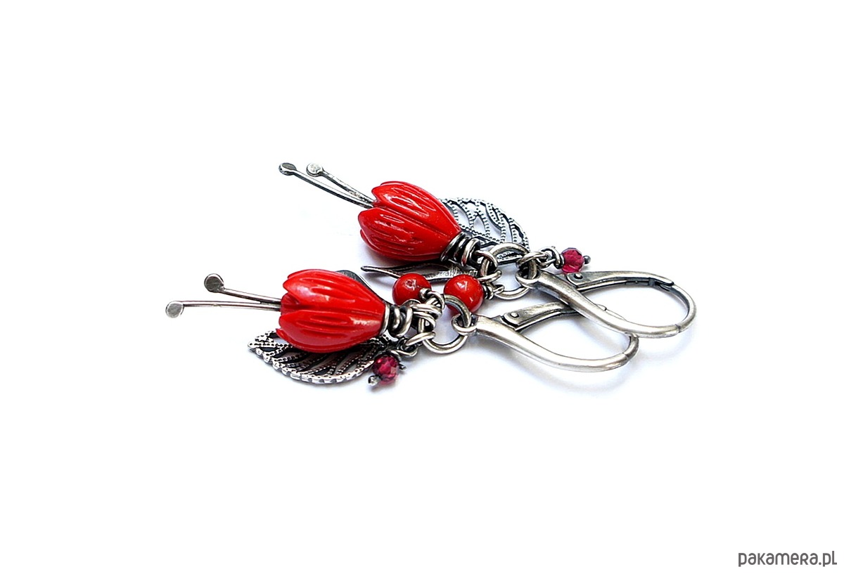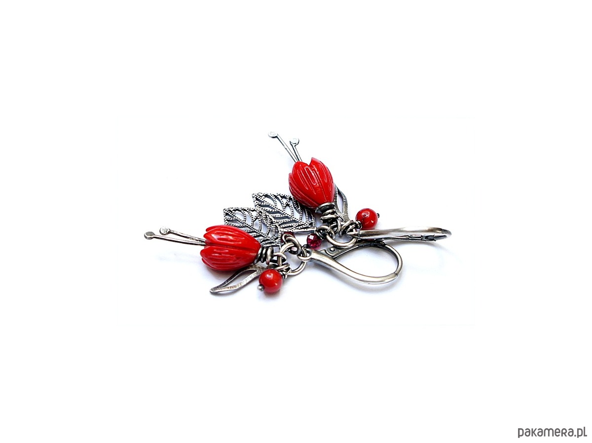 Kolczyki wykonane ze srebra [pr.925] w połączeniu z kielichami kwiatów z korala [10mm], fasetowanymi granatami [3mm], kuleczkami korala [4mm] oraz srebrnymi listkami. Całość oksydowana i przetarta. Całkowita długość kolczyków 5cm. Biżuteria ozdobnie zapakowana