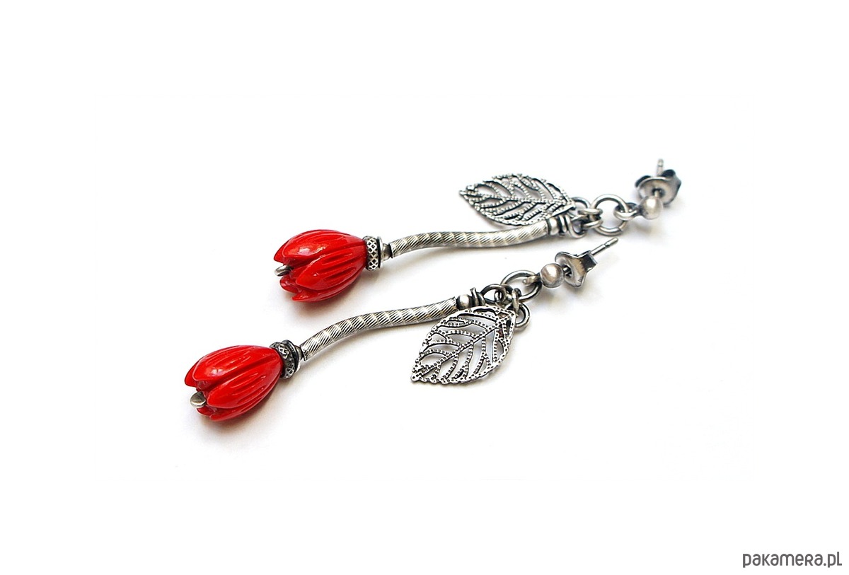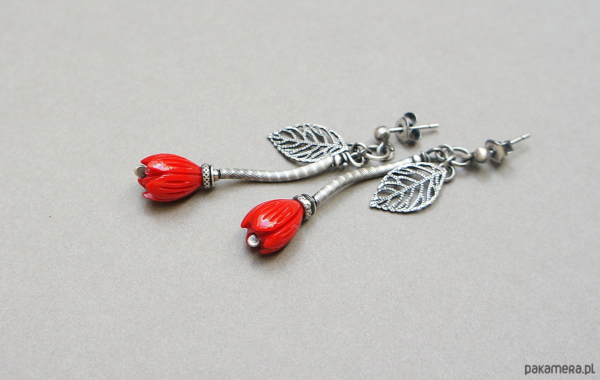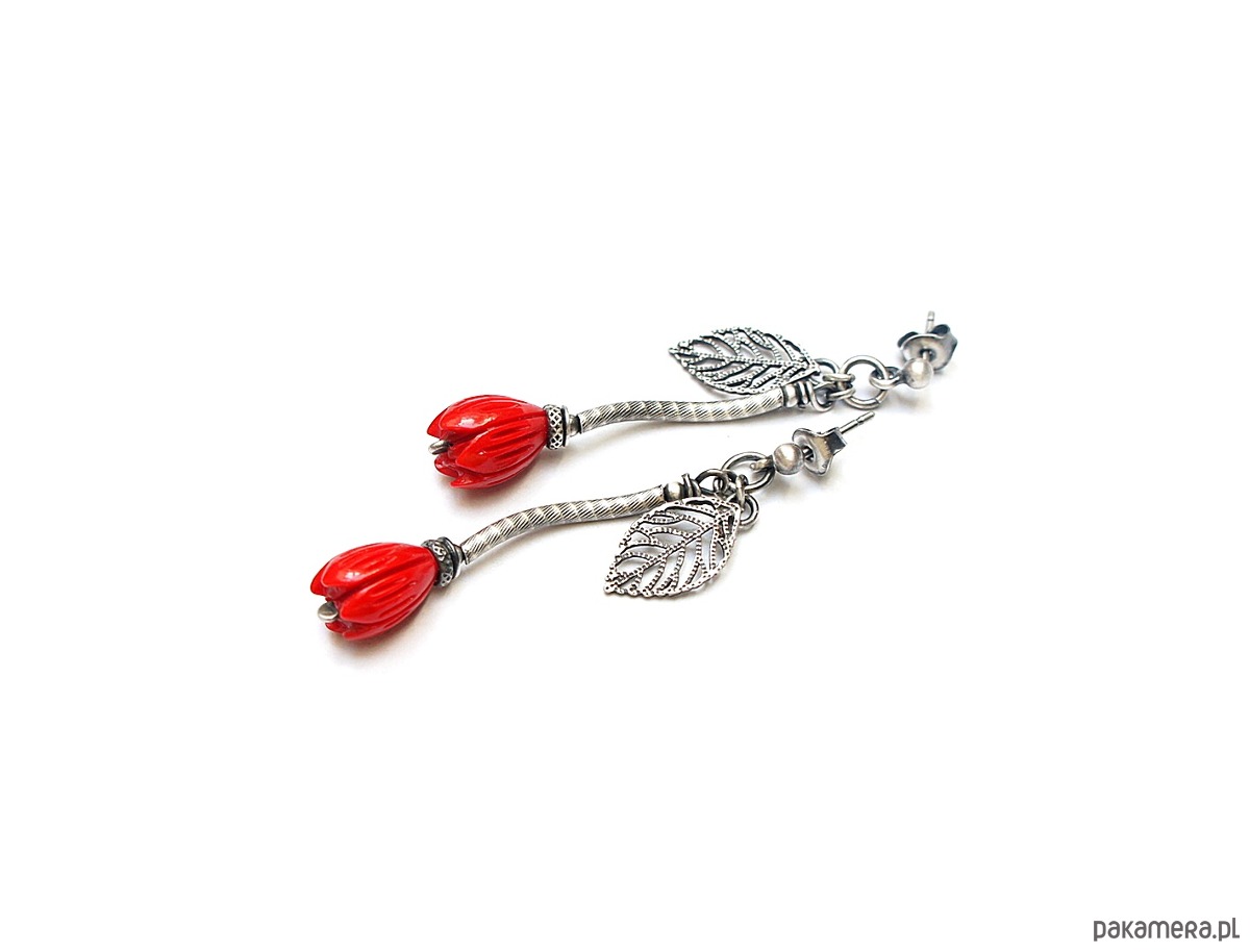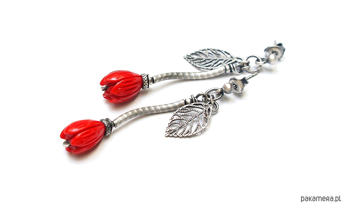 Kolczyki wykonane ze srebra [pr.925] w połączeniu z kielichami kwiatów z korala rekonstruowanego [10mm] oraz srebrnymi listkami. Całość oksydowana i przetarta. Całkowita długość kolczyków 5,3cm. Biżuteria ozdobnie zapakowana