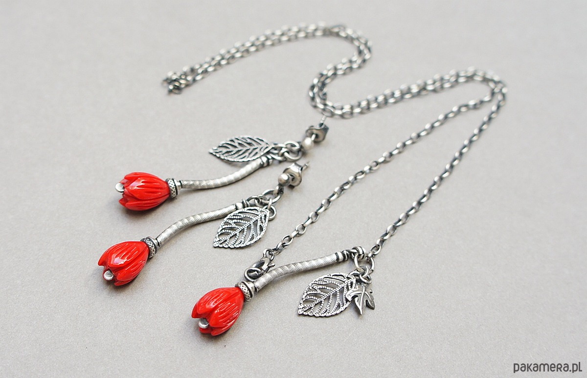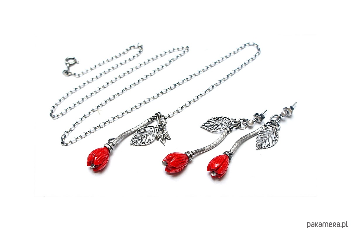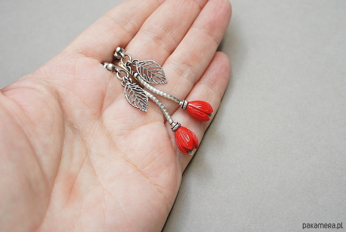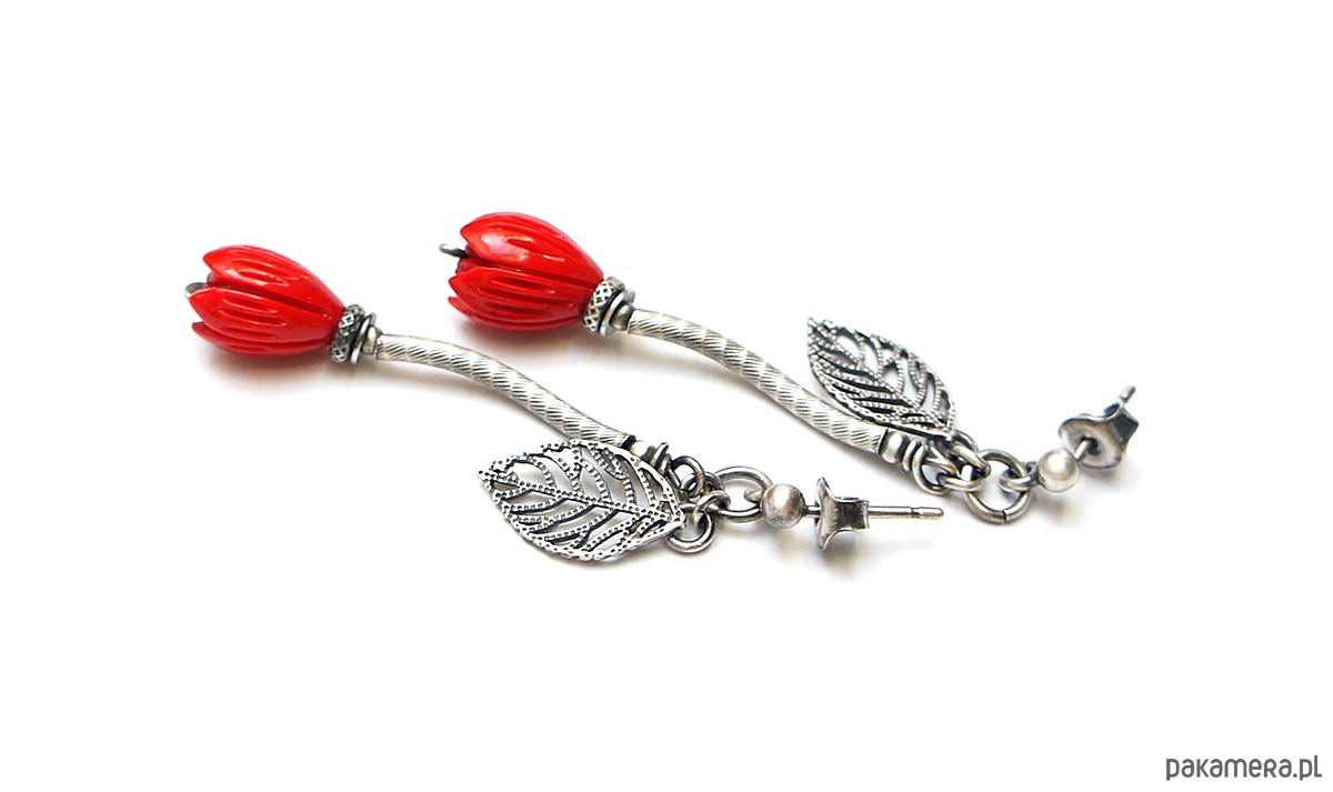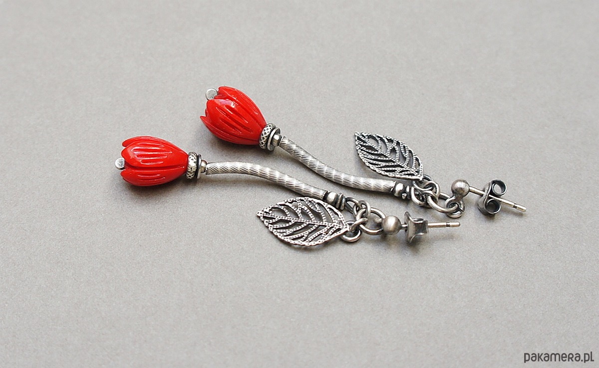 Kolczyki wykonane ze srebra [pr.925] w połączeniu z kielichami kwiatów z korala rekonstruowanego [10mm] oraz srebrnymi listkami. Całość oksydowana i przetarta. Całkowita długość kolczyków 5,3cm. Biżuteria ozdobnie zapakowana