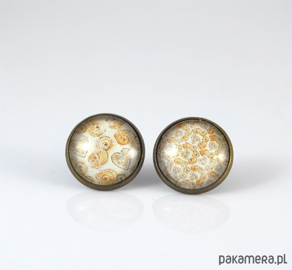 Grafika ukryta w prostych, eterycznych kolczykach, pod osłoną przeźroczystego półokrągłego szkiełka.