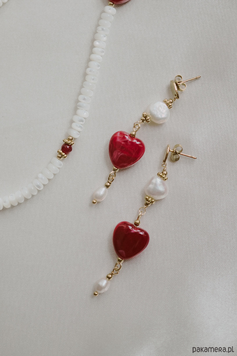 Długie wiszące kolczyki z czerwonym sercem z żywicy akrylowej w towarzystwie naturalnych pereł.