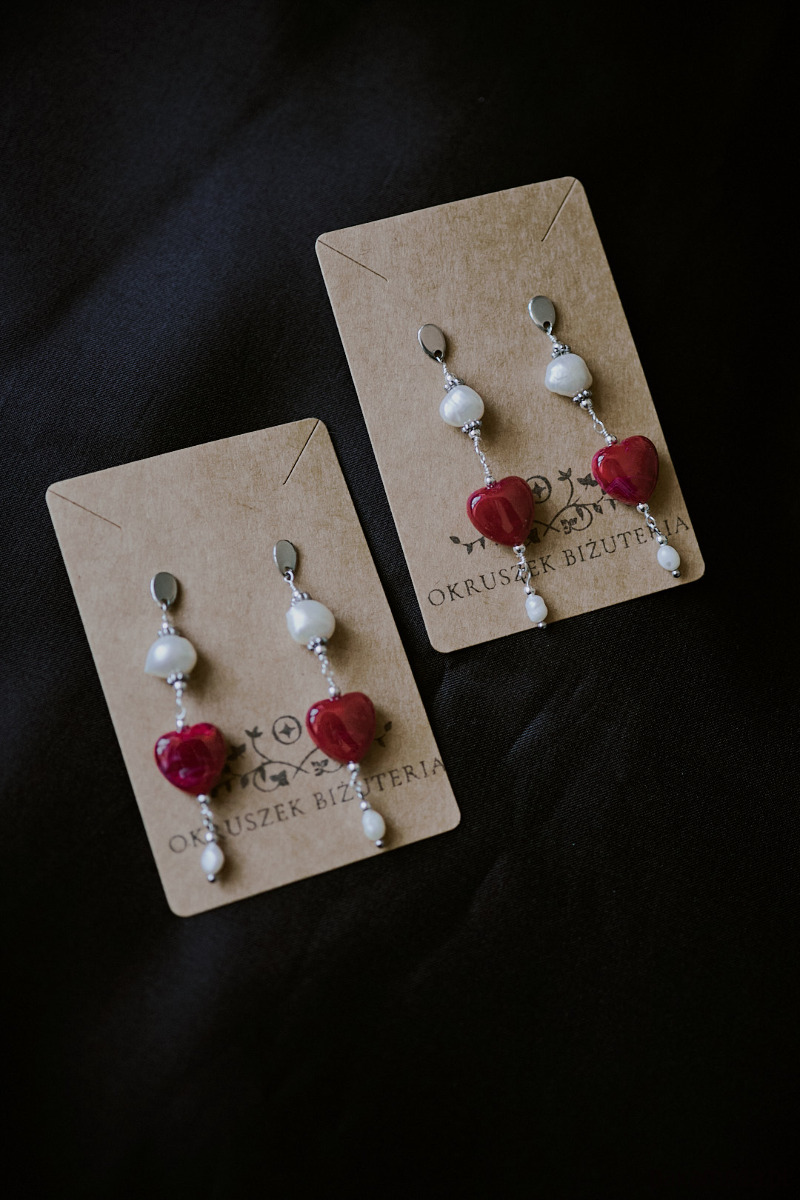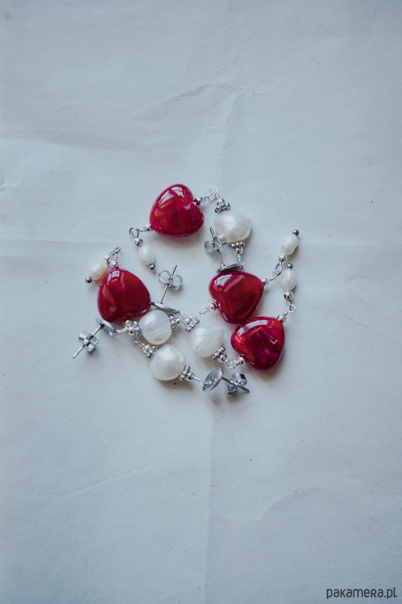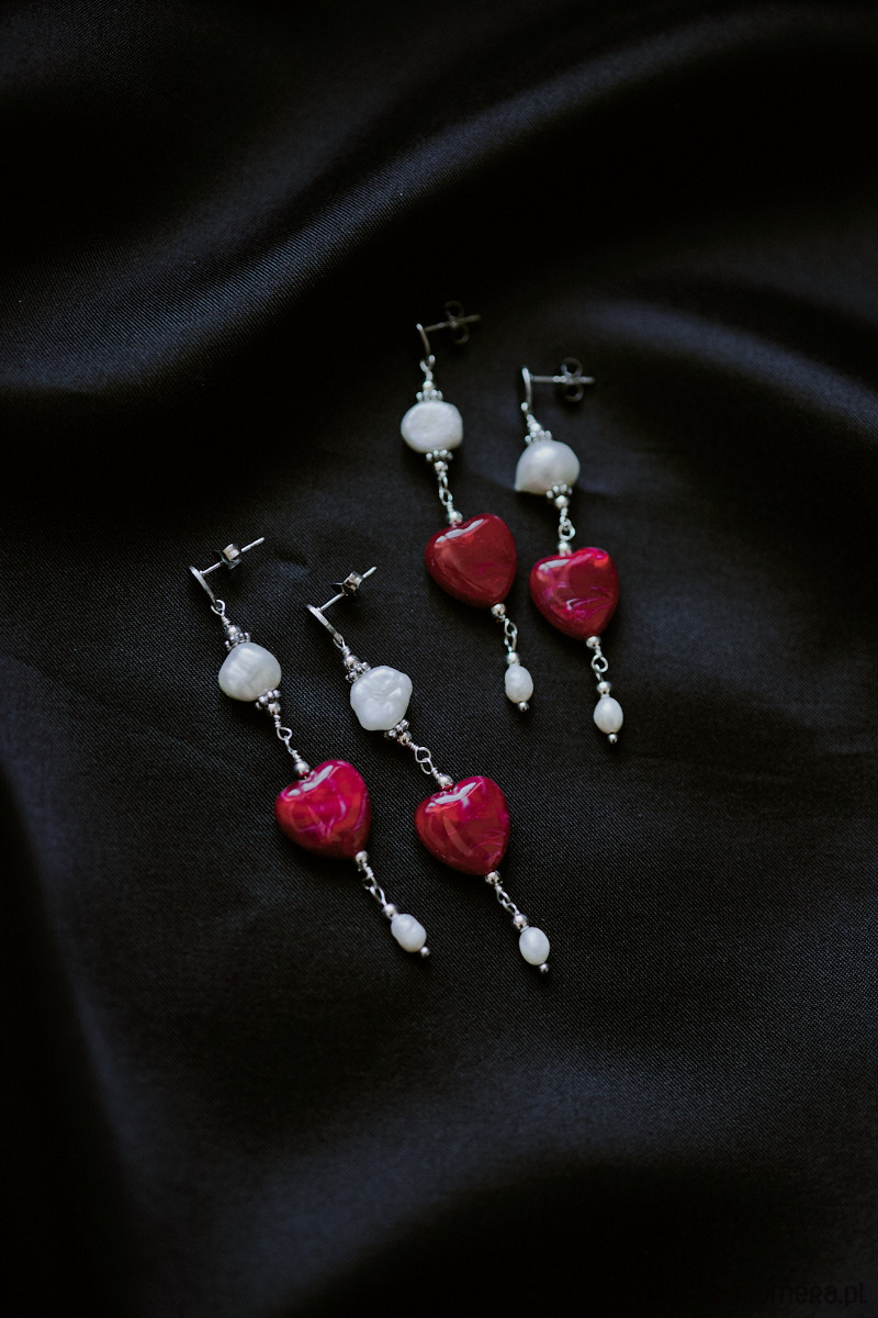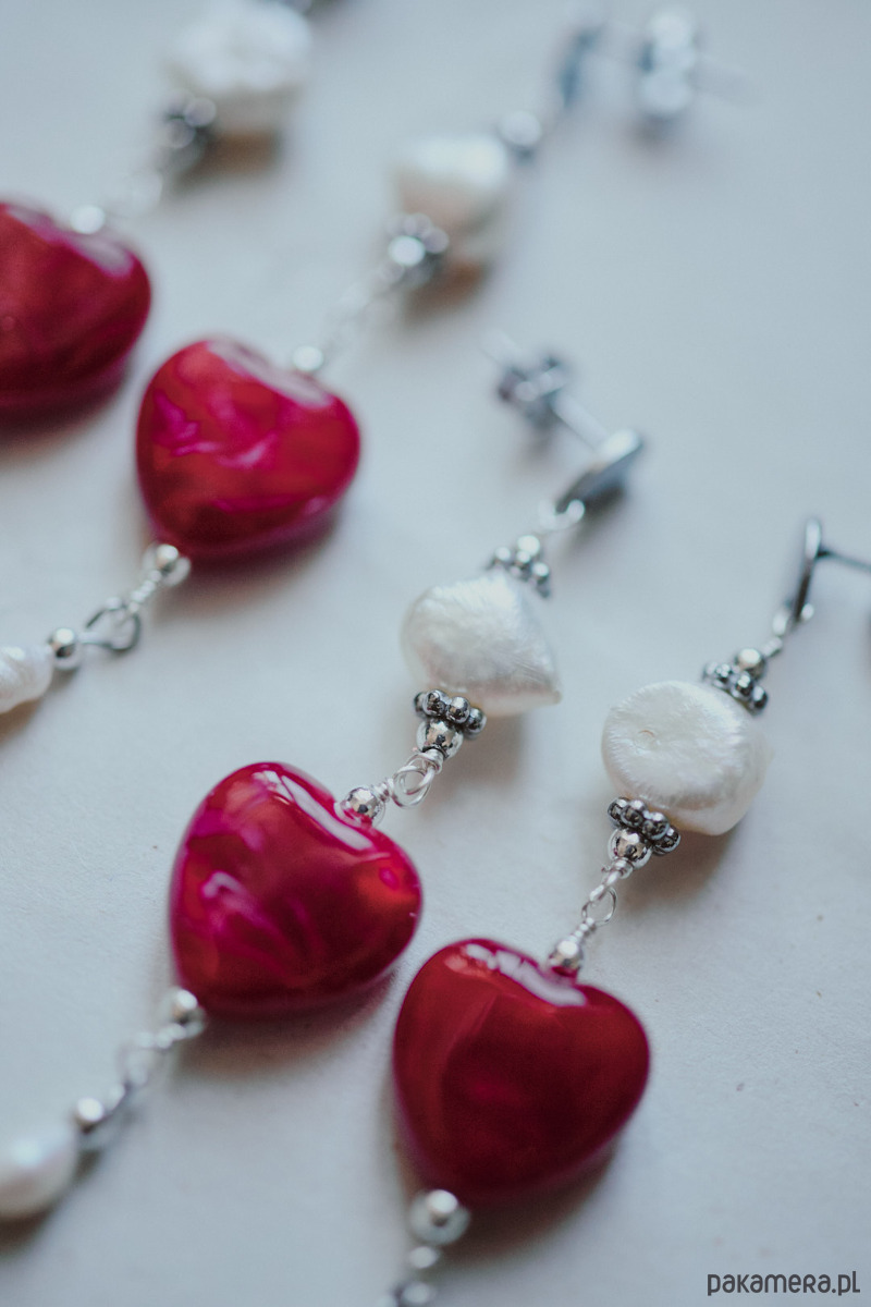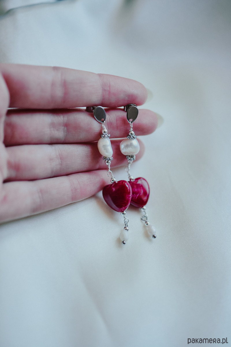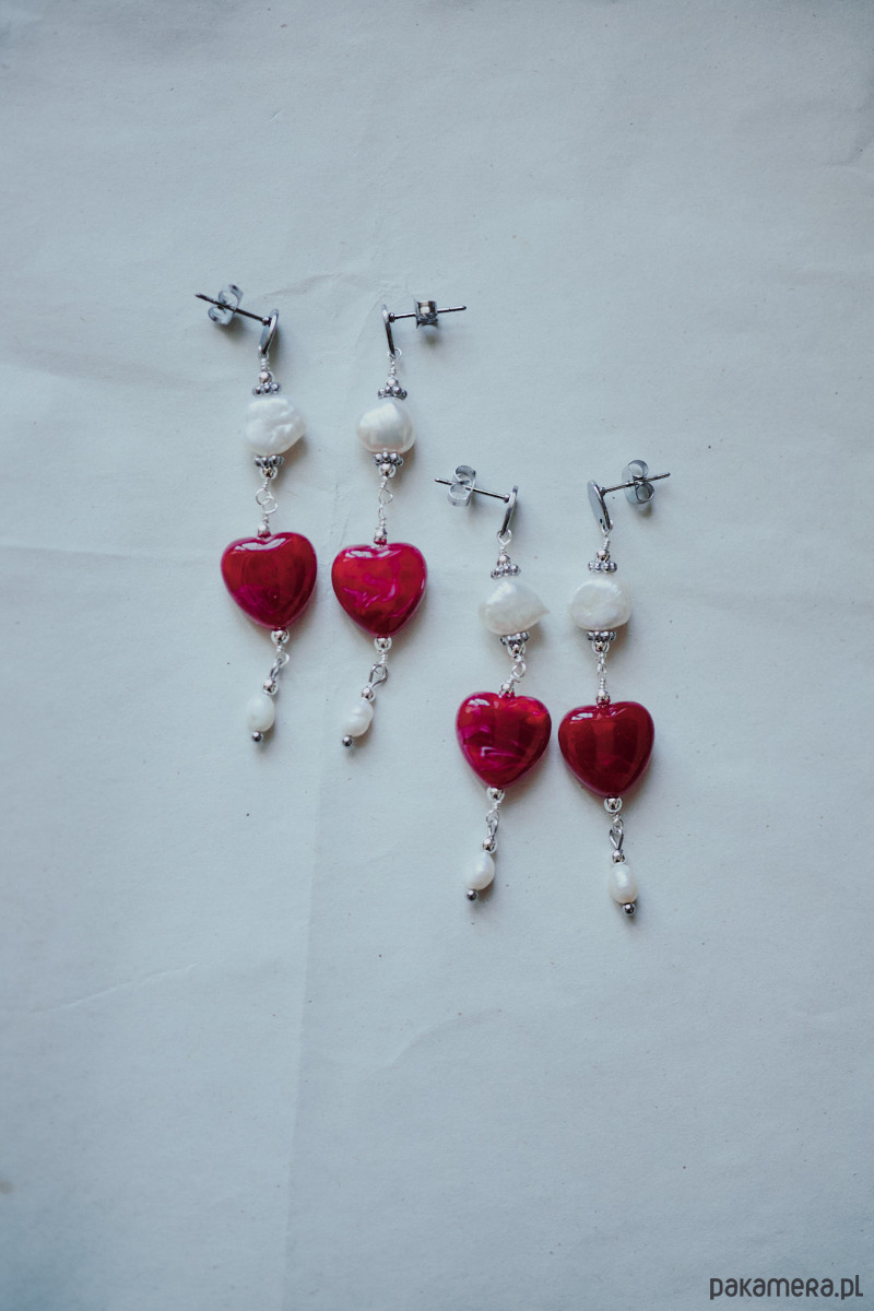 Długie wiszące kolczyki z czerwonym sercem z żywicy akrylowej w towarzystwie naturalnych pereł.