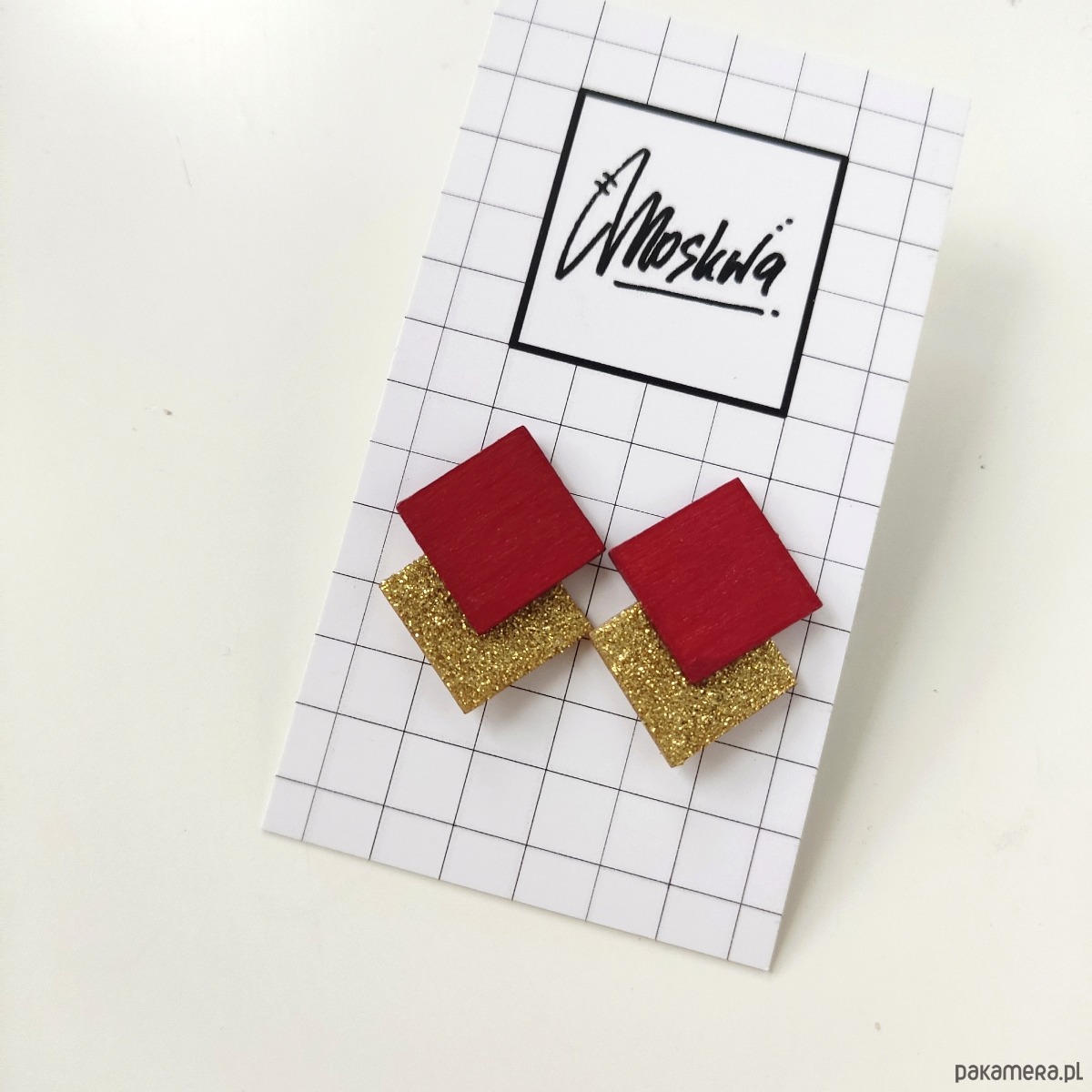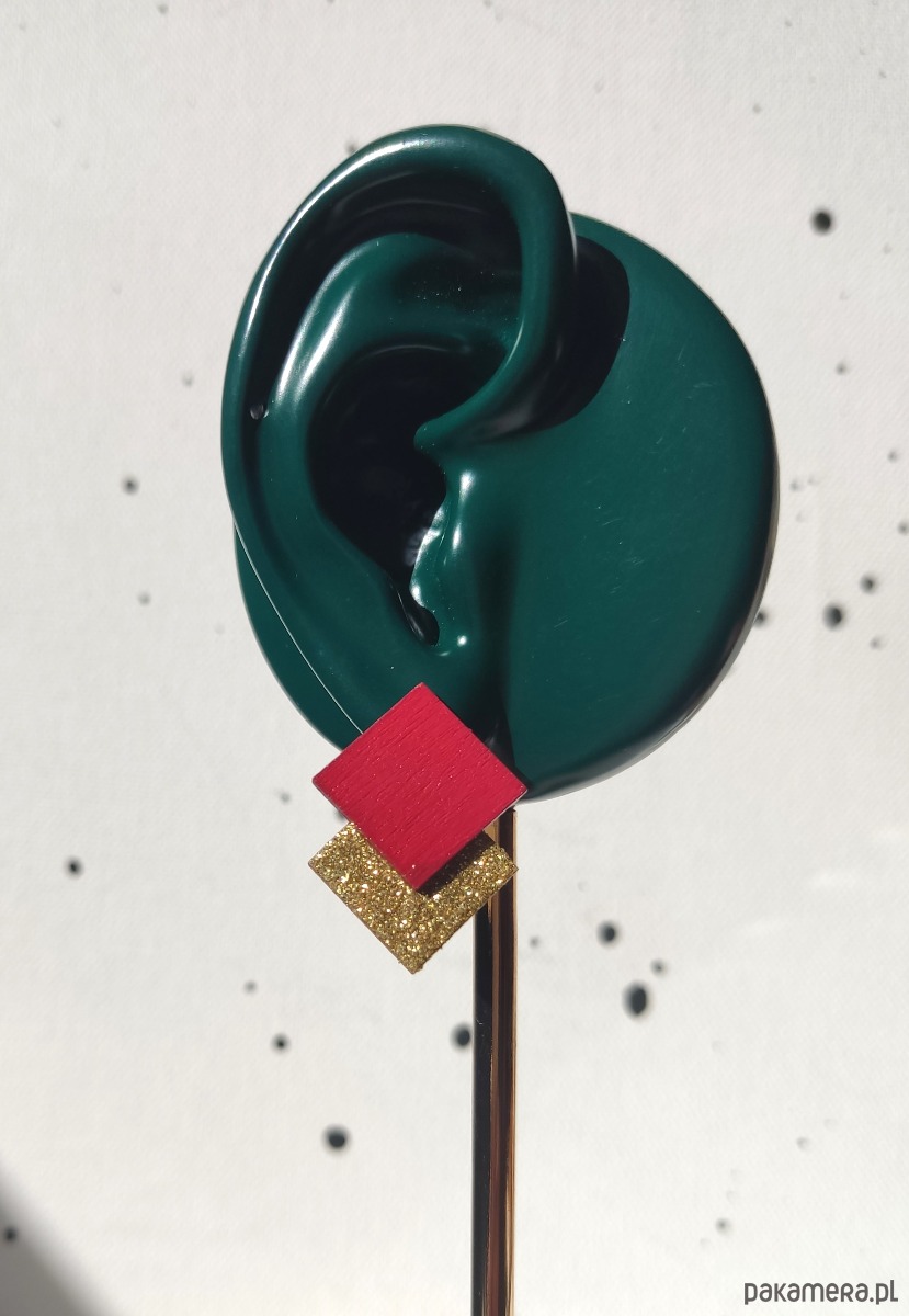 Kolczyki - wkrętki ze sklejki, wielkość 2 cm. Sztyfty ze stali chirurgicznej.