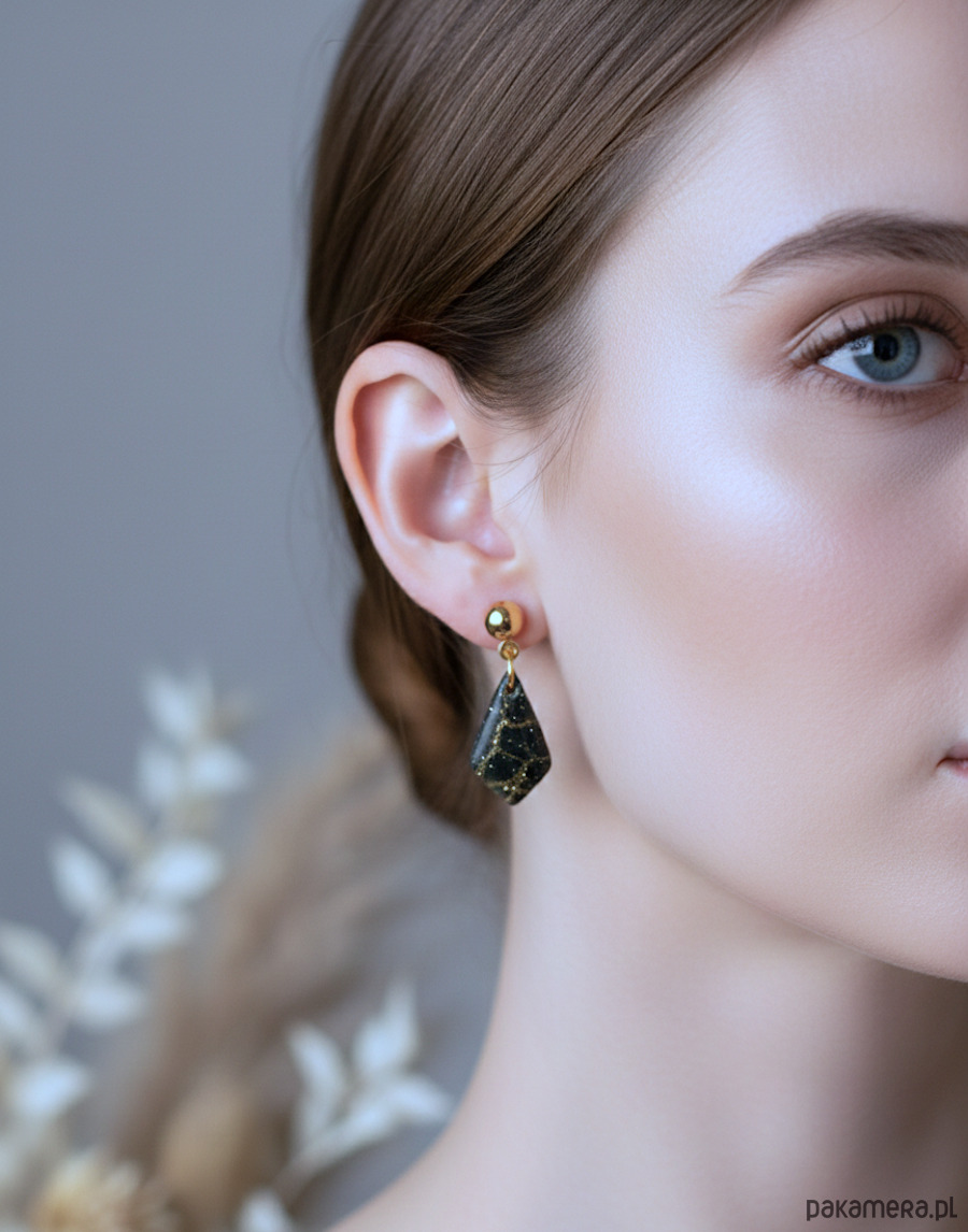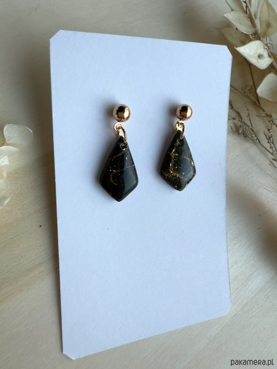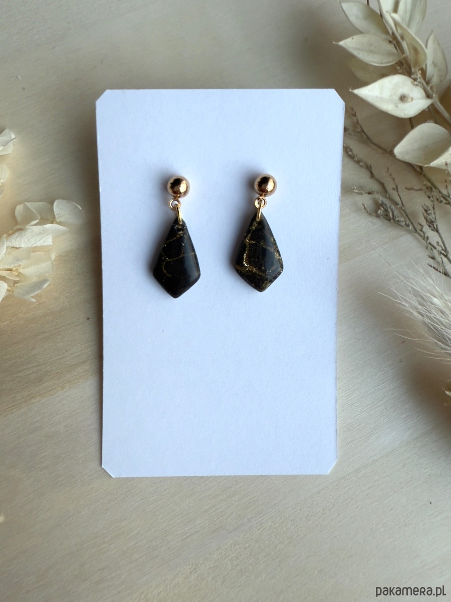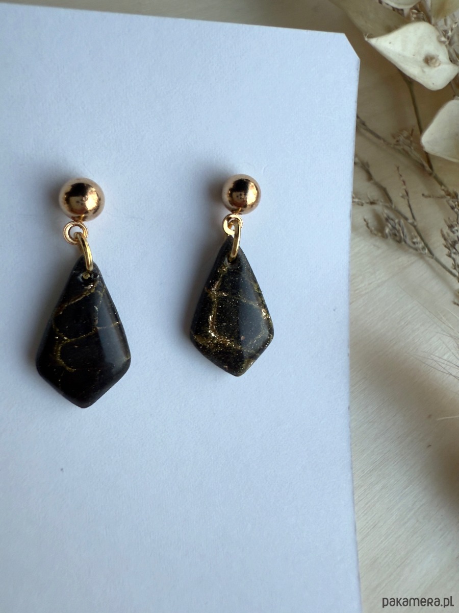 Dodaj swojej stylizacji eleganckiego blasku dzięki ręcznie wykonanym kolczykom w kształcie smukłych, czarnych rombów ze złotymi refleksami! Elementy dekoracyjne powstały z gliny polimerowej pokrytej żywicą, a pozostałe części wykonano ze stali chirurgicznej w złotym kolorze – odpowiednie również dla osób z wrażliwą skórą.