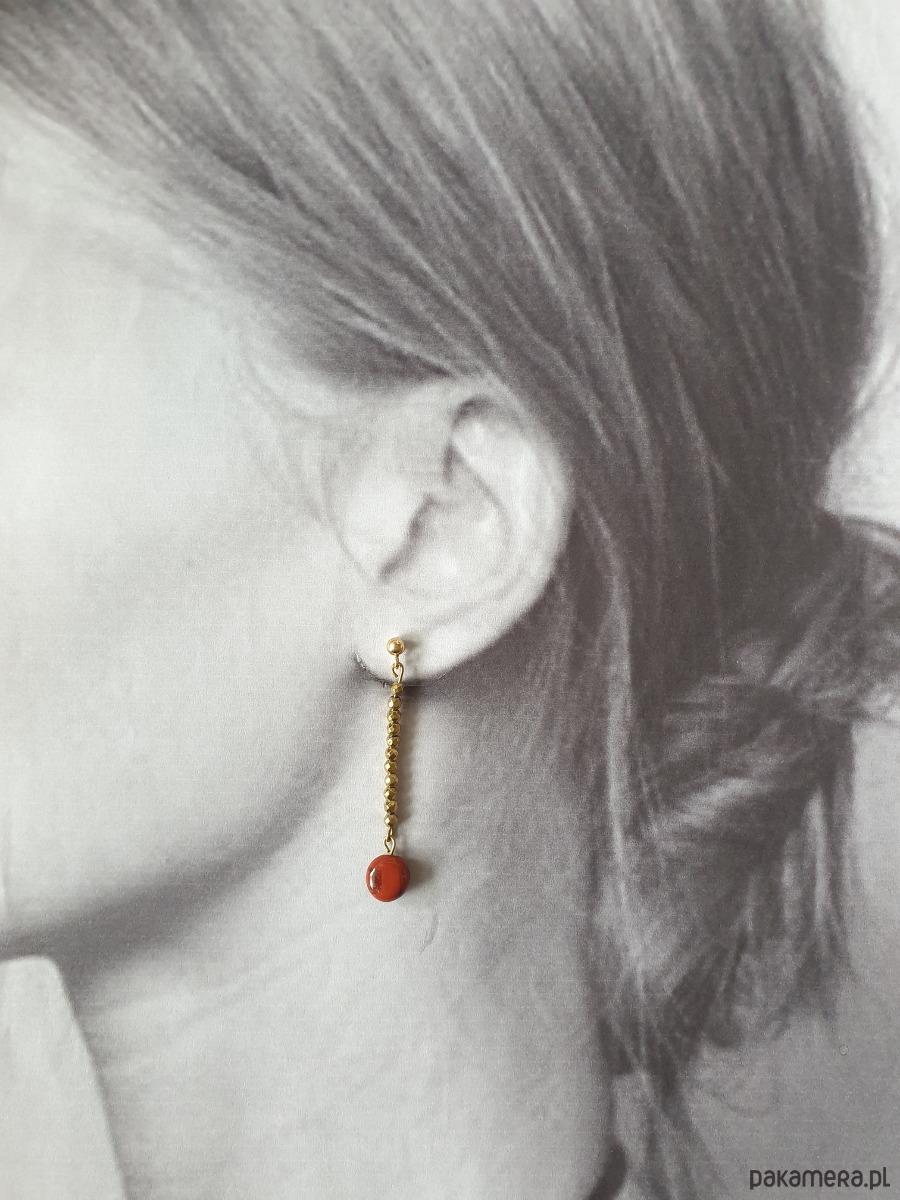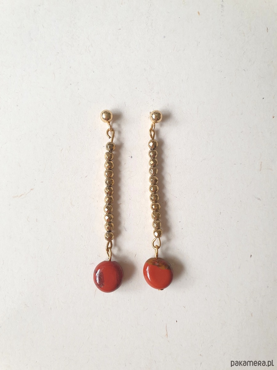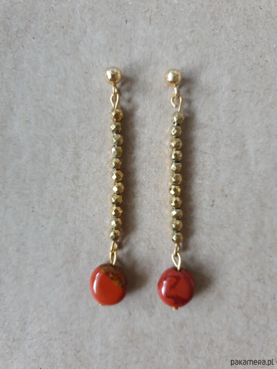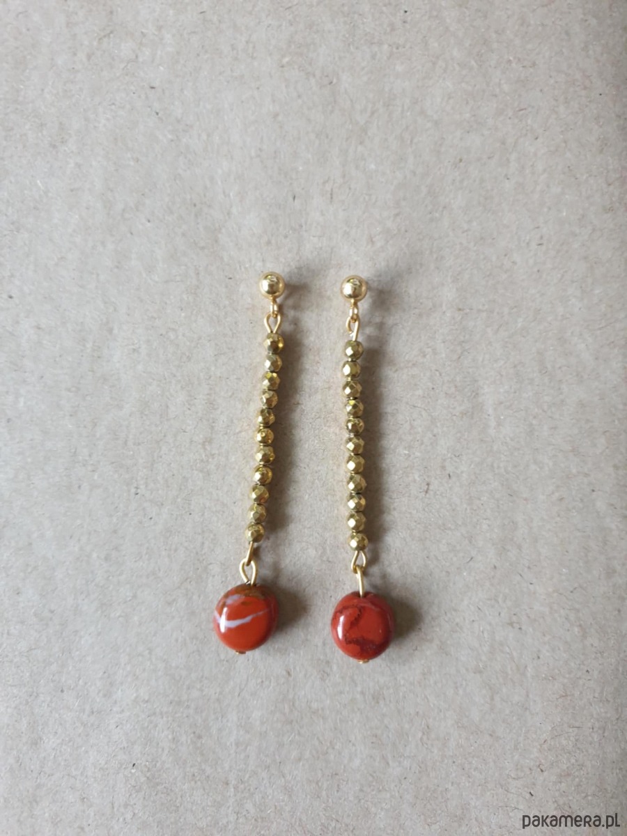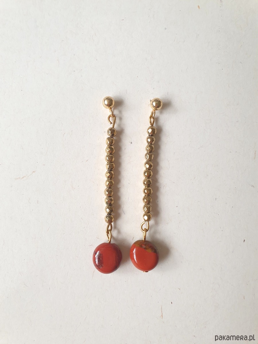 Delikatne długie, wiszące kolczyki z kolekcji ROOTS idealne na wieczorne wyjście ale też na co dzień. Wykonane ze stali szlachetnej (hipoalergicznej) złoconej z kamieniami naturalnymi: złoty hematyt, jaspis czerwony