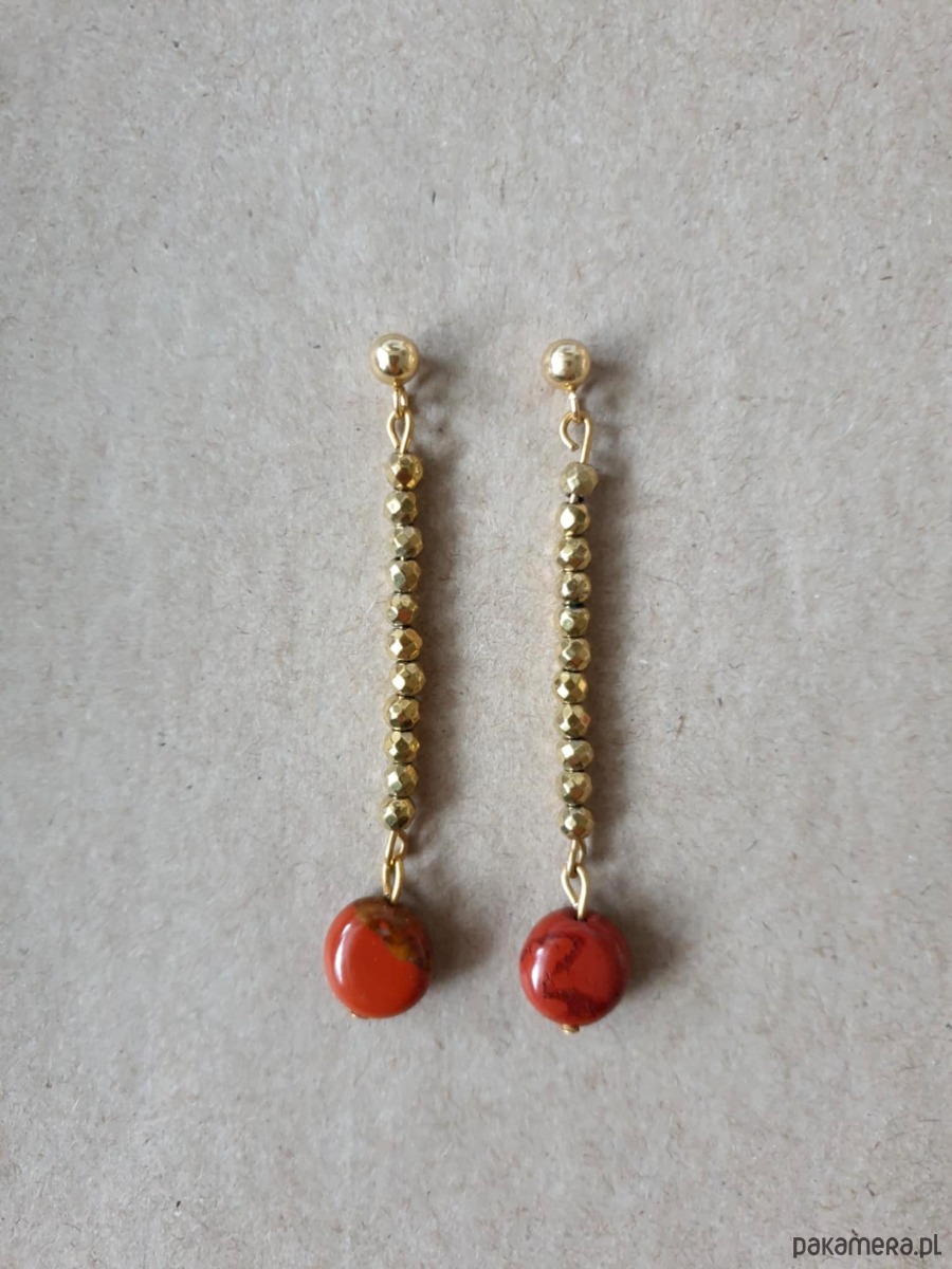Delikatne długie, wiszące kolczyki z kolekcji ROOTS idealne na wieczorne wyjście ale też na co dzień. Wykonane ze stali szlachetnej (hipoalergicznej) złoconej z kamieniami naturalnymi: złoty hematyt, jaspis czerwony