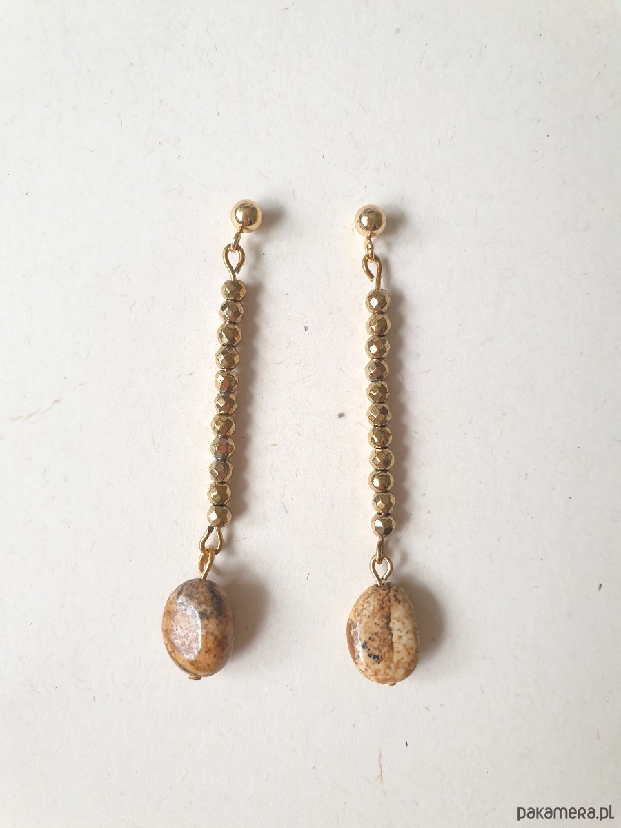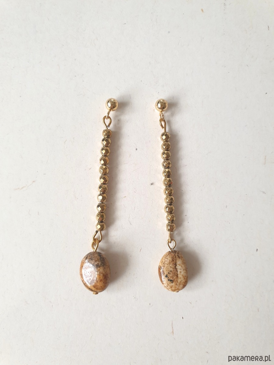 Delikatne długie, wiszące kolczyki z kolekcji ROOTS idealne na wieczorne wyjście ale też na co dzień. Wykonane ze stali szlachetnej (hipoalergicznej) złoconej z kamieniami naturalnymi: złoty hematyt, jaspis obrazkowy