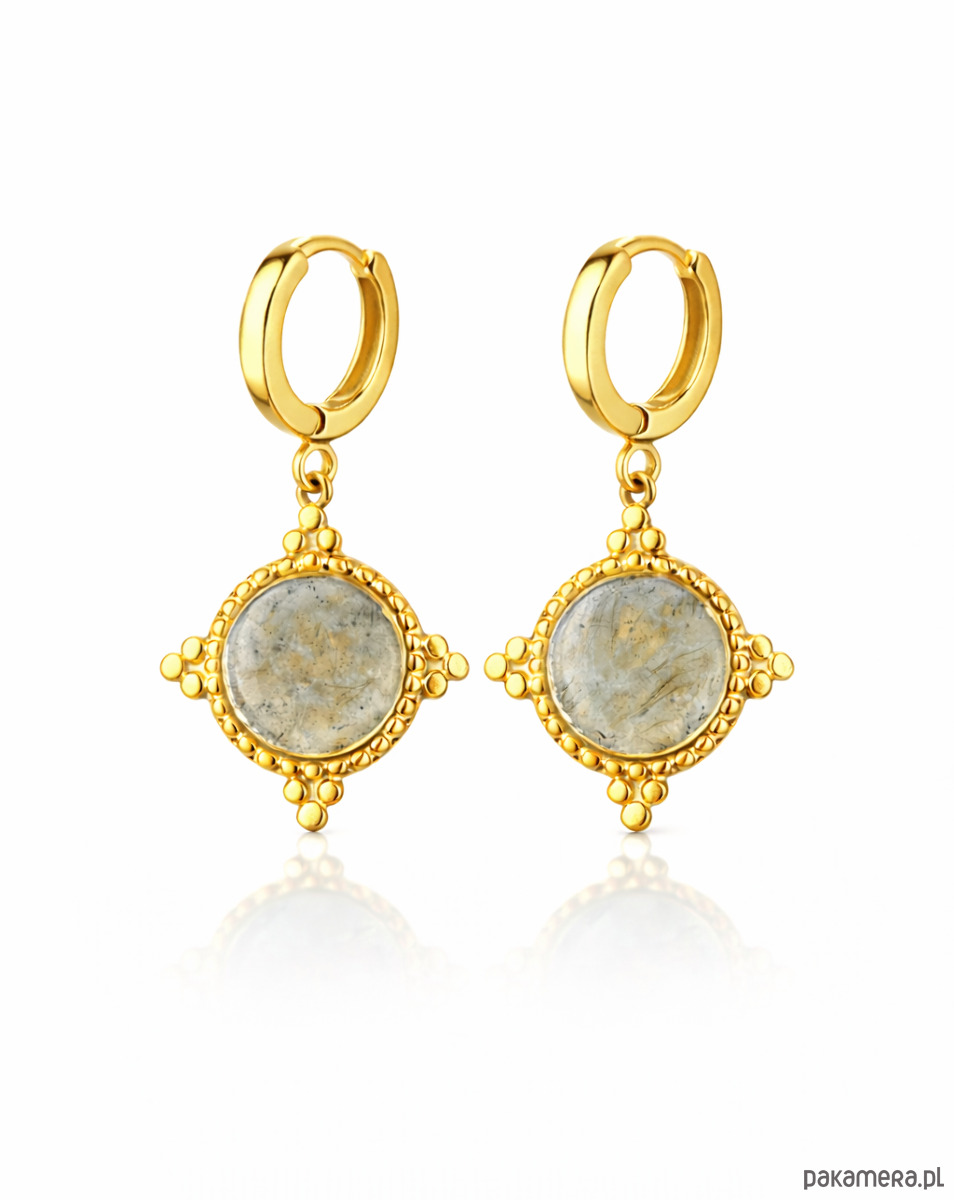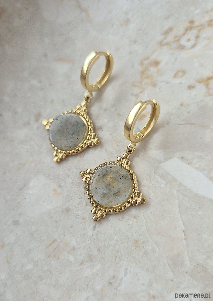 Kolczyki wykonane ręcznie, ze srebra próby 925 pokrytego 24K złotem oraz zawieszki ze stali chirurgicznej i labradorytu. Dostępne także w wersji ze srebra 925.