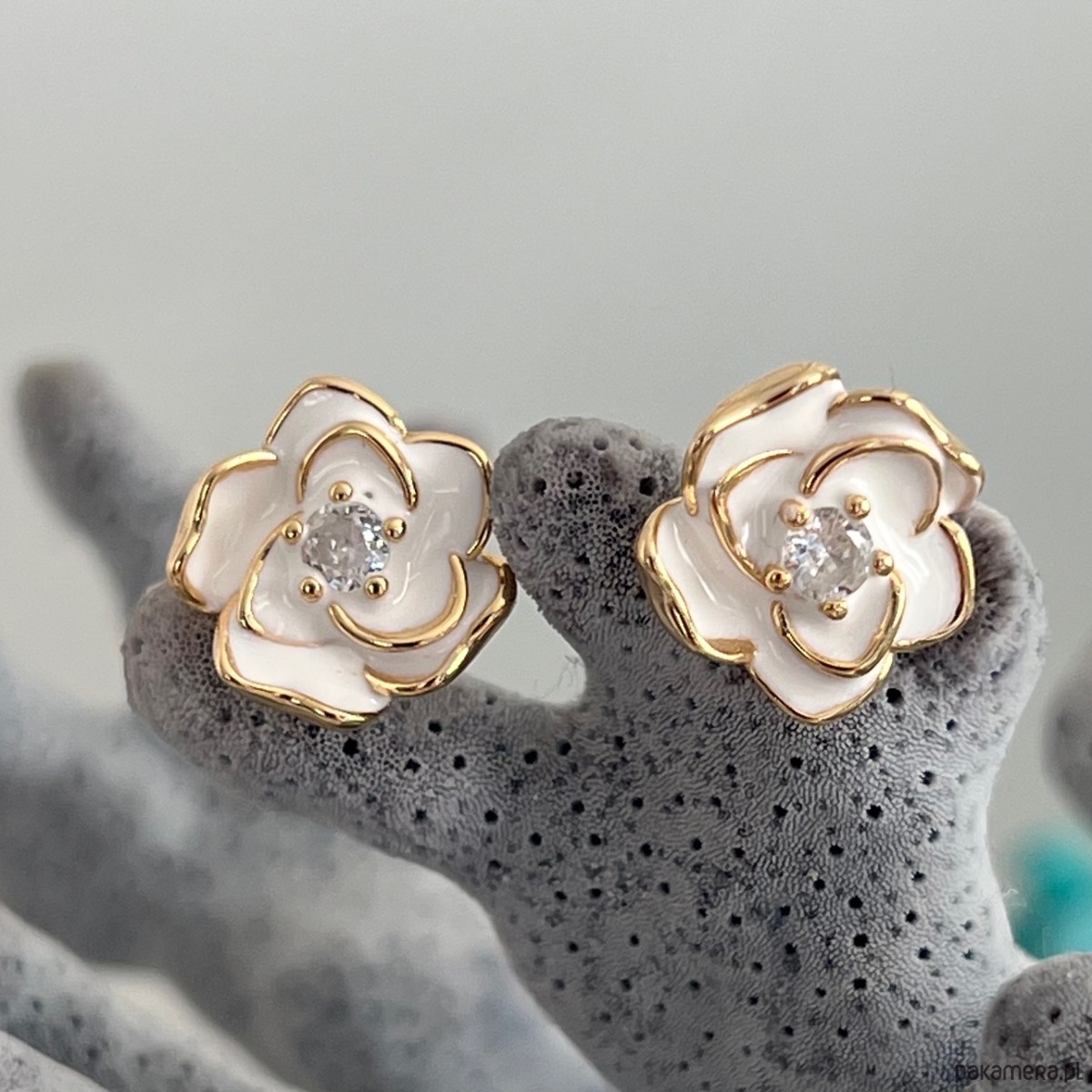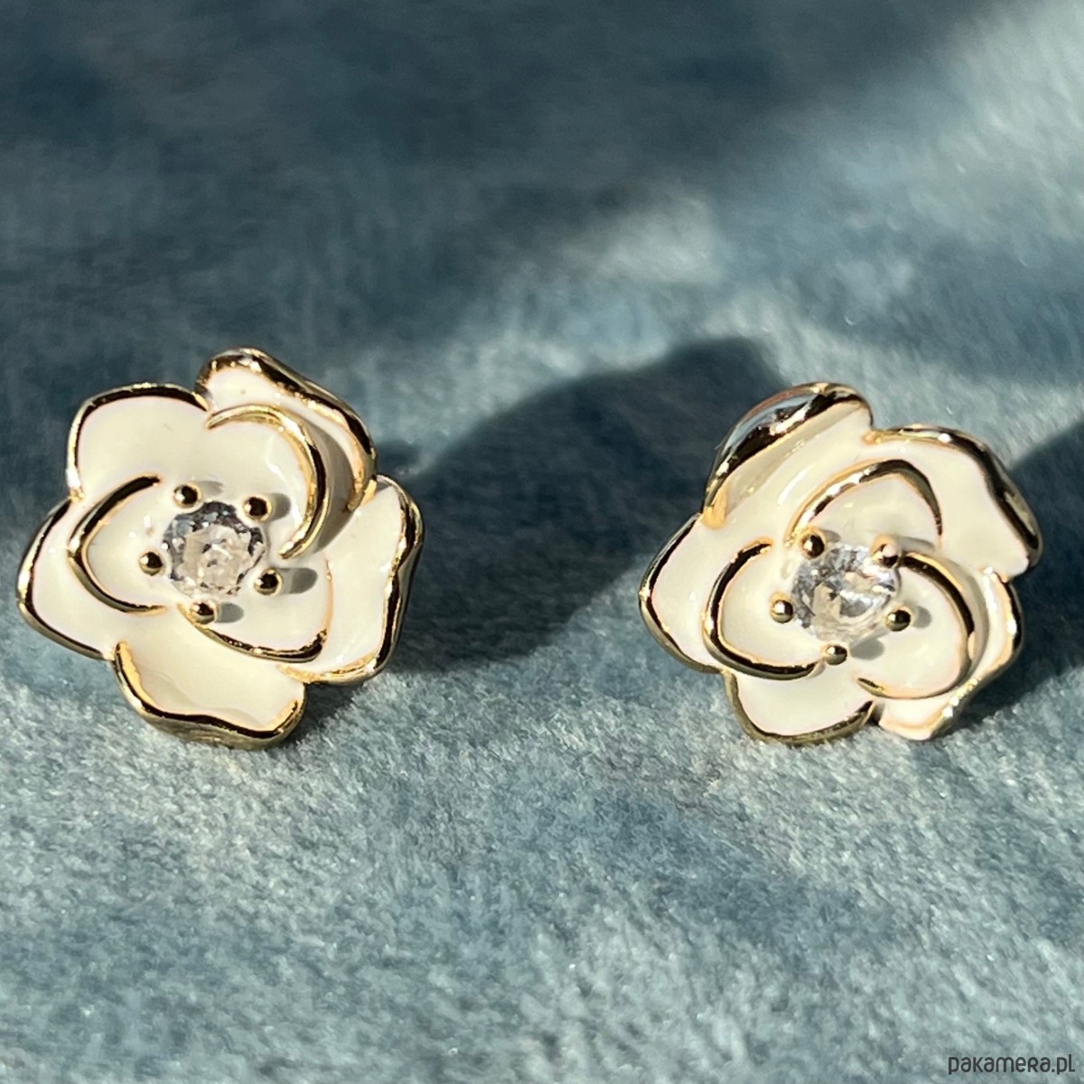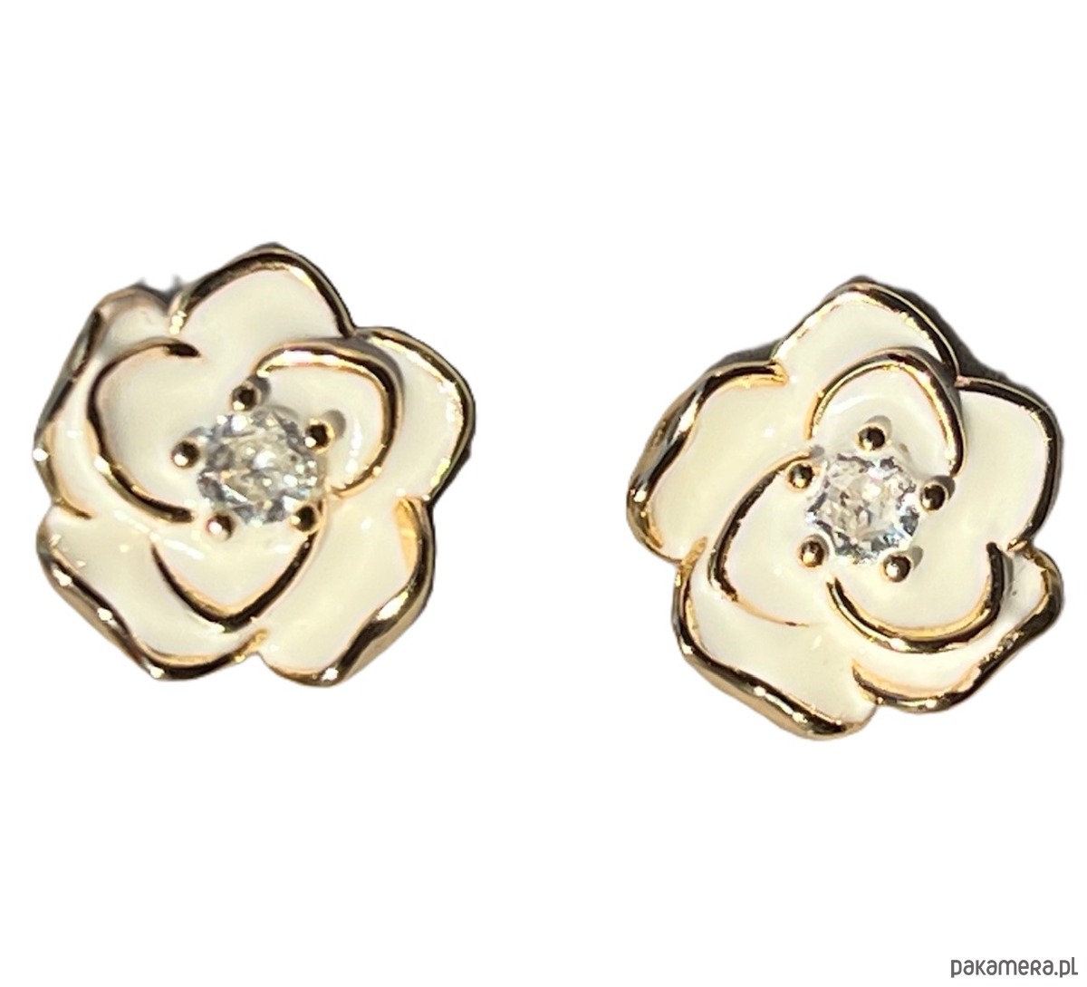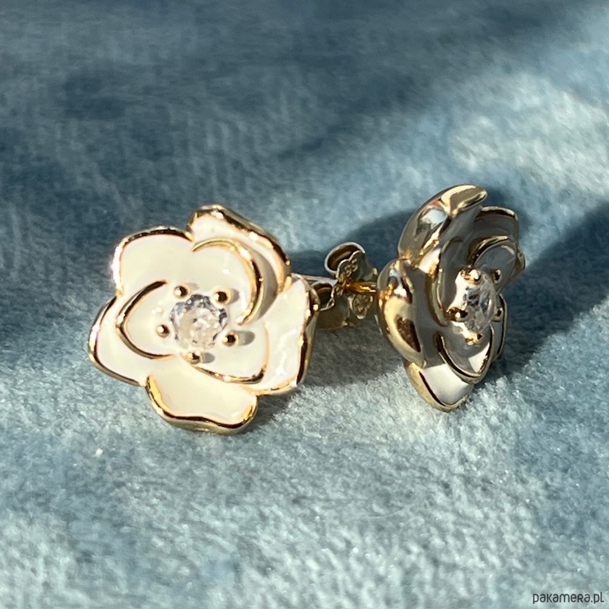 Kolczyki róża kwiat kwiatek z emalią i cyrkonią srebro 925 pozłacane