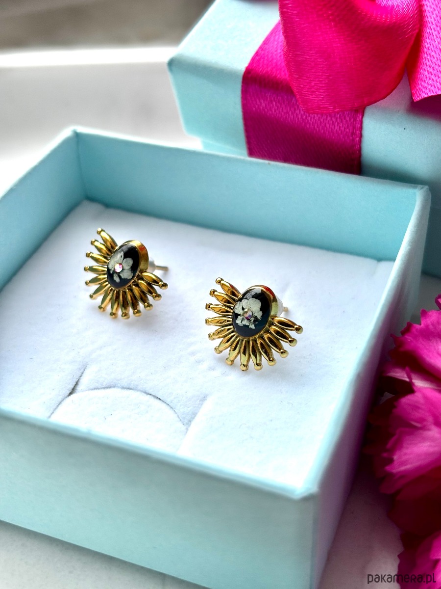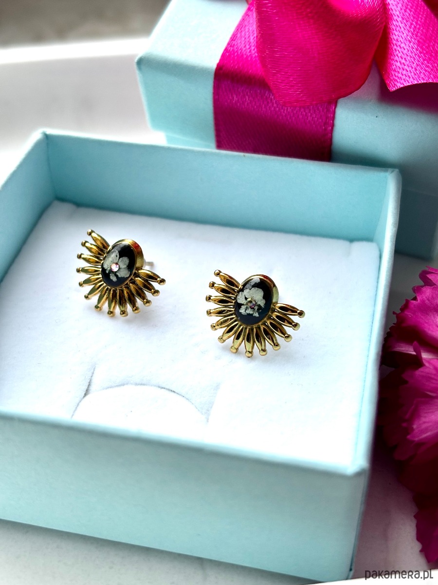 Ręcznie wykonane kolczyki z zawieszkami w kształcie rozety. Biżuteria wykonana jest z wyselekcjonowanych płatków kwiatu dzikiej marchwi i cyrkonii. Kolczyki pięknie prezentują się na uchu, są efektowne i wyjątkowo lekkie co stanowi komfort noszenia.