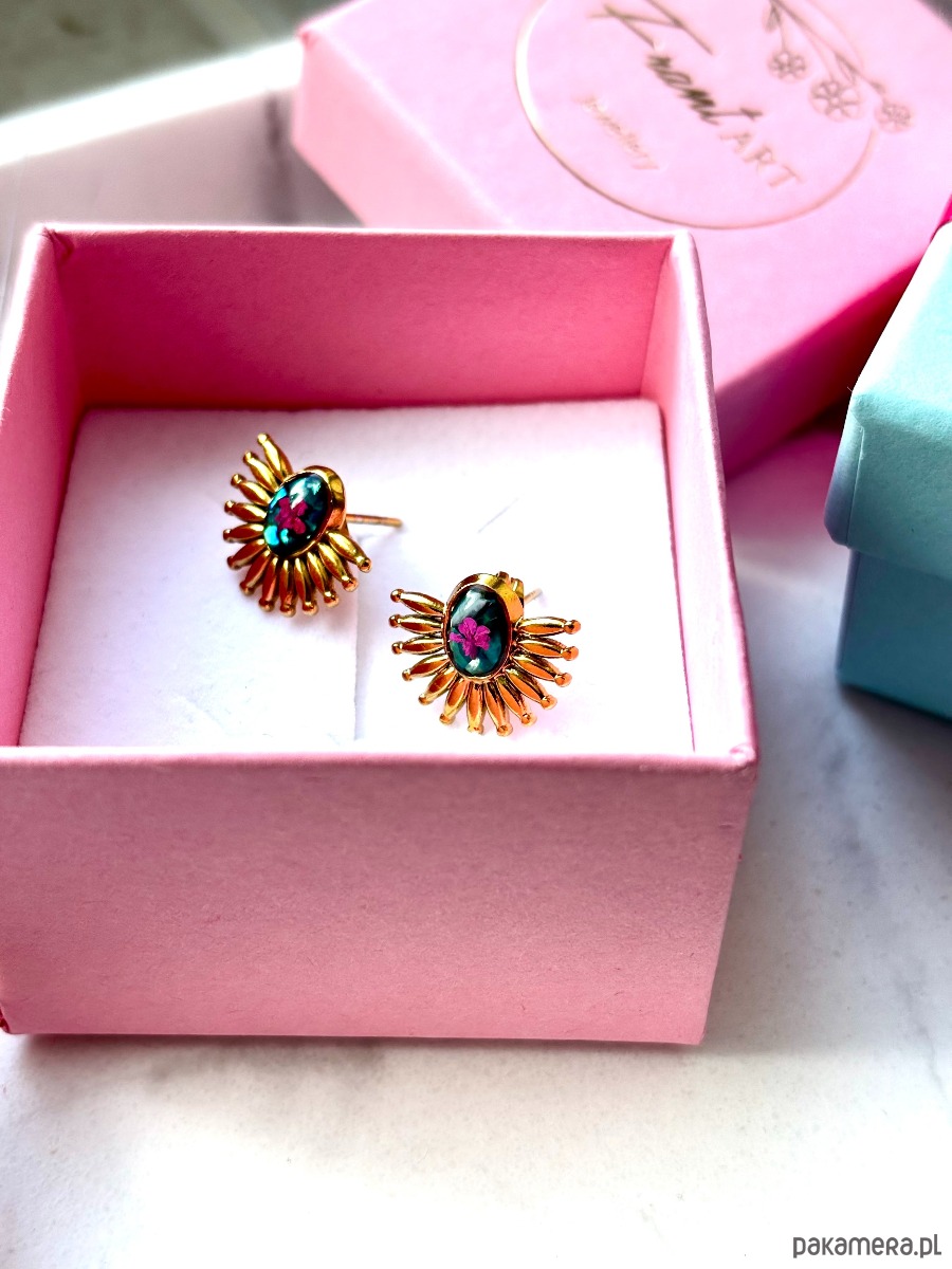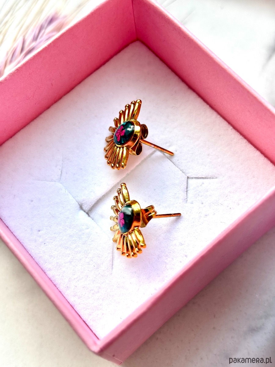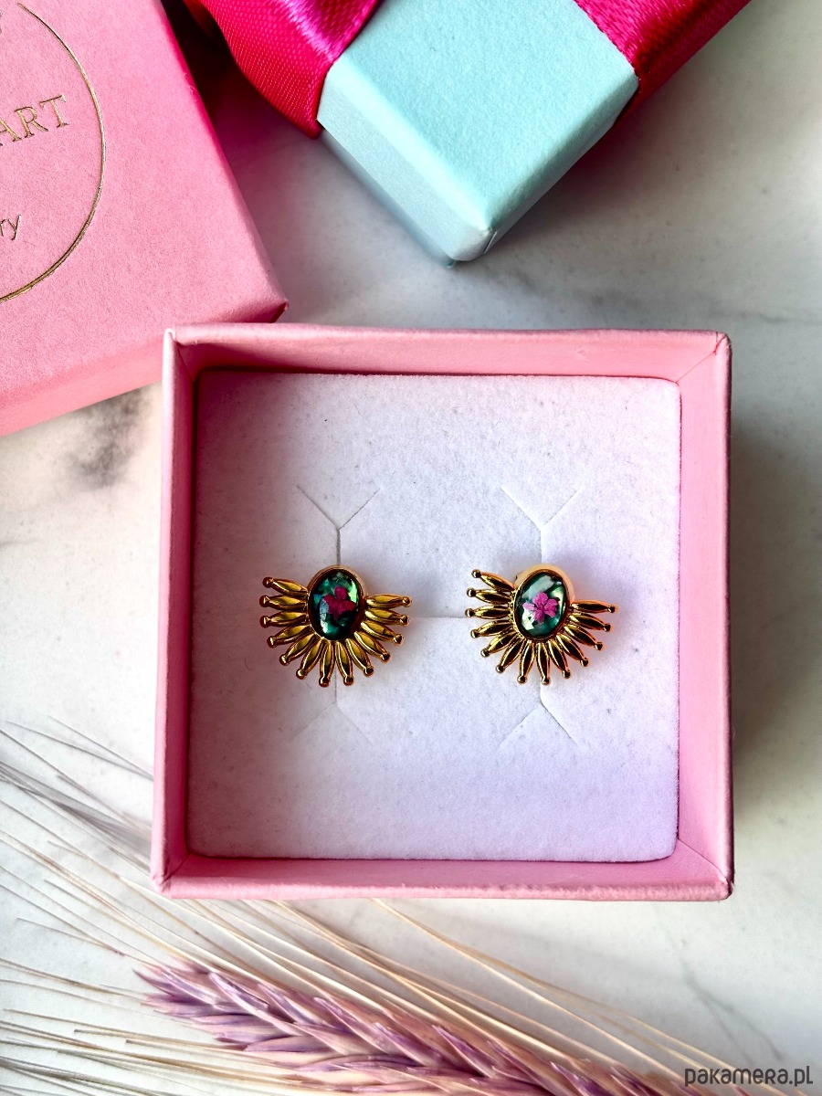 Te wyjątkowe kolczyki z prawdziwymi kwiatami to połączenie natury, sztuki i kobiecej elegancji. W centralnej części znajduje się kompozycja z ręcznie suszonych, różowych kwiatów zatopionych w przejrzystej żywicy jubilerskiej. Otaczająca je złota forma inspirowana promieniami słońca nadaje całości efektu subtelnego glamour w stylu boho.
