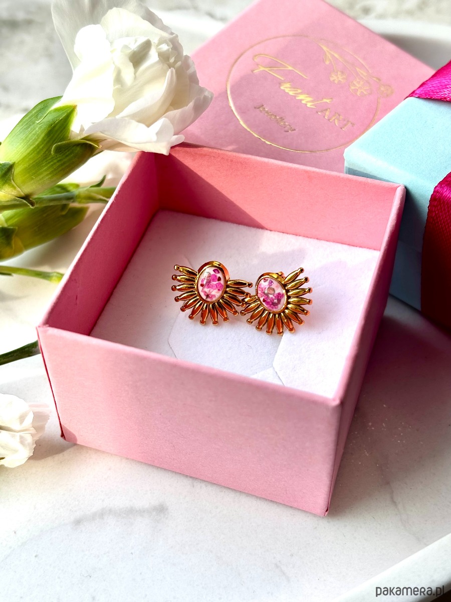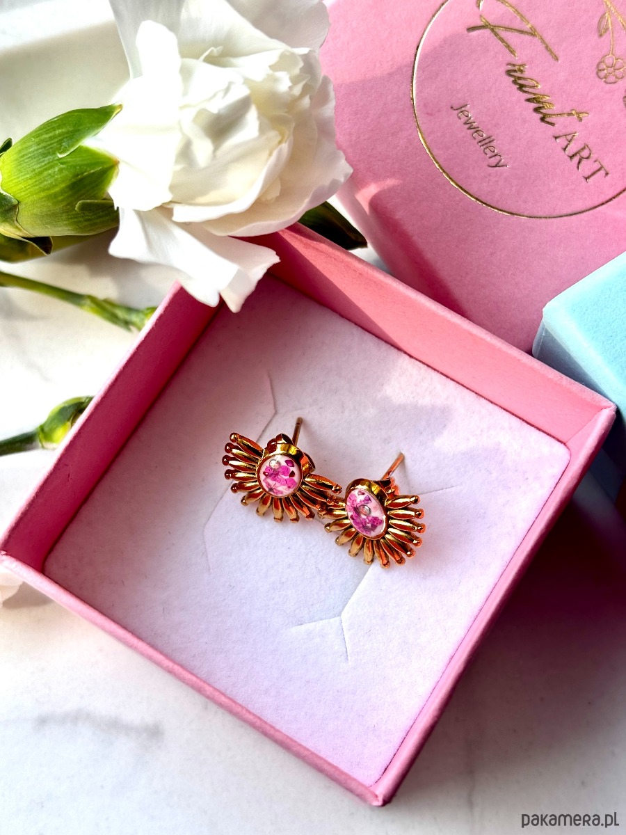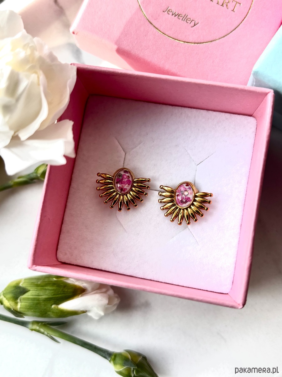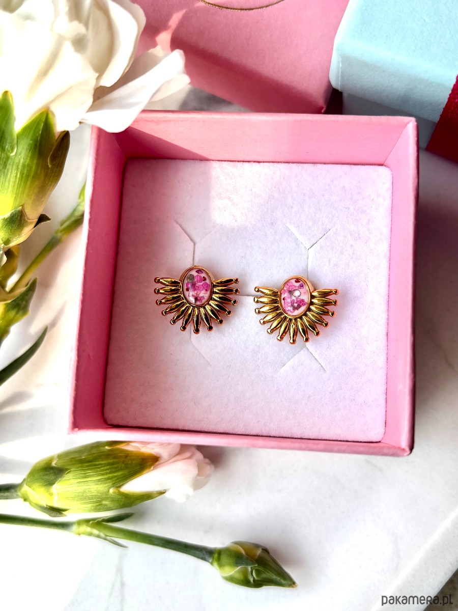 Wyjątkowe kolczyki z prawdziwymi kwiatami to elegancka biżuteria handmade, w której zatopione zostały ręcznie suszone różowe płatki dzikiej marchwi. Złota oprawa inspirowana promieniami słońca dodaje całości wyrazistego, a jednocześnie romantycznego charakteru.