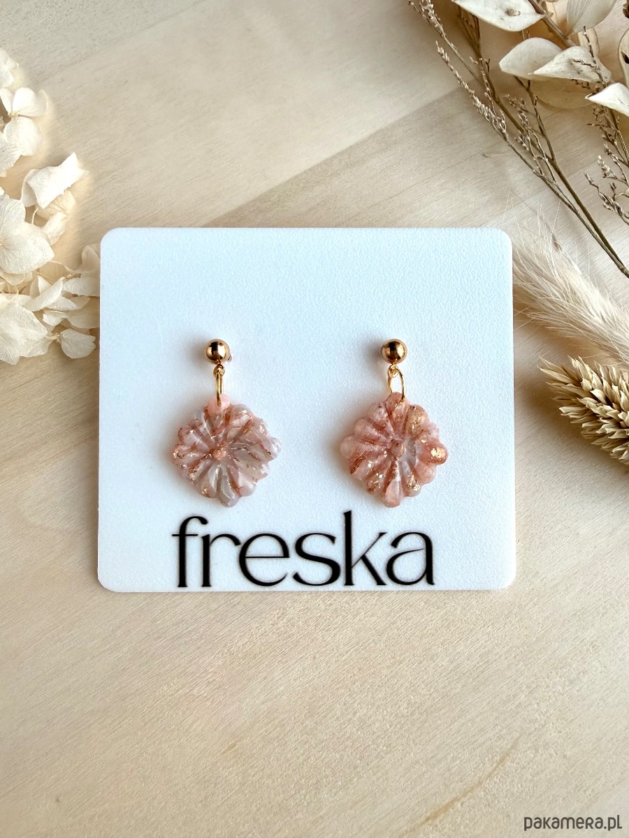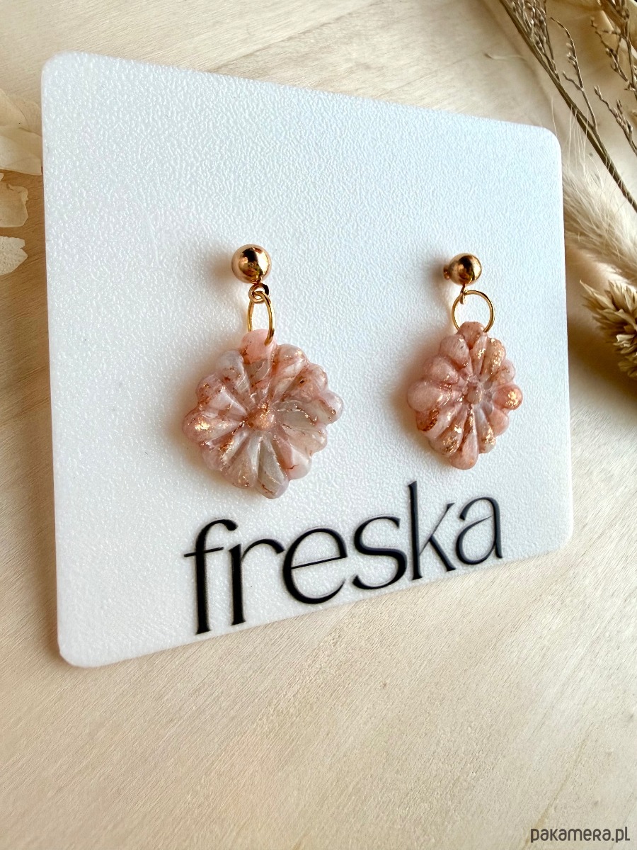 Delikatne, wiszące kolczyki w pastelowym odcieniu brzoskwiniowego różu przypominają maleńkie, rzeźbione kwiaty z połyskiem, który pięknie rozświetla twarz. Złote kulki‑sztyfty dodają im elegancji, dzięki czemu sprawdzą się i na co dzień, i do sukienki na specjalne wyjście.