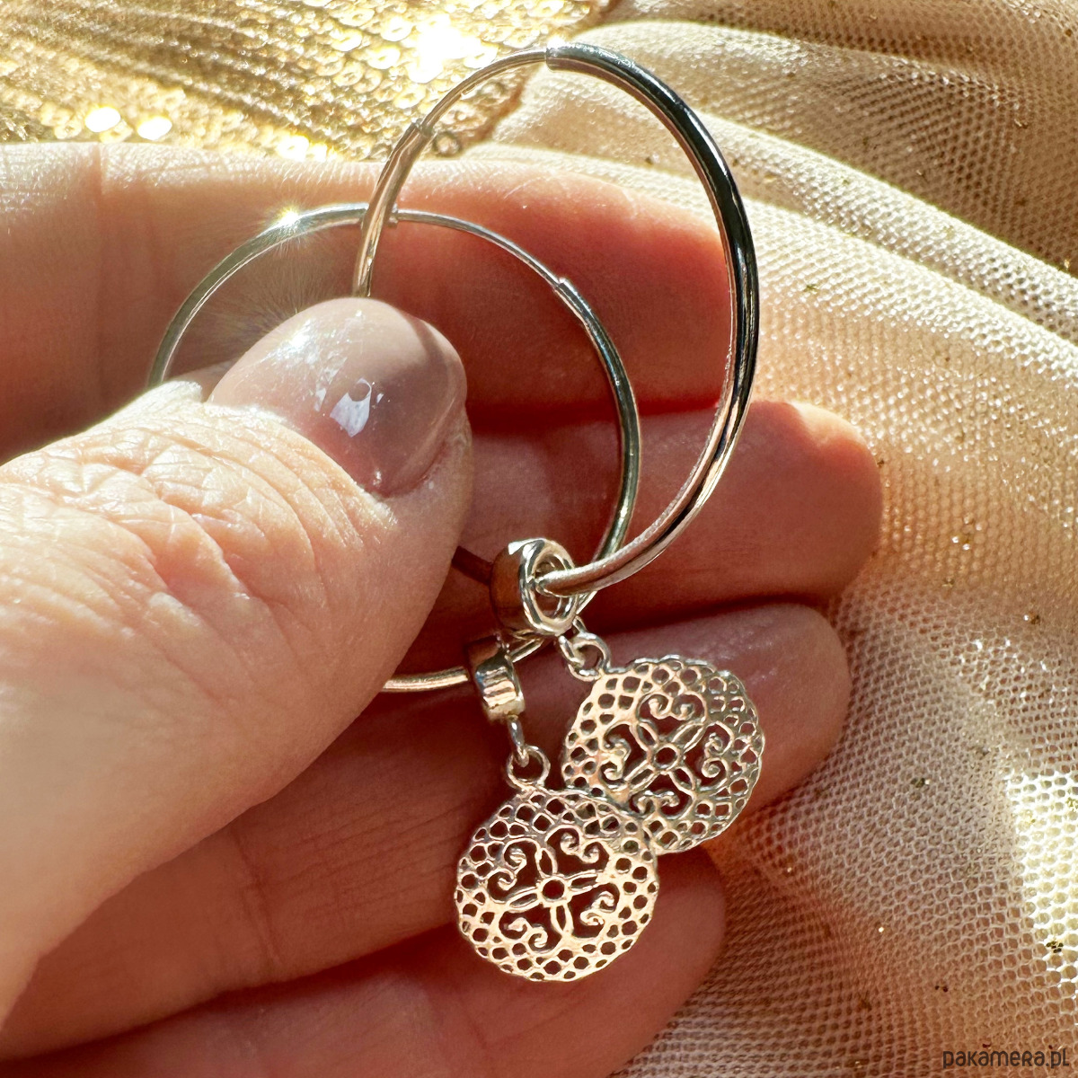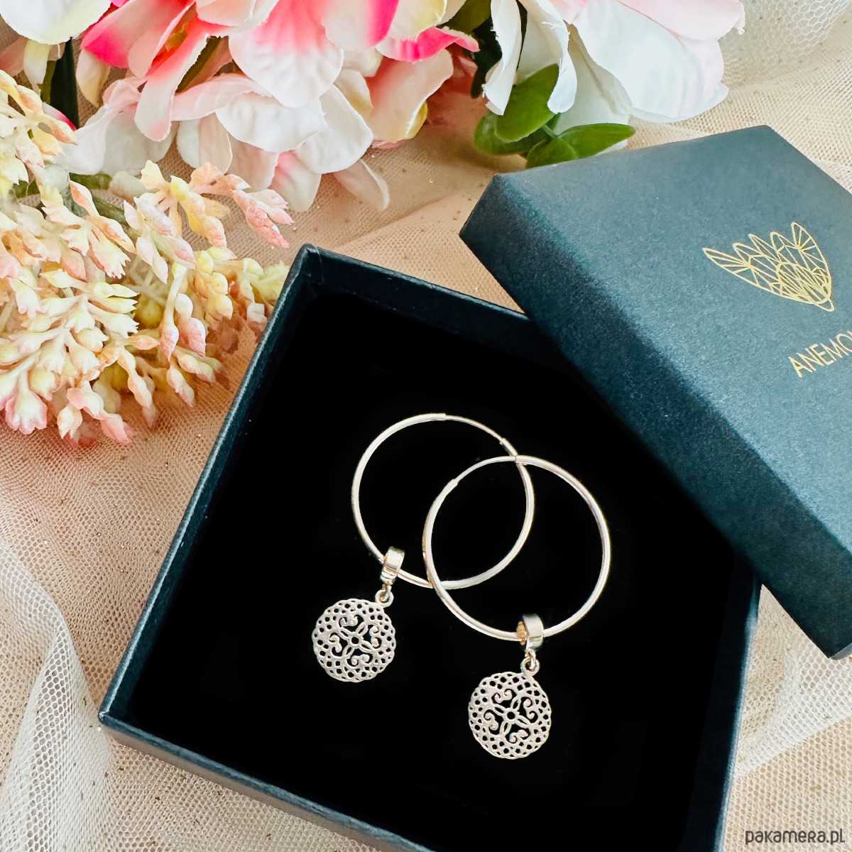 Efektowne kolczyki koła z filigranowymi rozetami . Kolczyki pozwalają na różne stylizacje- z rozetą lub bez, dzięki temu ,że w łatwy sposób można zdjąć zawieszki możemy dowolnie je komponować .