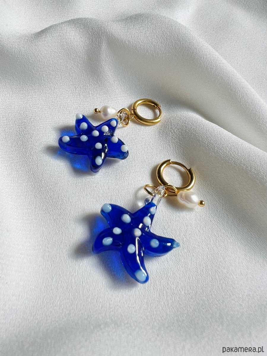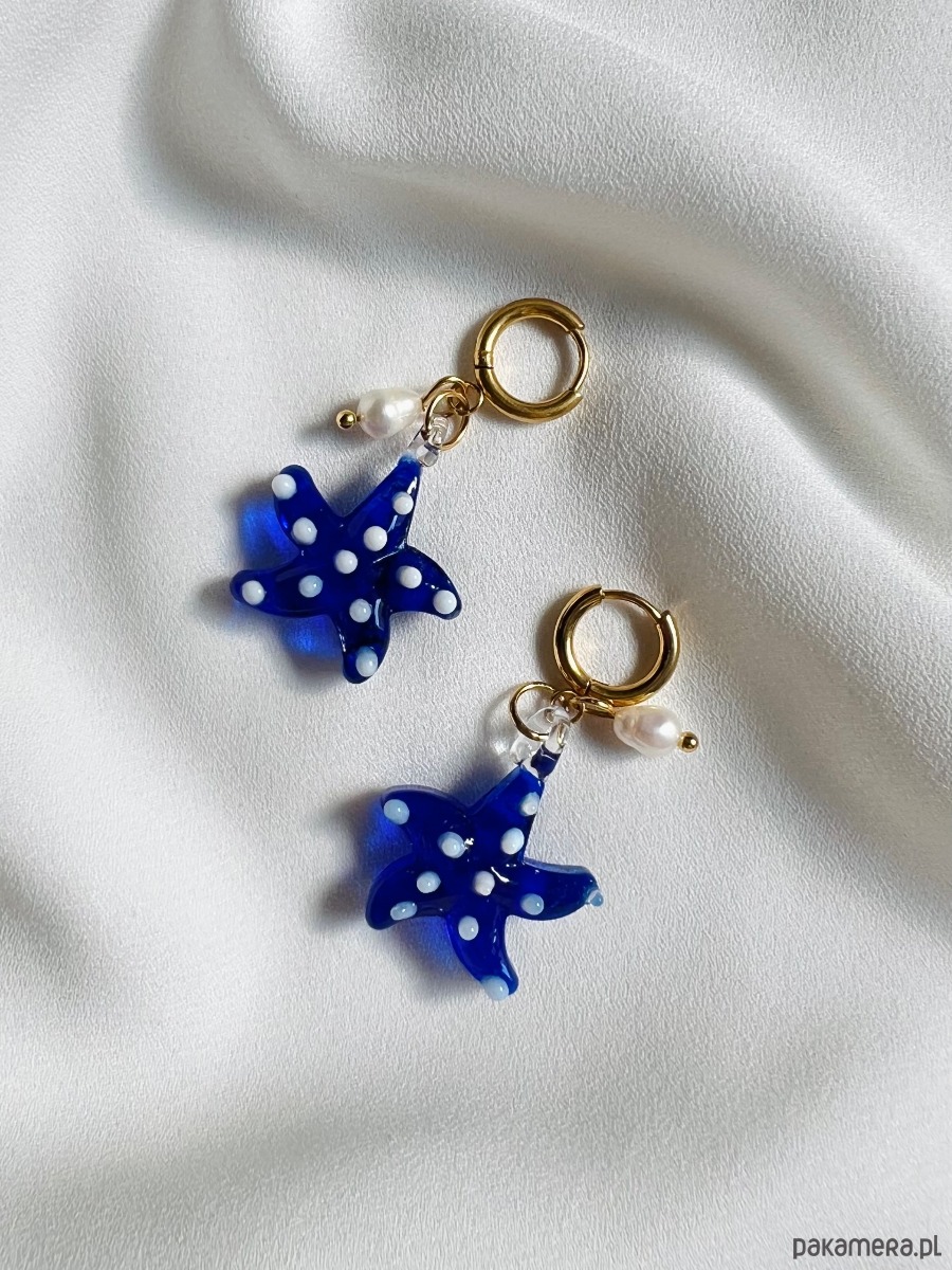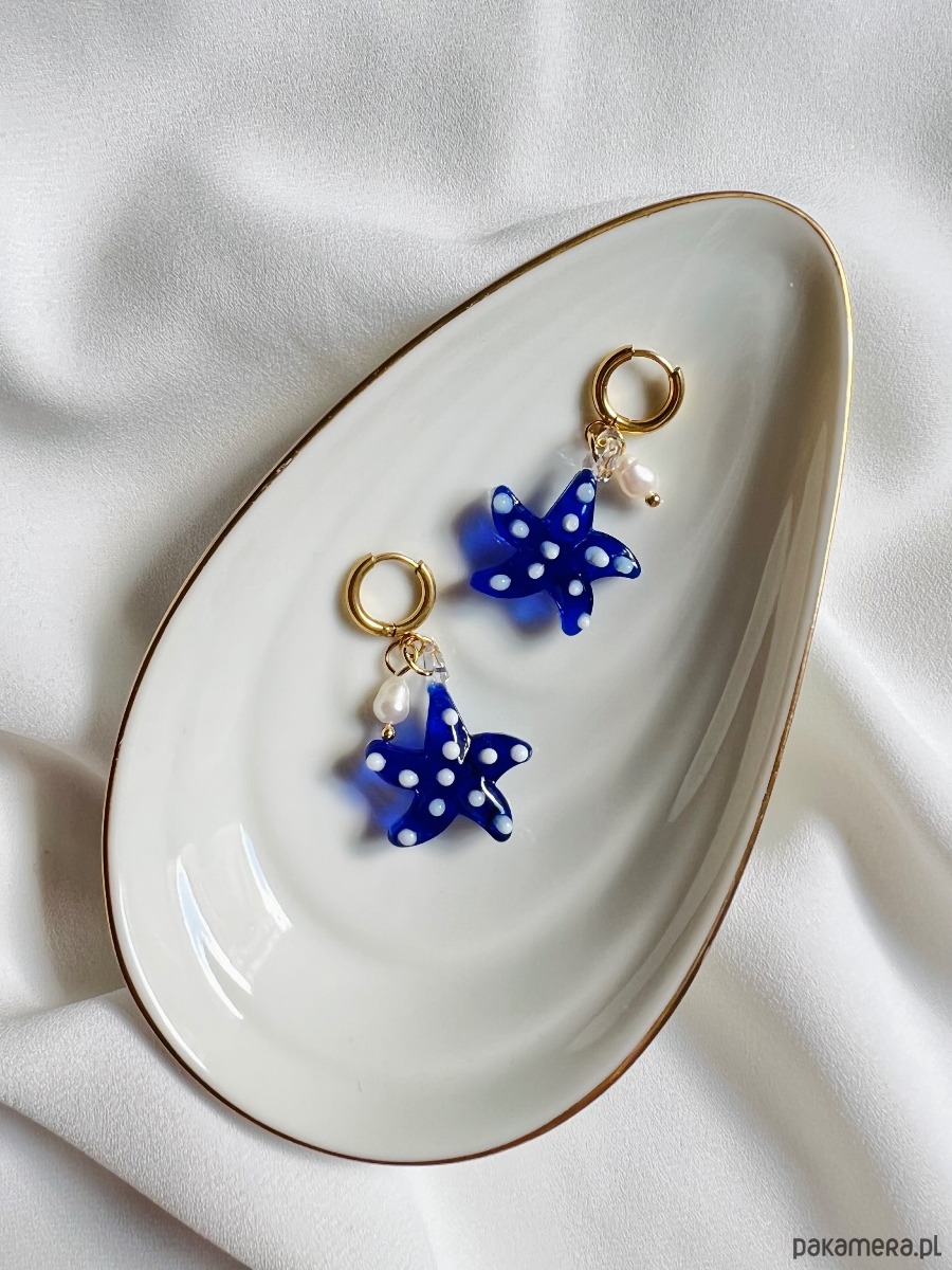 Wyjątkowe kolczyki z morskim akcentem - piękną kobaltową rozgwiazdą ręcznie wykonaną ze szkła, w towarzystwie małej perełki naturalnej hodowlanej.
