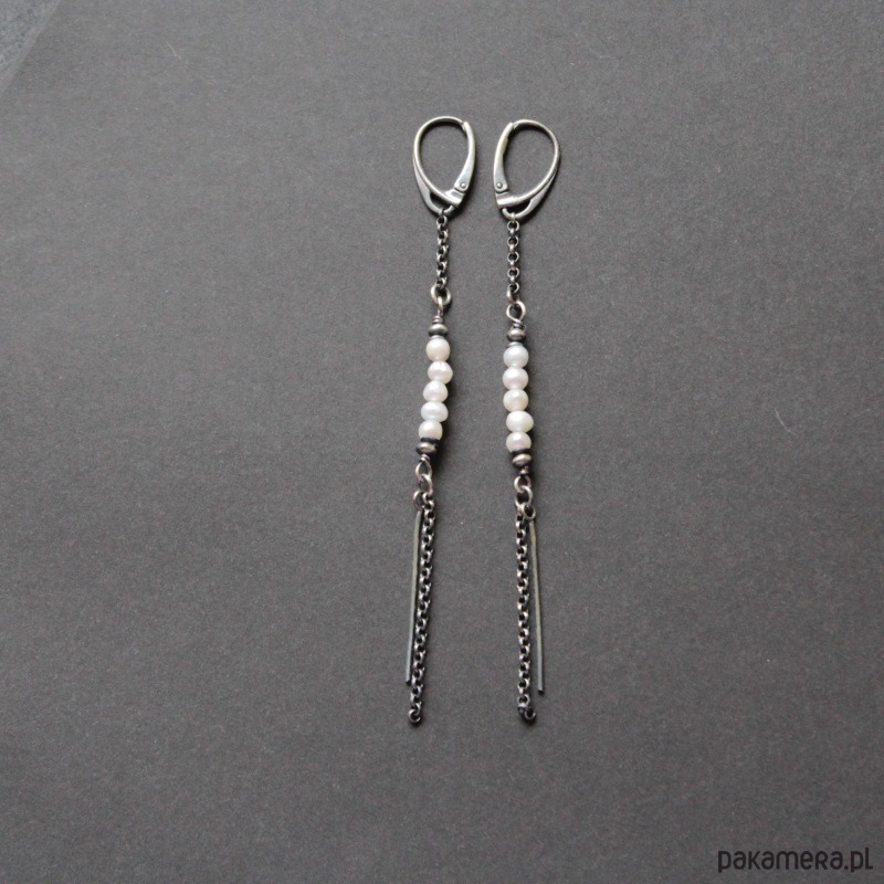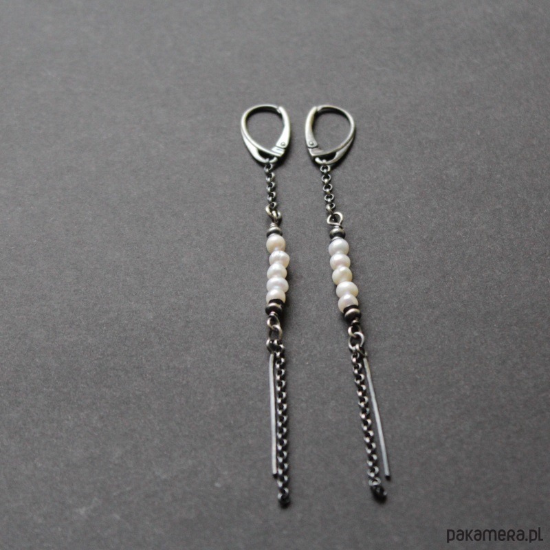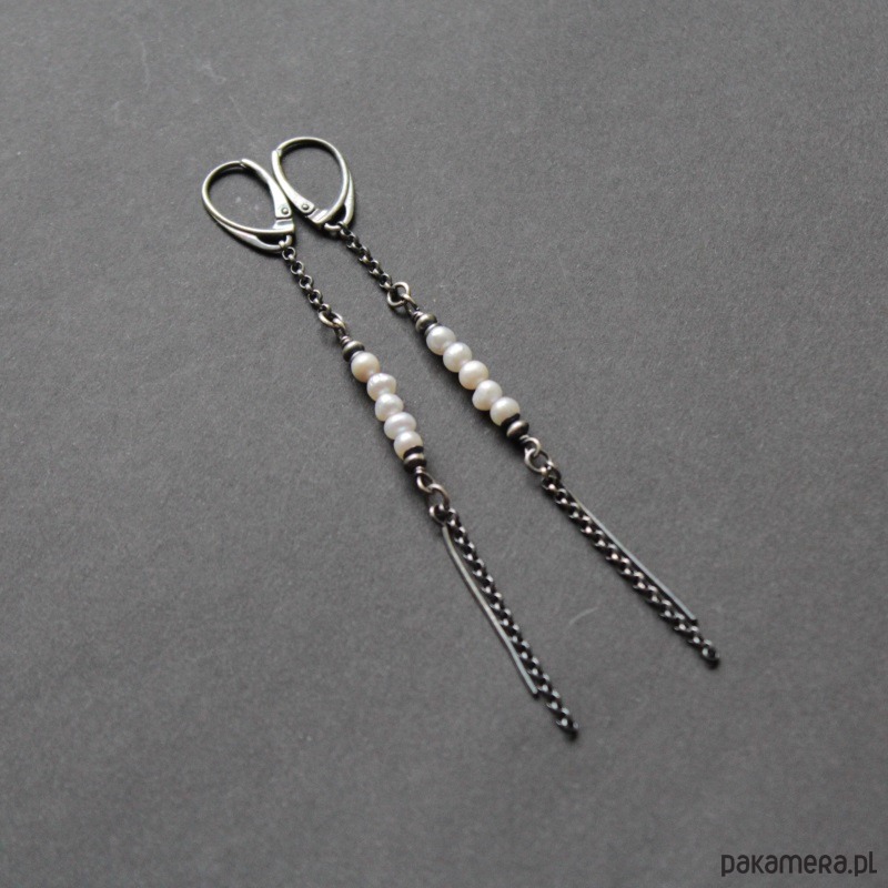 Długie kolczyki wykonane zostały z oksydowanego i ręcznie polerowanego srebra próby 925 oraz holowanych perełek wielkości 0,35 cm