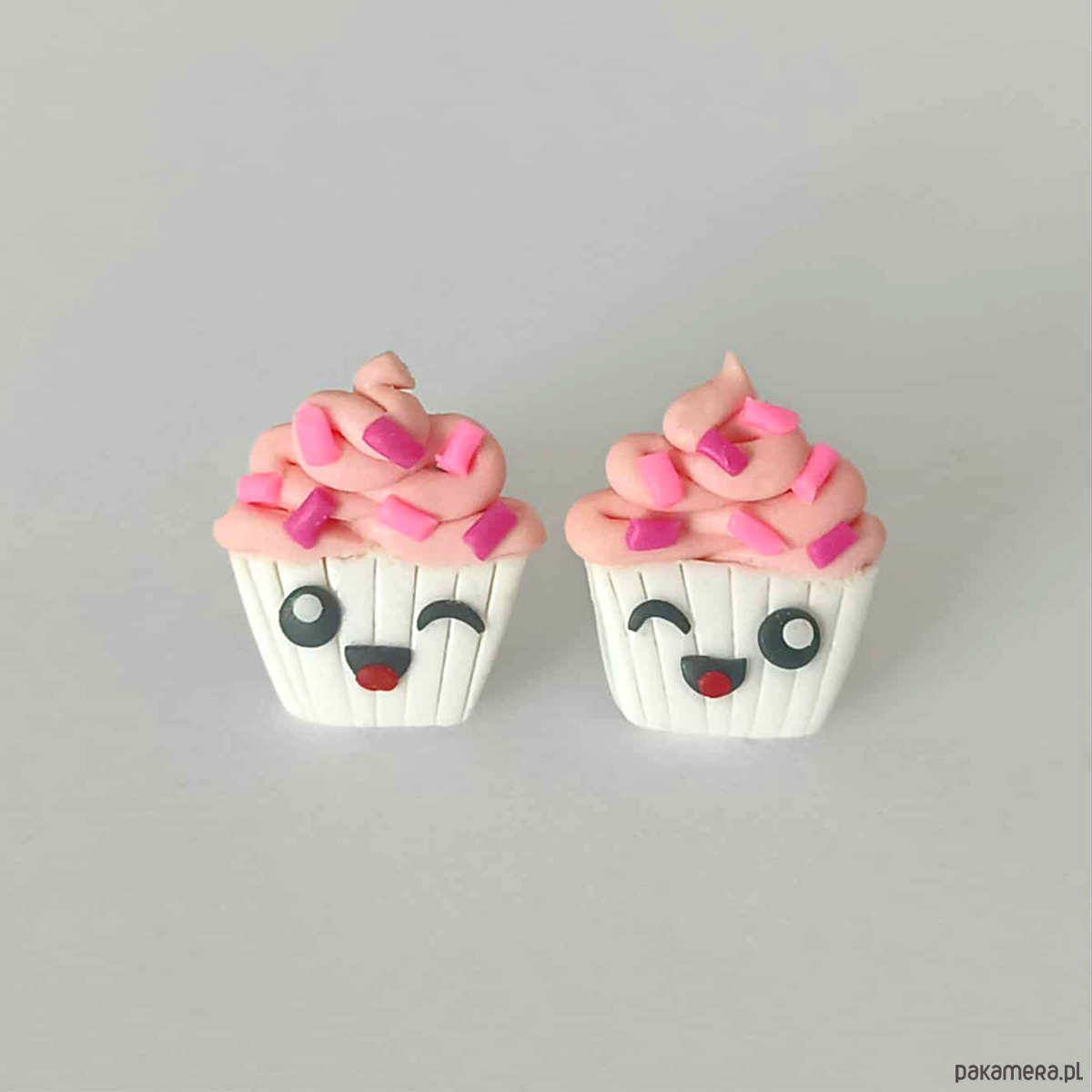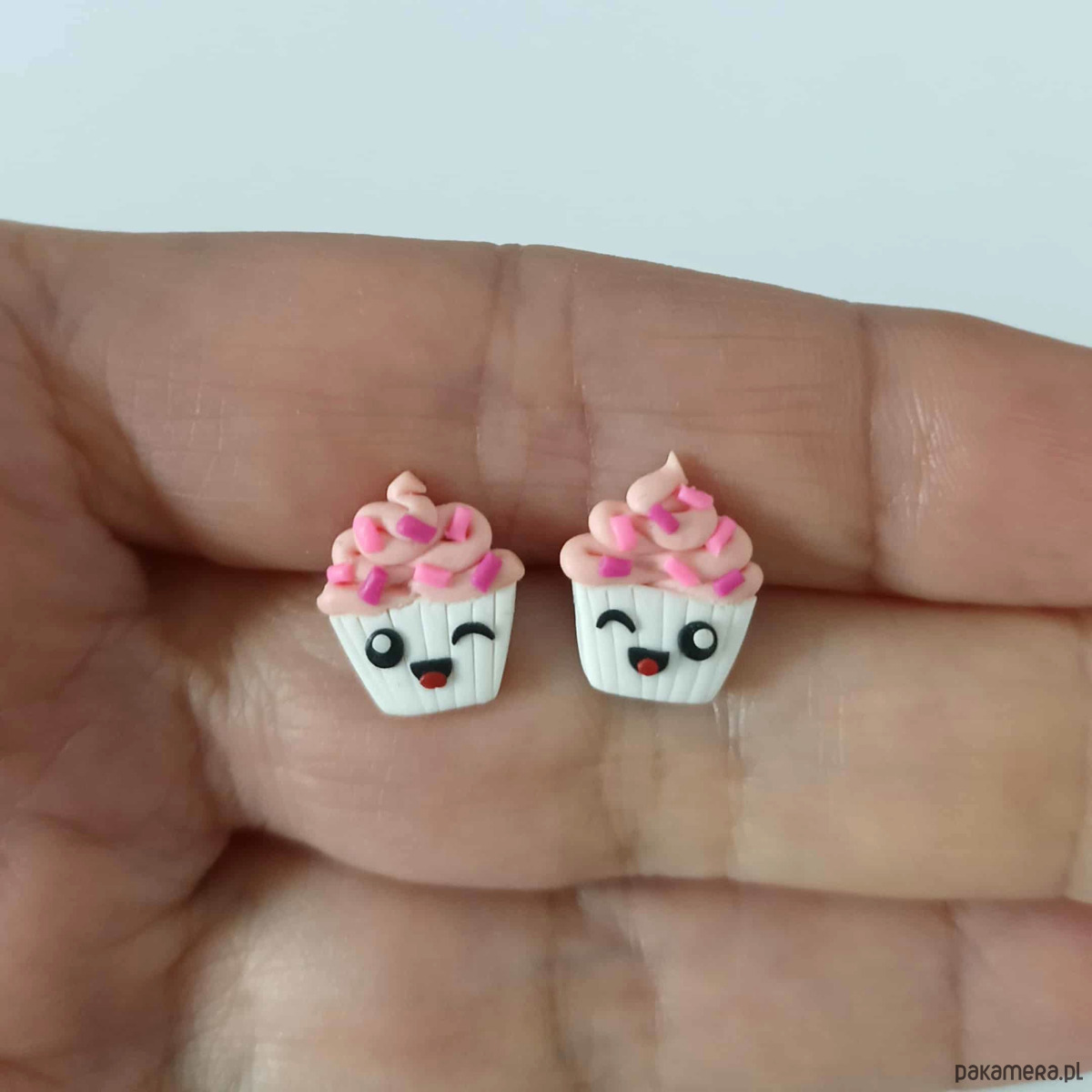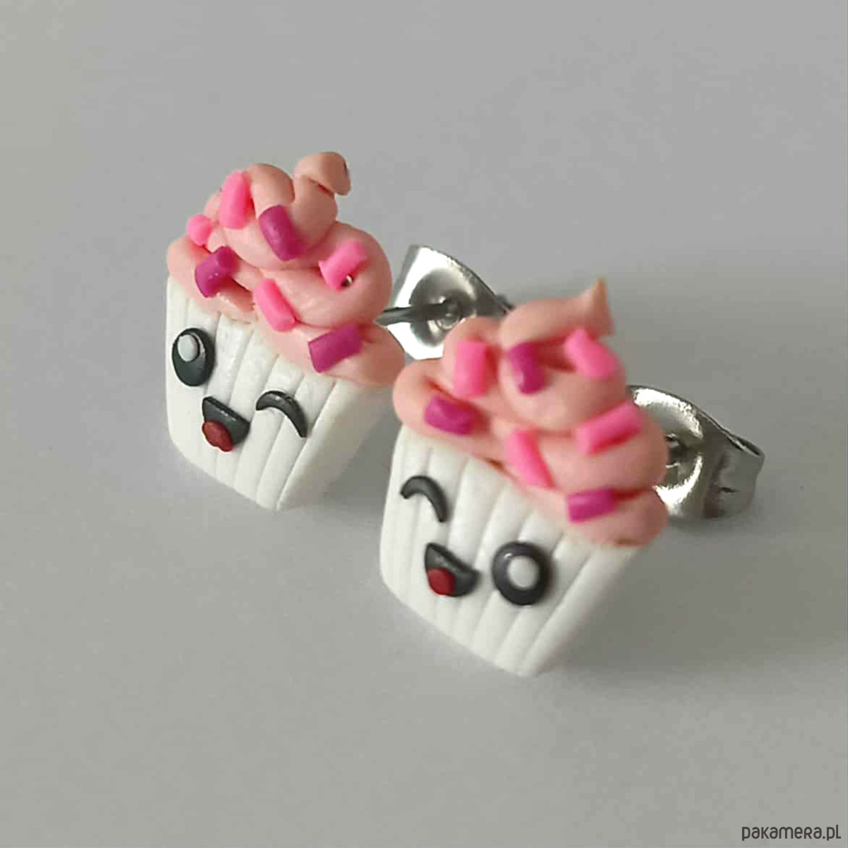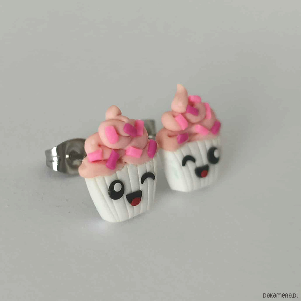 Zabawne kolczyki wykonane ręcznie z masy termoutwardzalnej Fimo w kształcie różowej babeczki. Wielkość kolczyków to ok. 14 mm. Sztyfty wykonane są ze stali chirurgicznej. Kolczyki świetne na prezent.