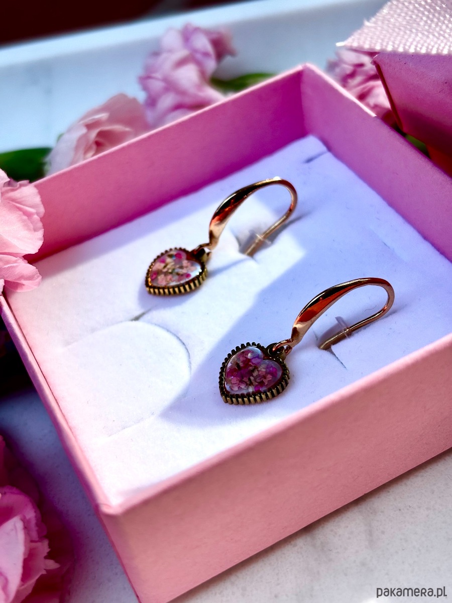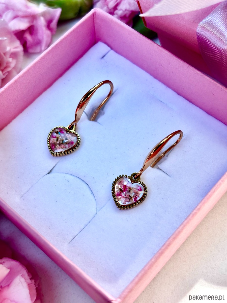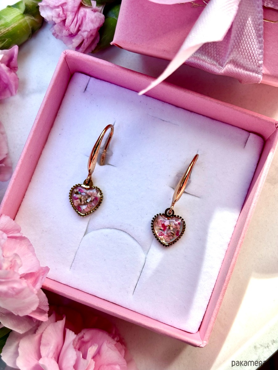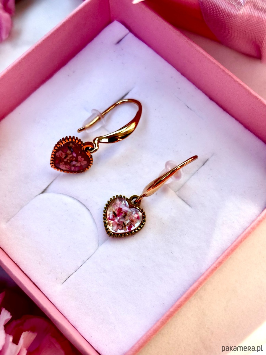 Te ręcznie robione kolczyki z prawdziwymi kwiatami dzikiej marchwi w połączeniu z masą perłową to kwintesencja delikatności natury i elegancji złota. Zawieszki serca subtelnie poruszają się przy każdym ruchu, pięknie odbijając światło. Złocone zapięcia ze stali nierdzewnej nadają całości szlachetnego charakteru i zapewniają wygodę noszenia.
