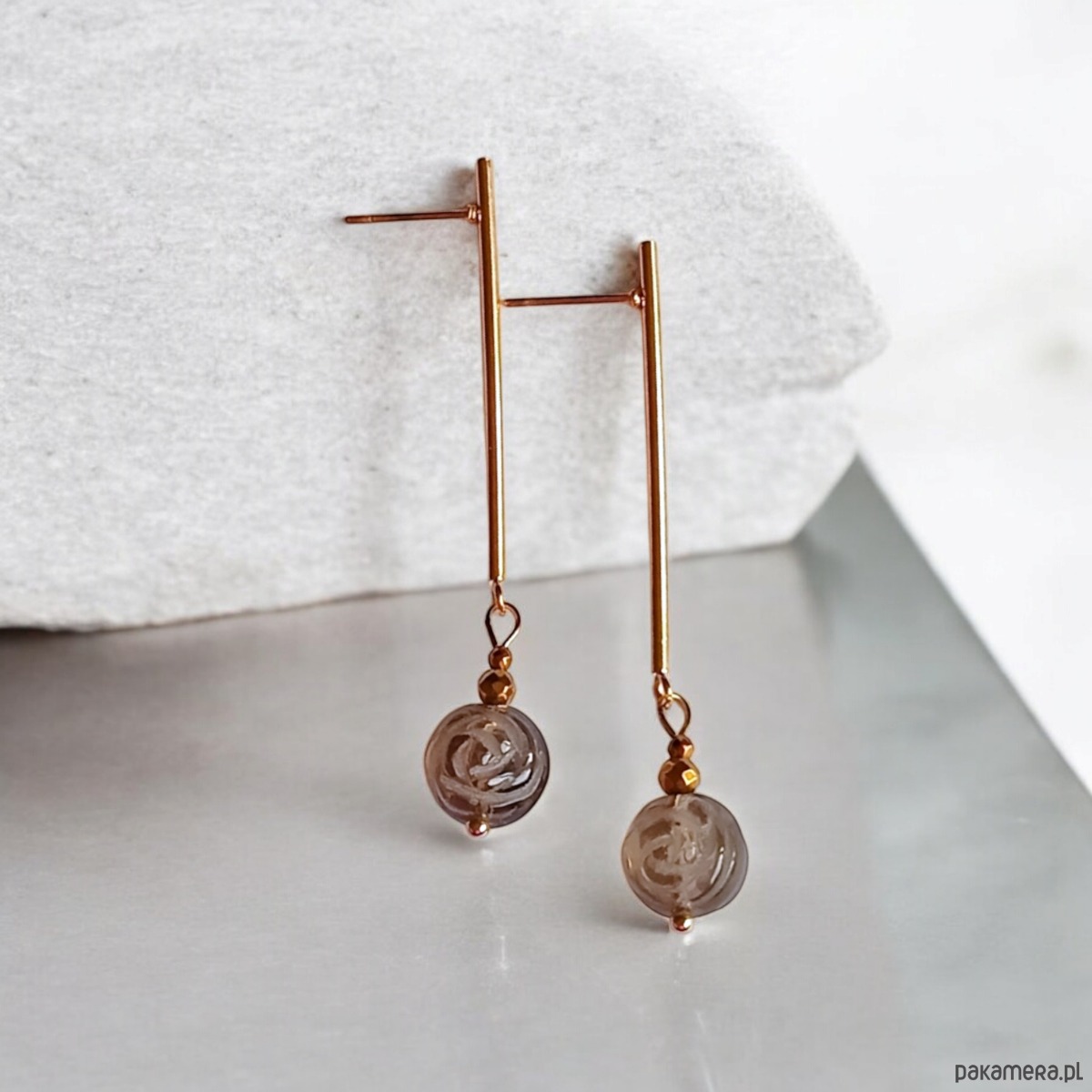 TUTAJ: urocze kolczyki wykonane z rzeźbionych różyczek z kwarcu dymnego ok.10mm oraz przekładek ze złotego hematytu.