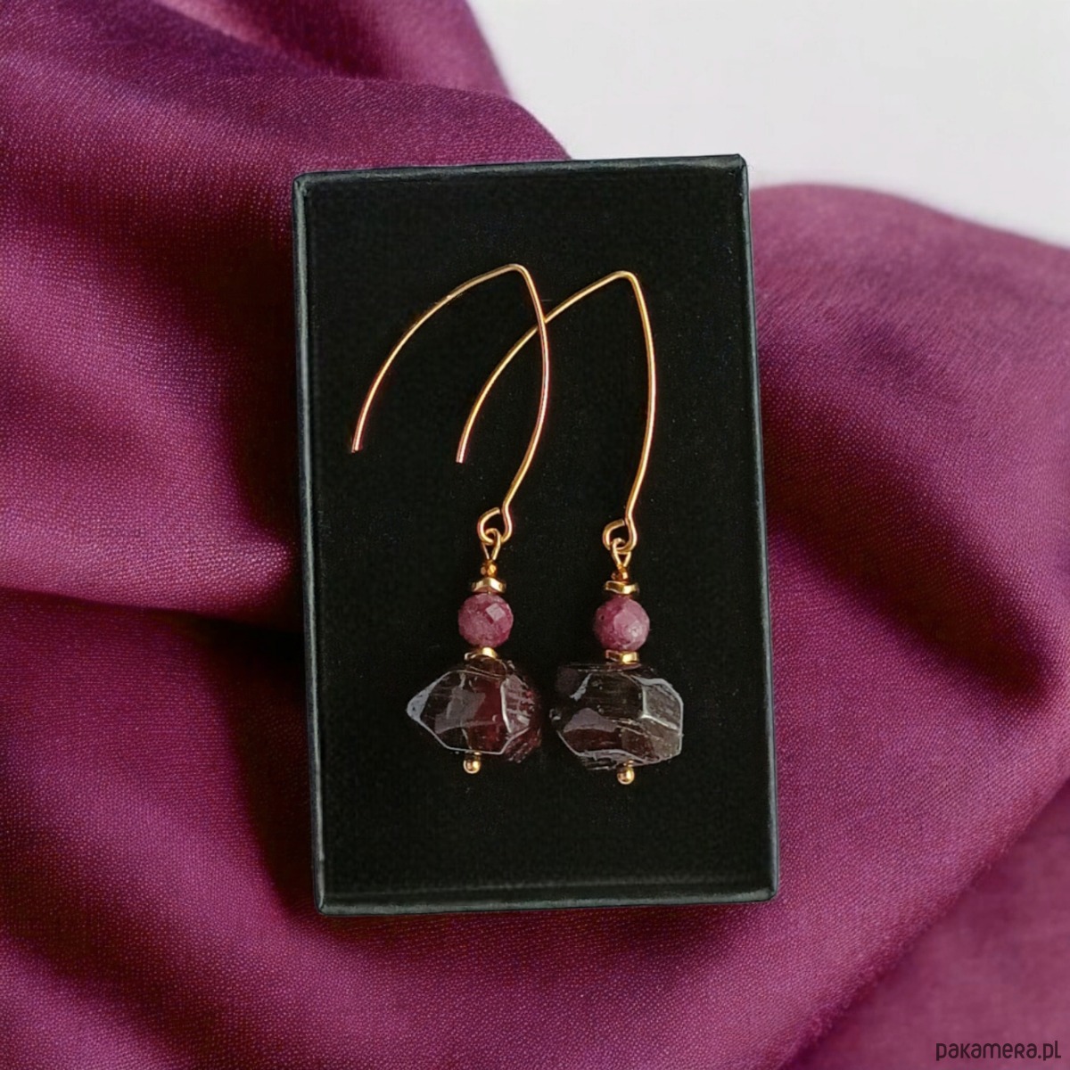 Zjawiskowe kolczyki wykonane z fasetowanych kul naturalnego rubinu (ok. 6mm), nieregularnych, nieidealnych polerowanych bryłek granatu (ok. 13x13x10mm) i przekładek ze złotego hematytu.