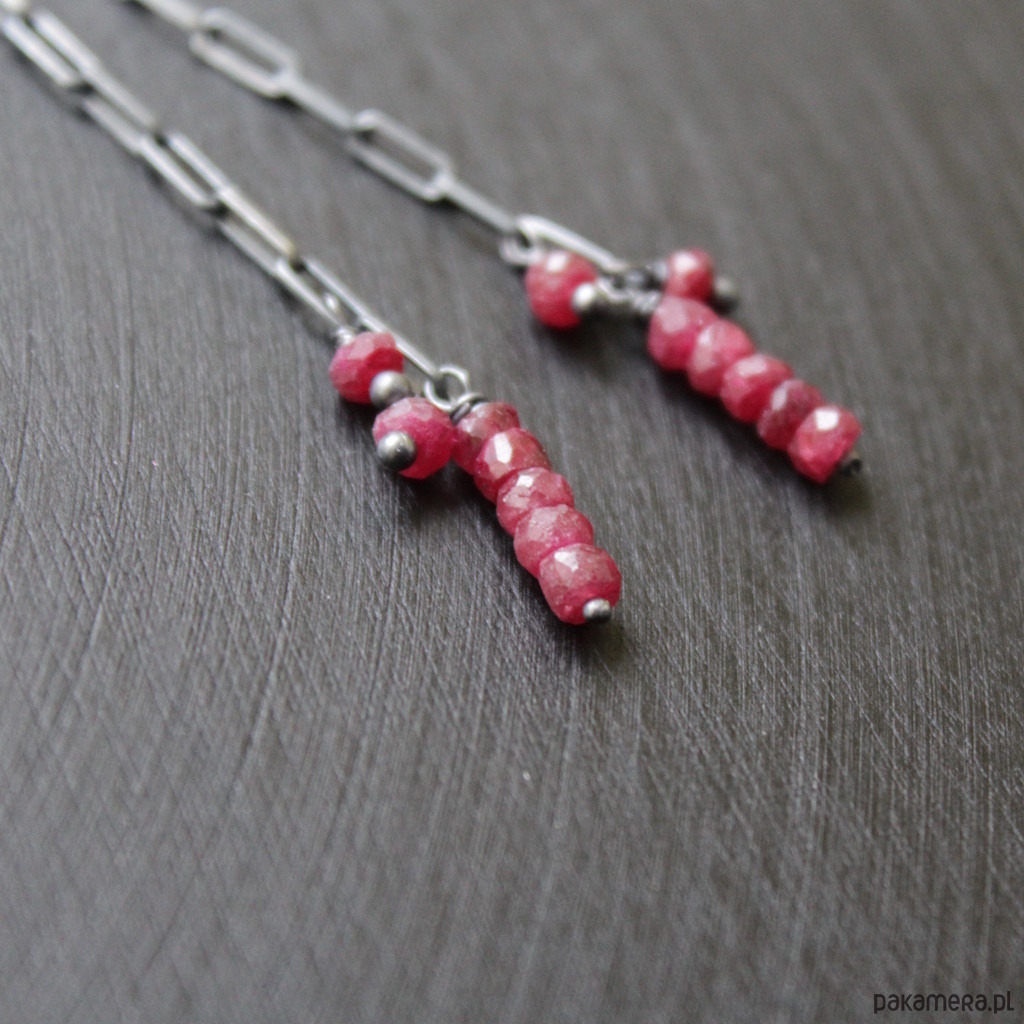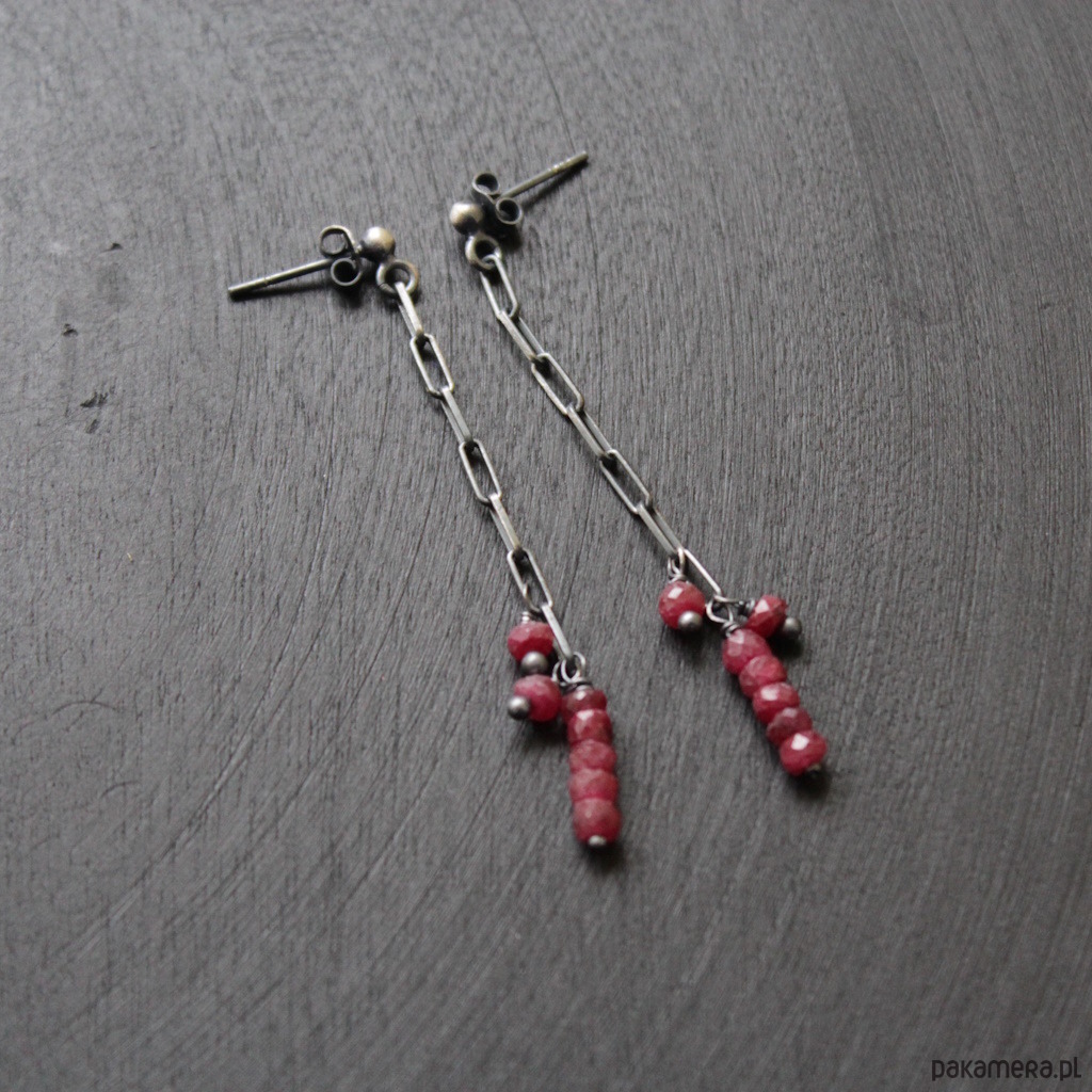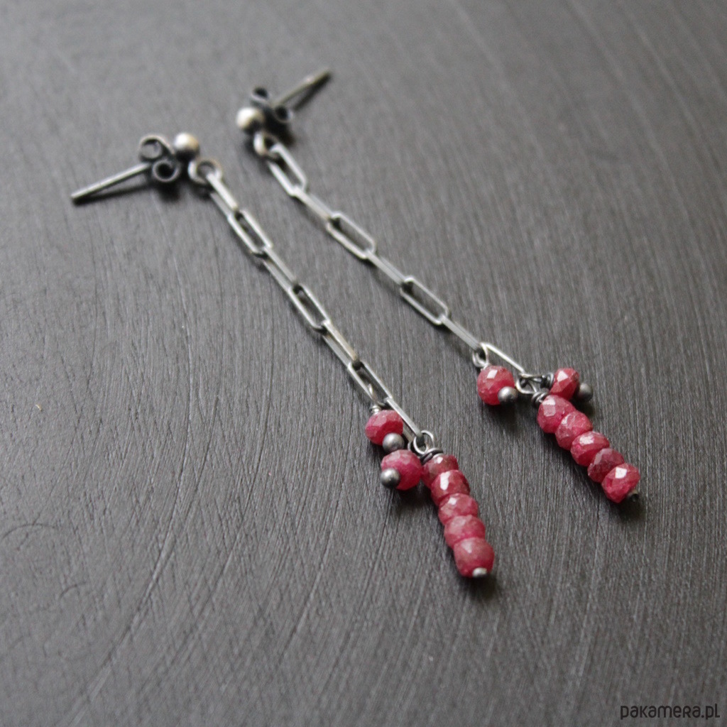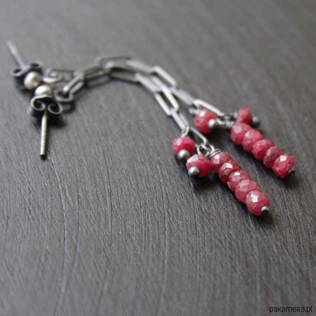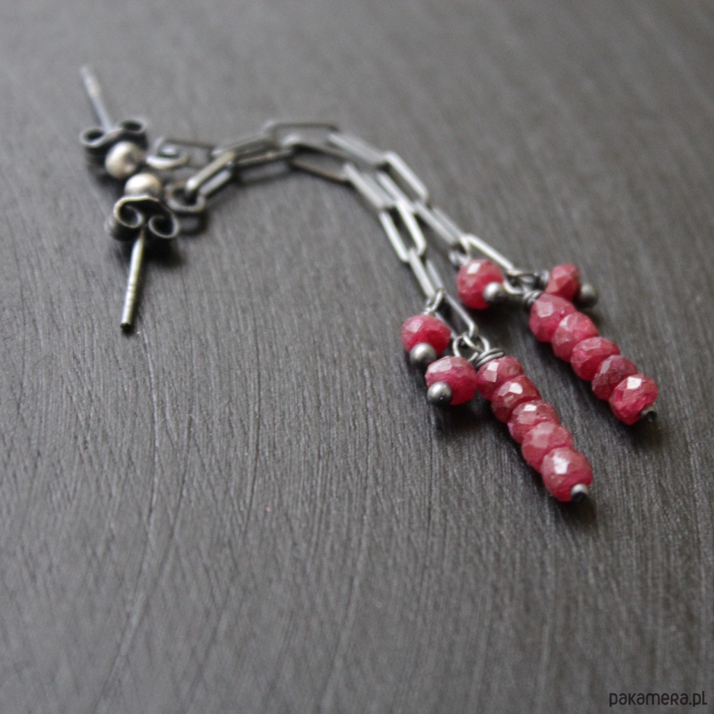 Delikatne kolczyki wykonane zostały z oksydowanego srebra próby 925 oraz fasetowanych oponek rubinów wielkości 0,2-0,3 cm.