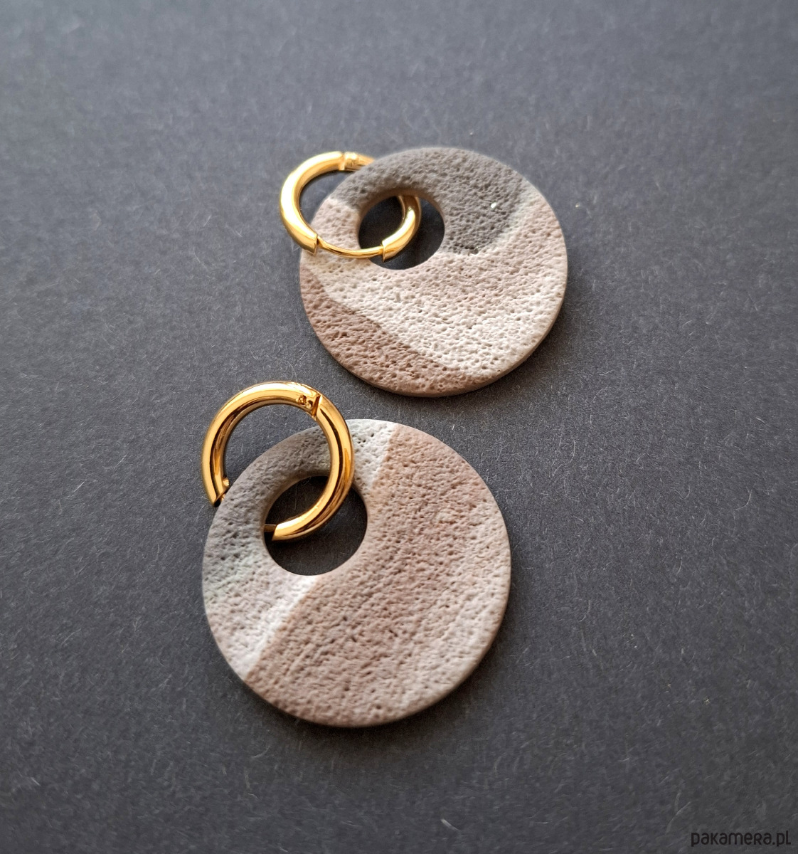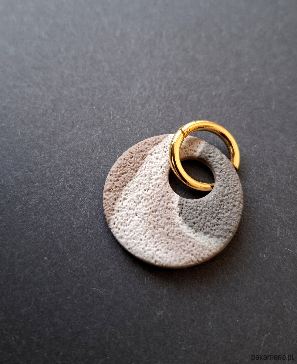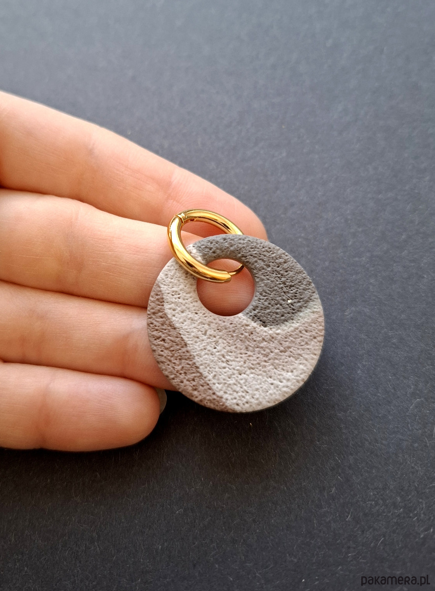 Kolczyki wiszące wykonane z wysokiej jakości glinki polimerowej. Bigle typu kajdanki - z zapięciem na zatrzask, pozłacane i nieuczulające ze stali szlachetnej. Kolczyki jednostronne i lekkie. Wymiary: długość całkowita - 4,1 cm, szerokość 3 cm. Wykonane w jedynym egzemplarzu.