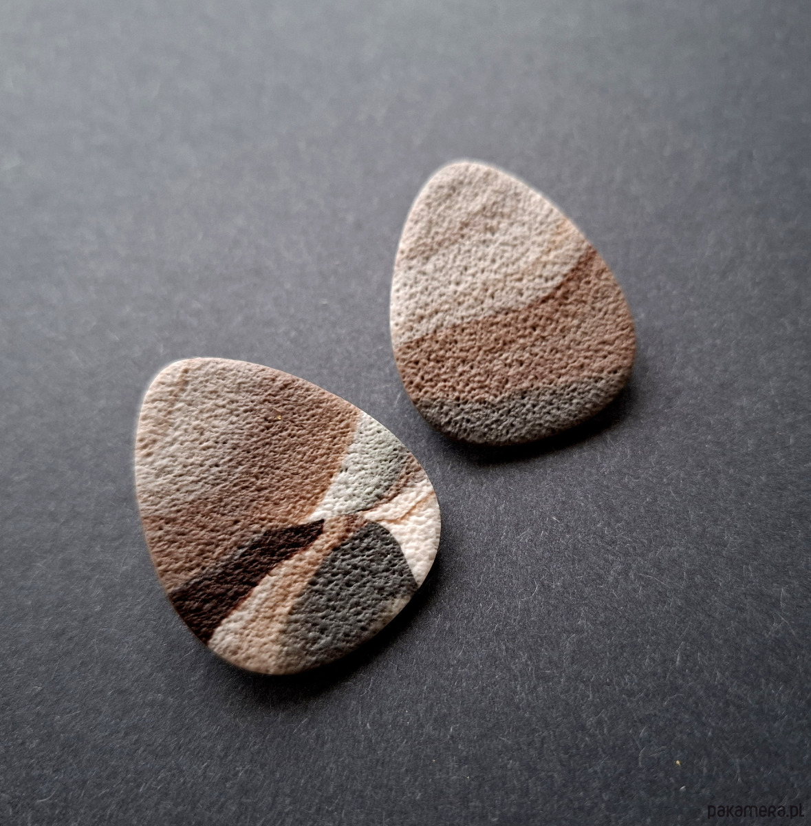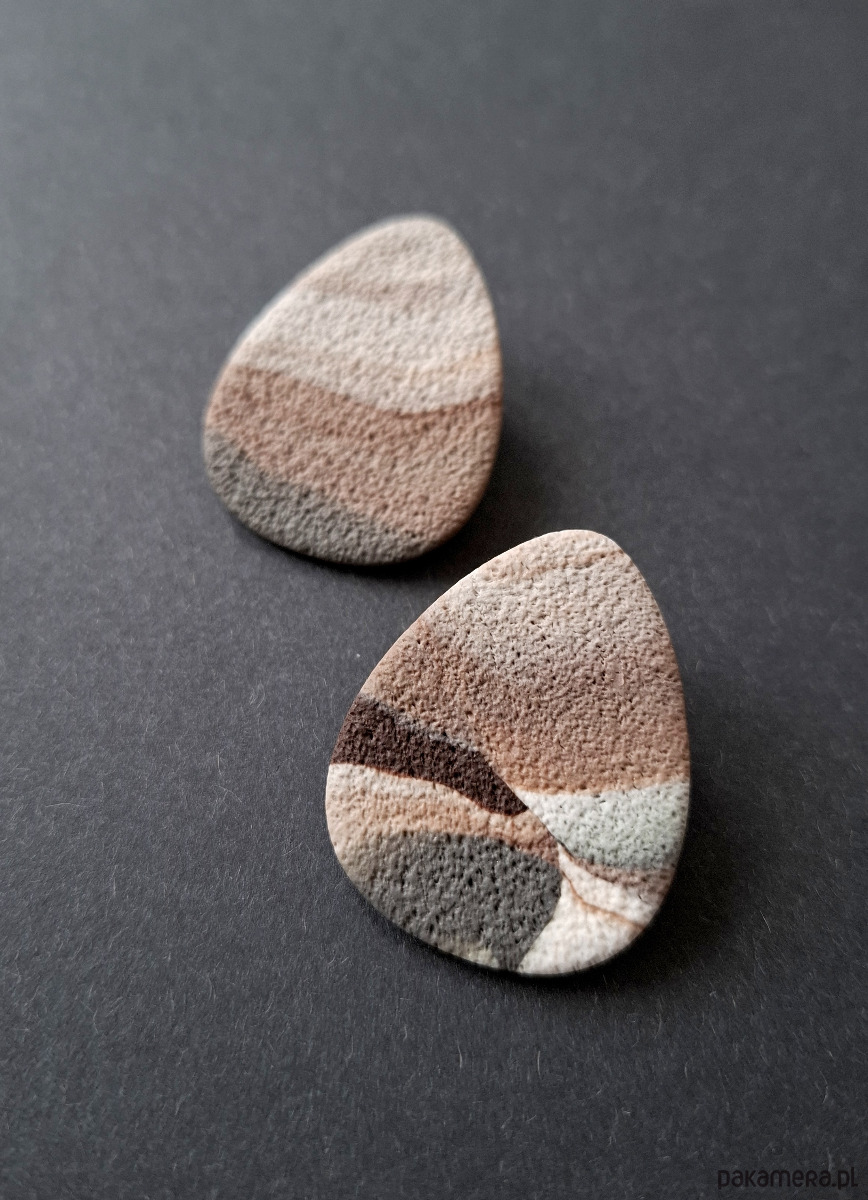 Lekkie kolczyki na sztyfty ręcznie wykonane z wysokiej jakości glinki polimerowej w minimalistycznym stylu. Jednostronne z pozłacanymi, nieuczulającymi sztyftami i barankami z silikonowym zabezpieczeniem. Wymiary: długość wraz z zapięciem: 3,8 cm; szerokość max. 3 cm. Wykonane w jedynym egzemplarzu.