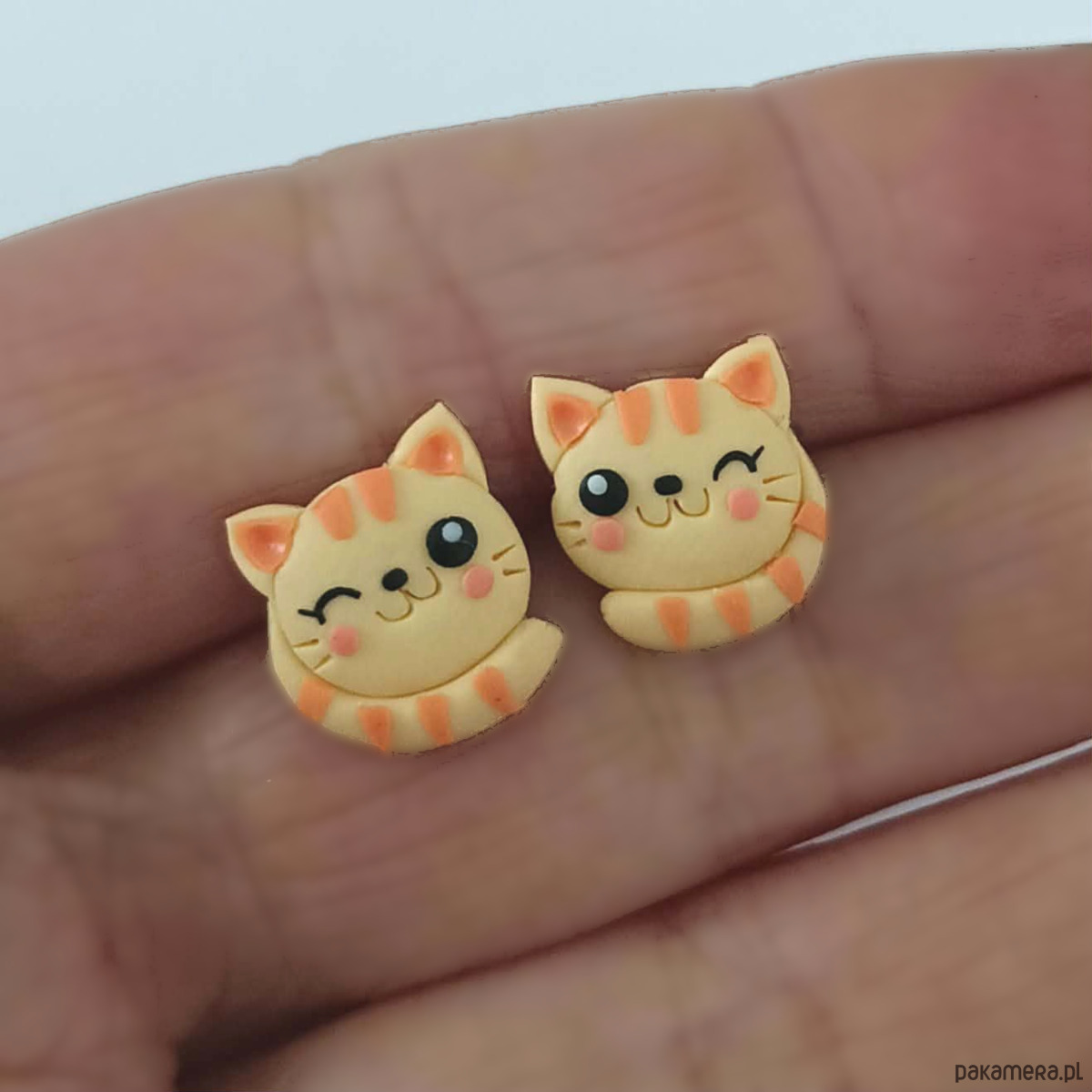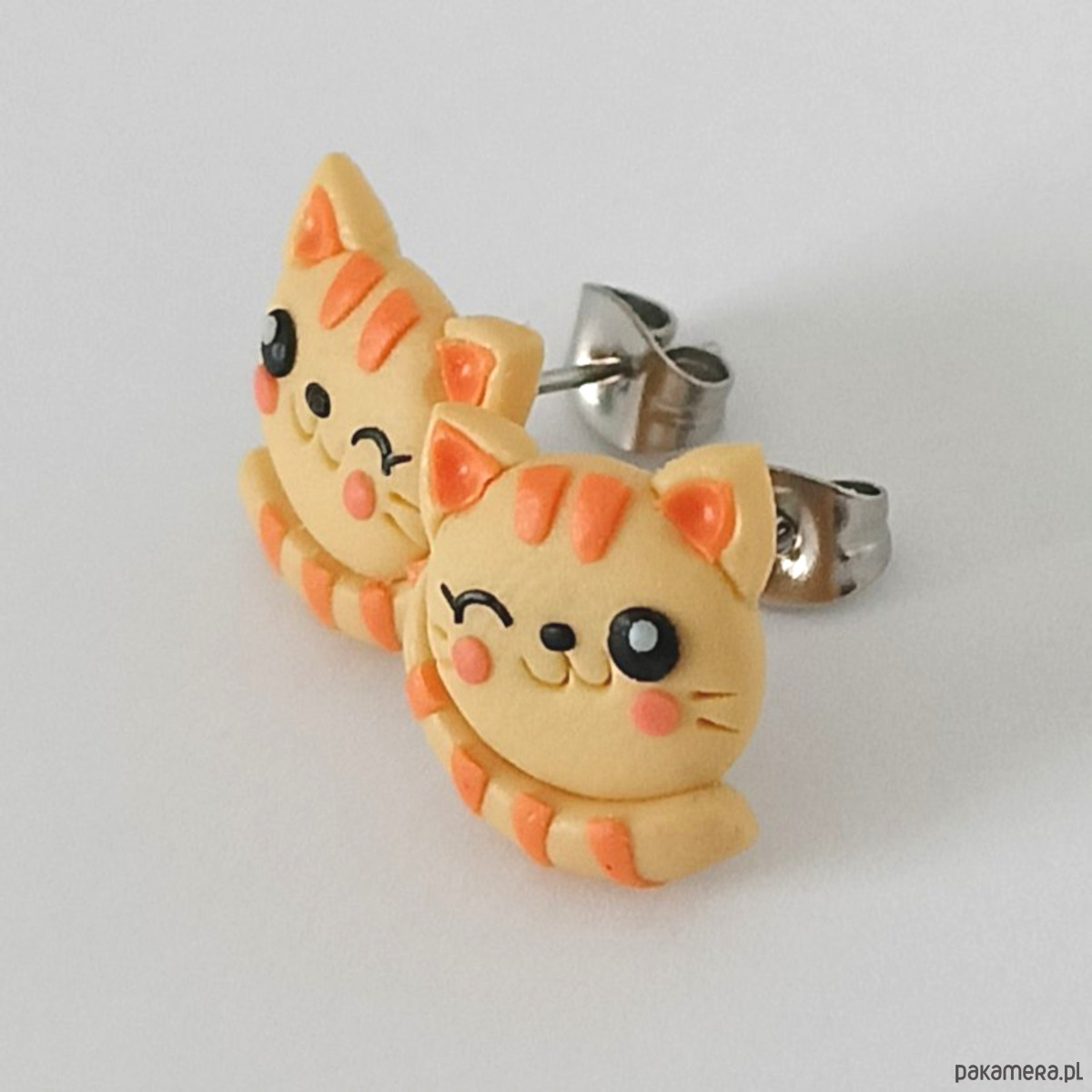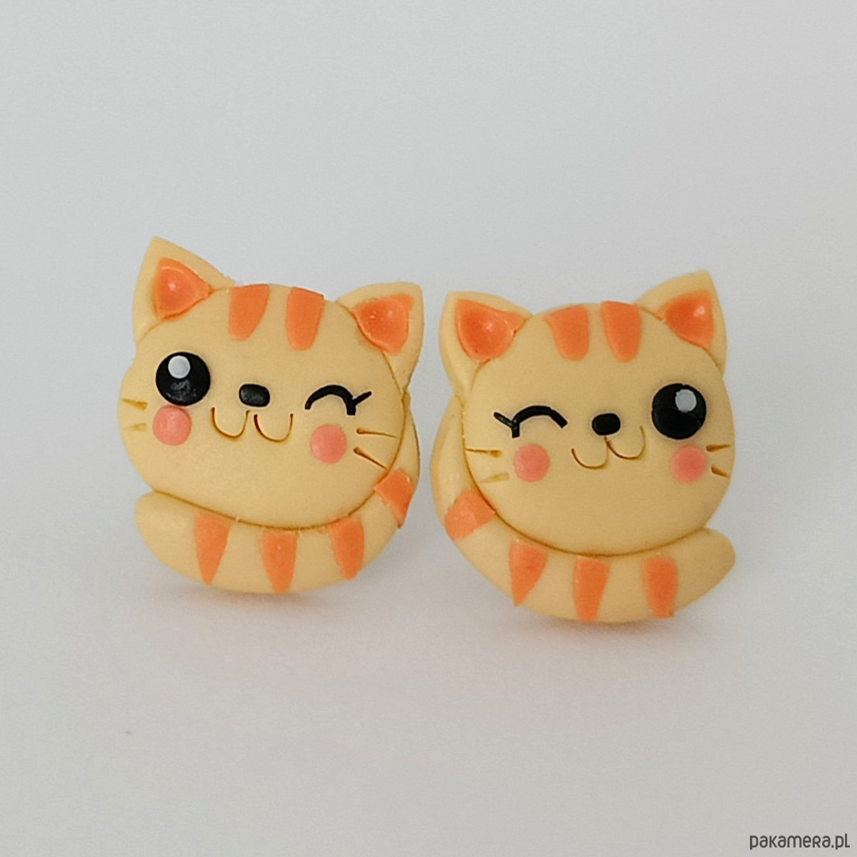 Urocze kolczyki w kształcie rudych kotków, ręcznie wykonane z masy polimerowej.