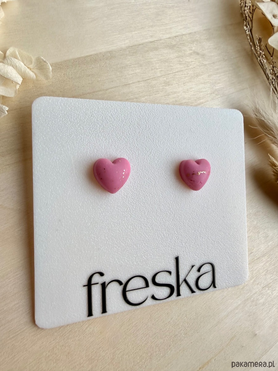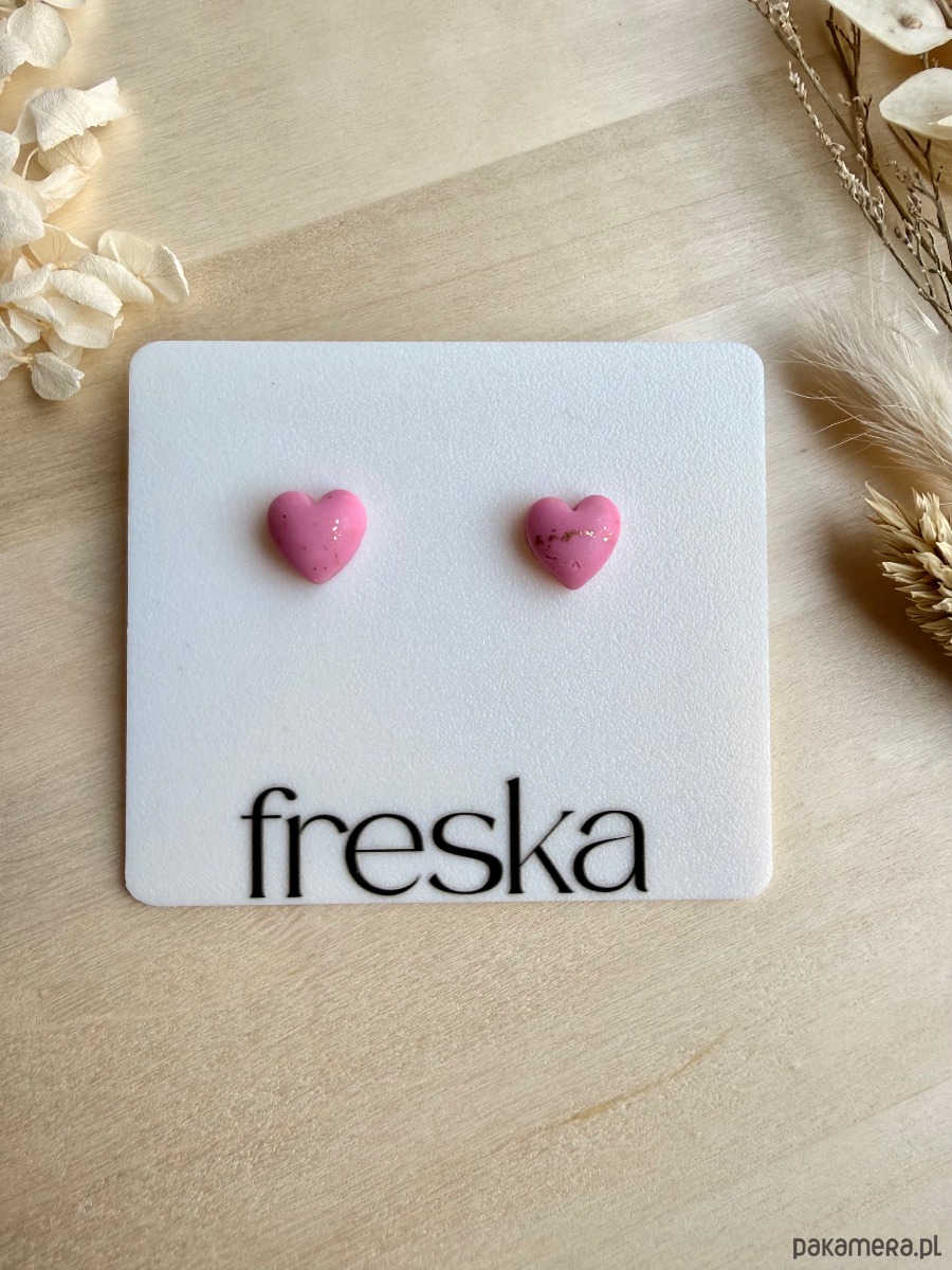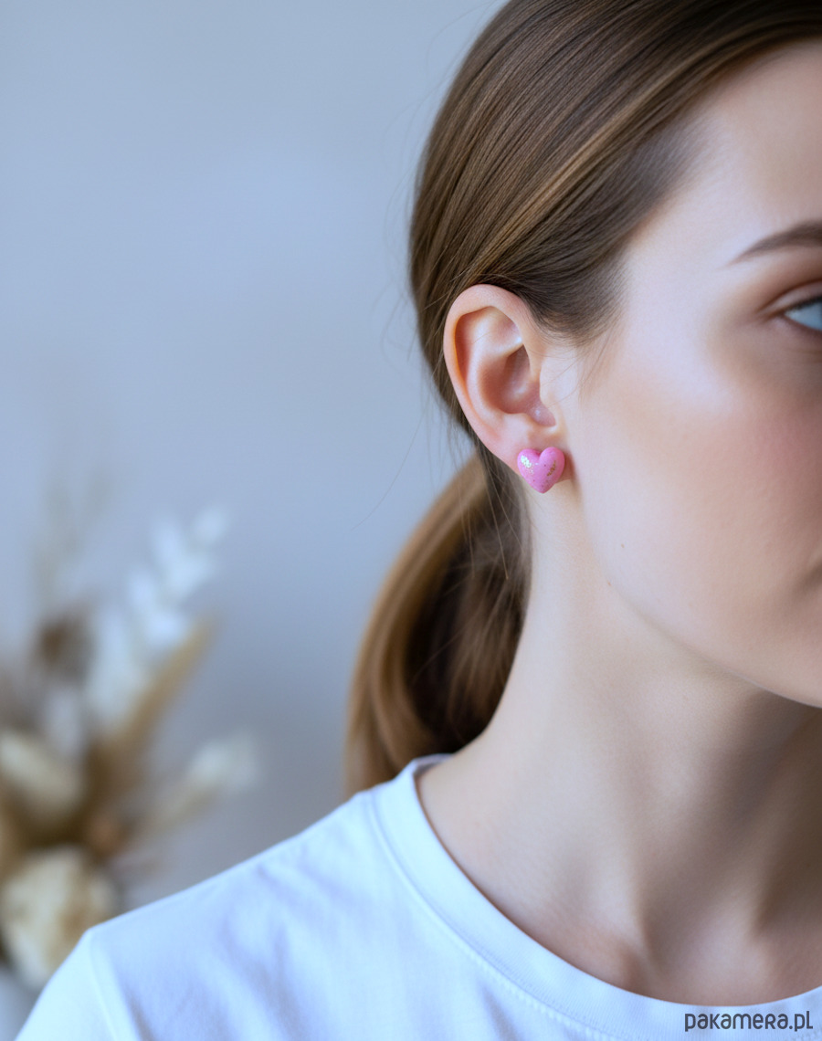 Pastelowe, trójwymiarowe serca w odcieniu różu to delikatny, ale wyrazisty akcent do codziennych stylizacji. Błyszcząca powierzchnia gliny polimerowej została muśnięta drobnymi, złotymi płatkami, które pięknie odbijają światło i dodają kolczykom subtelnej elegancji.
