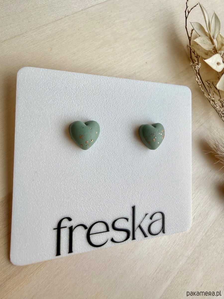 Pastelowe, trójwymiarowe serca w odcieniu szałwiowej zieleni to delikatny, ale wyrazisty akcent do codziennych stylizacji. Błyszcząca powierzchnia gliny polimerowej została muśnięta drobnymi, złotymi płatkami, które pięknie odbijają światło i dodają kolczykom subtelnej elegancji.