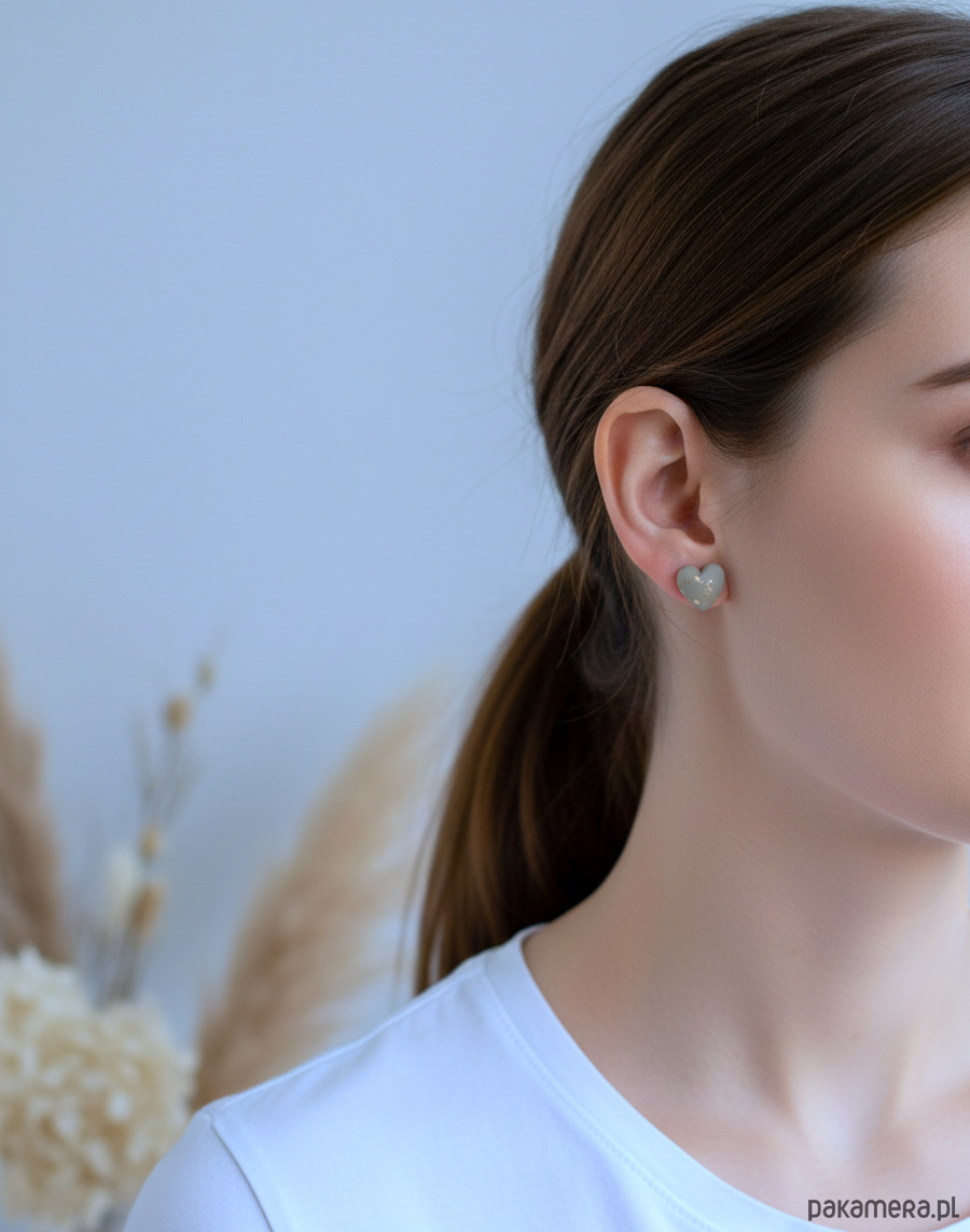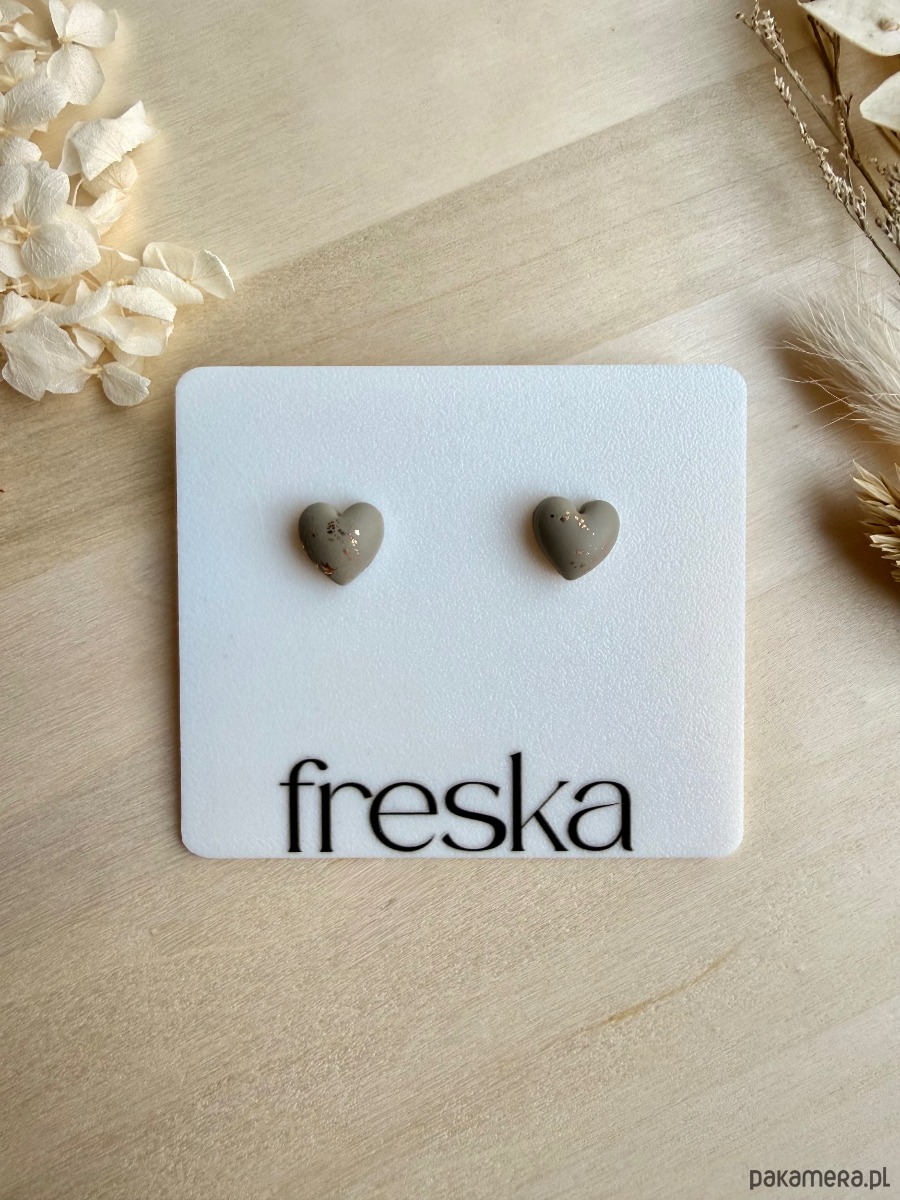 Pastelowe, trójwymiarowe serca w odcieniu ciepłej szarości to delikatny, ale wyrazisty akcent do codziennych stylizacji. Błyszcząca powierzchnia gliny polimerowej została muśnięta drobnymi, złotymi płatkami, które pięknie odbijają światło i dodają kolczykom subtelnej elegancji.