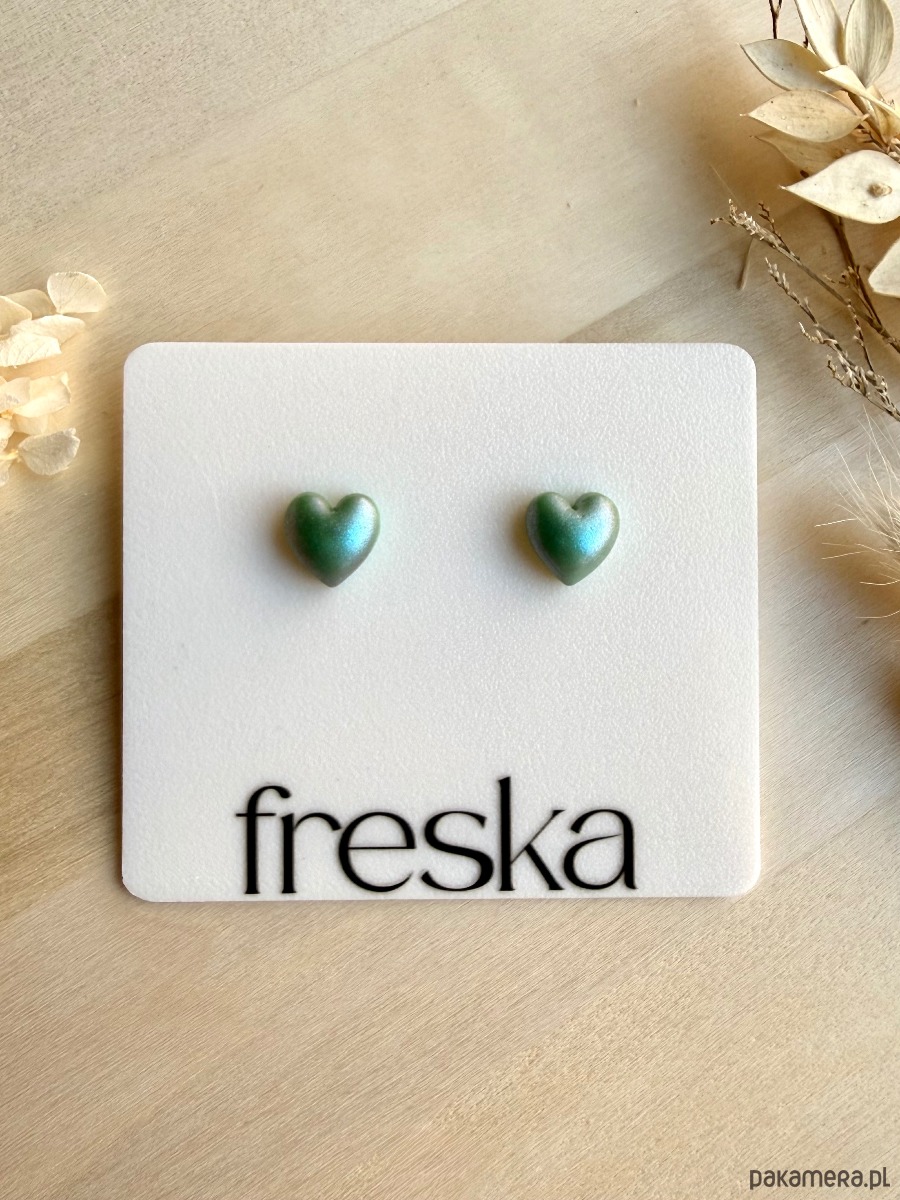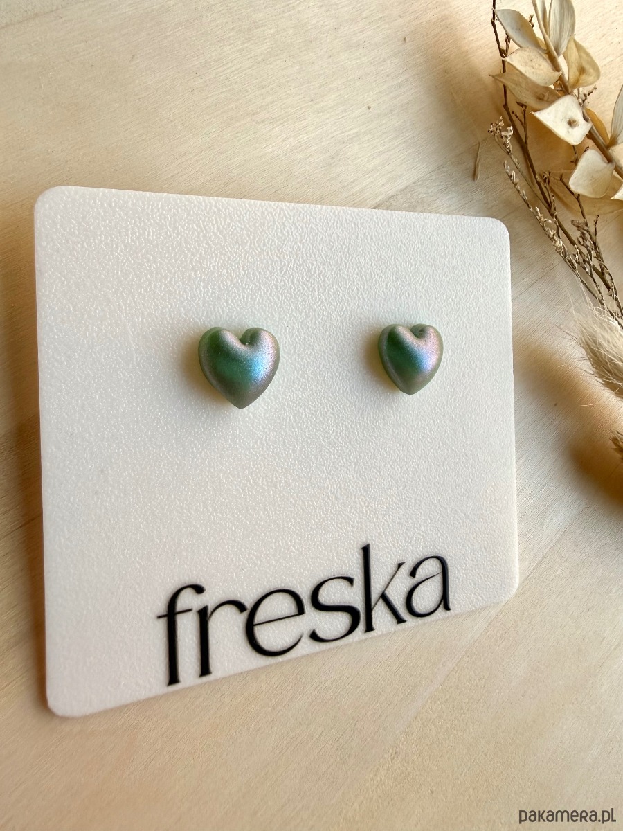 Postaw na wyjątkowy, „syreni” blask z trójwymiarowymi kolczykami–serduszkami w opalizującej zieleni! Wypukłe serca z gliny polimerowej połyskują różowo–turkusową poświatą niczym łuski syrenki, a całość osadzona jest na bazie ze stali chirurgicznej, odpowiedniej także dla wrażliwych uszu.