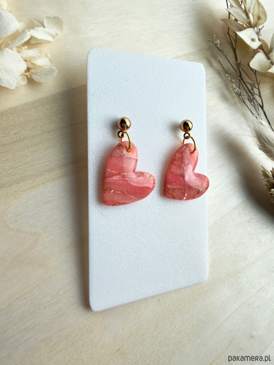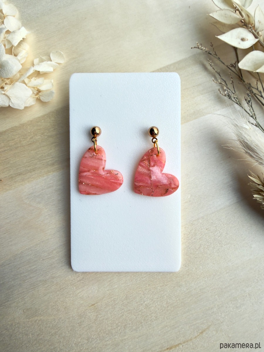 Duże, brzoskwiniowe serca to model dla osób, które lubią biżuterię widoczną, ale nadal lekką i dziewczęcą. Marmurkowy wzór w odcieniach brzoskwini i różu przeplatany złotymi drobinkami pięknie odbija światło, a serca zawieszone są na złotych sztyftach, które dodają im eleganckiego wykończenia.