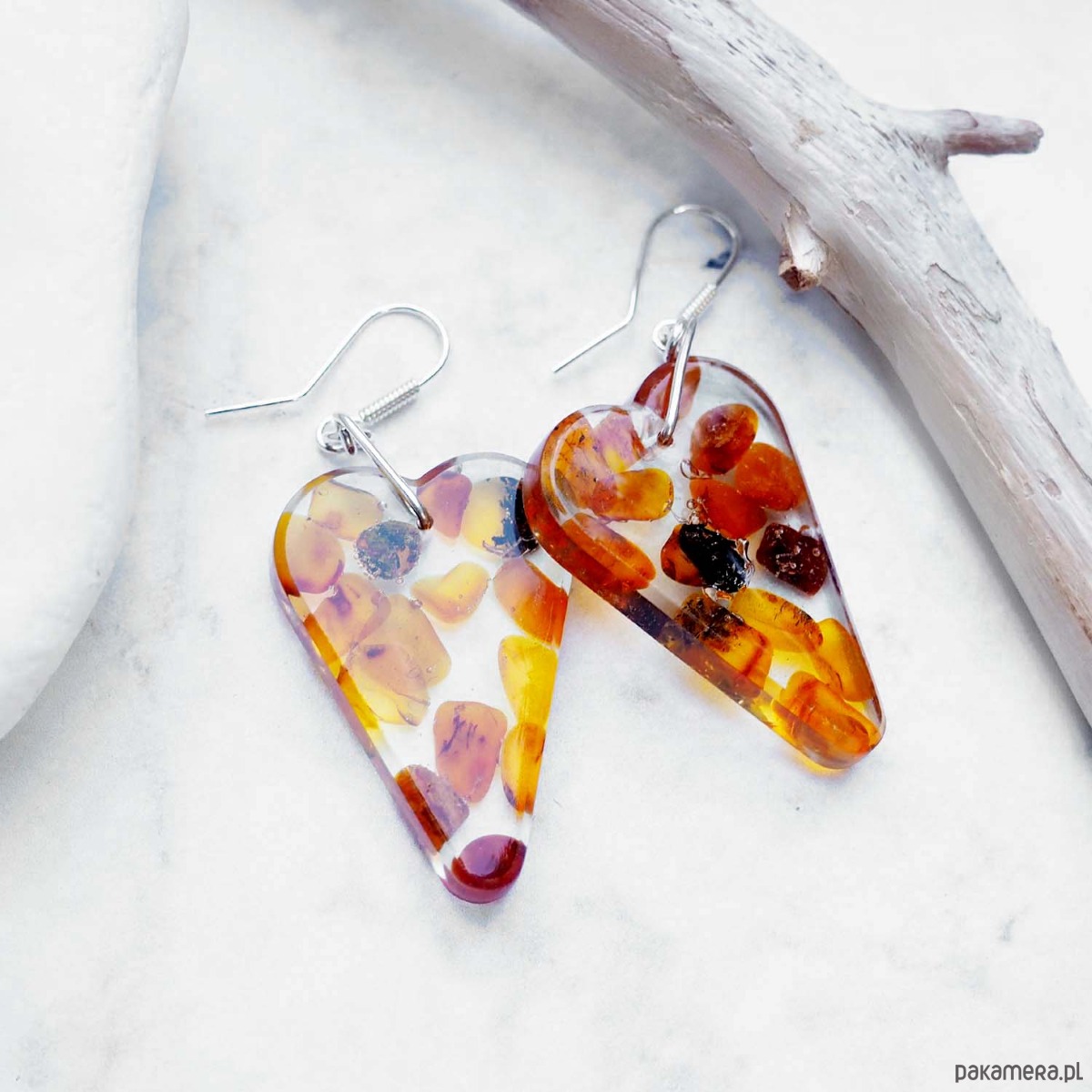 KOLCZYKI SERCA z bursztynem bałtyckimi w srebrze