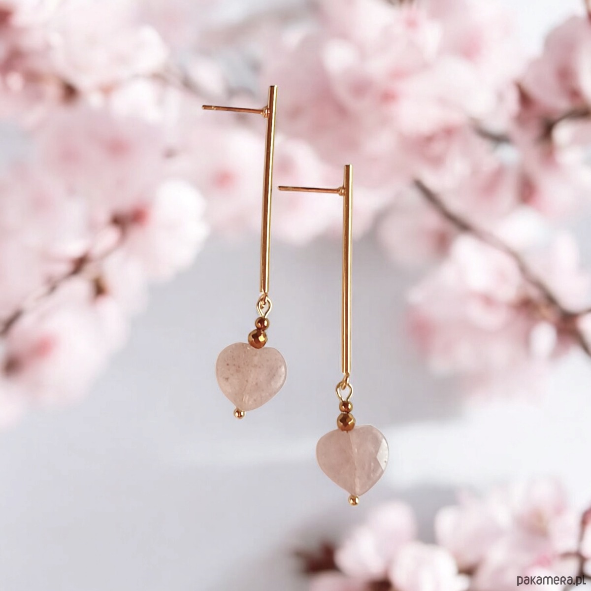 TUTAJ: urocze kolczyki wykonane z fasetowanych serduszek z kwarcu truskawkowego (barwa niejednolita - brudny róż) oraz przekładek ze złotego hematytu.