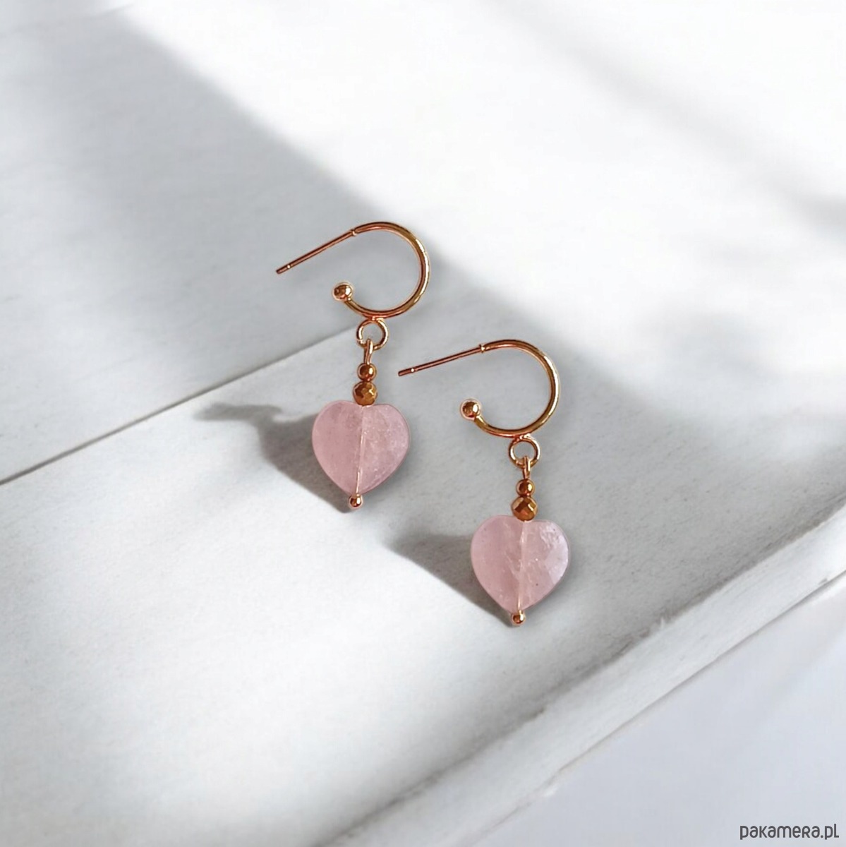 TUTAJ: urocze kolczyki wykonane z fasetowanych serduszek z kwarcu truskawkowego (barwa niejednolita - brudny róż) oraz przekładek ze złotego hematytu.