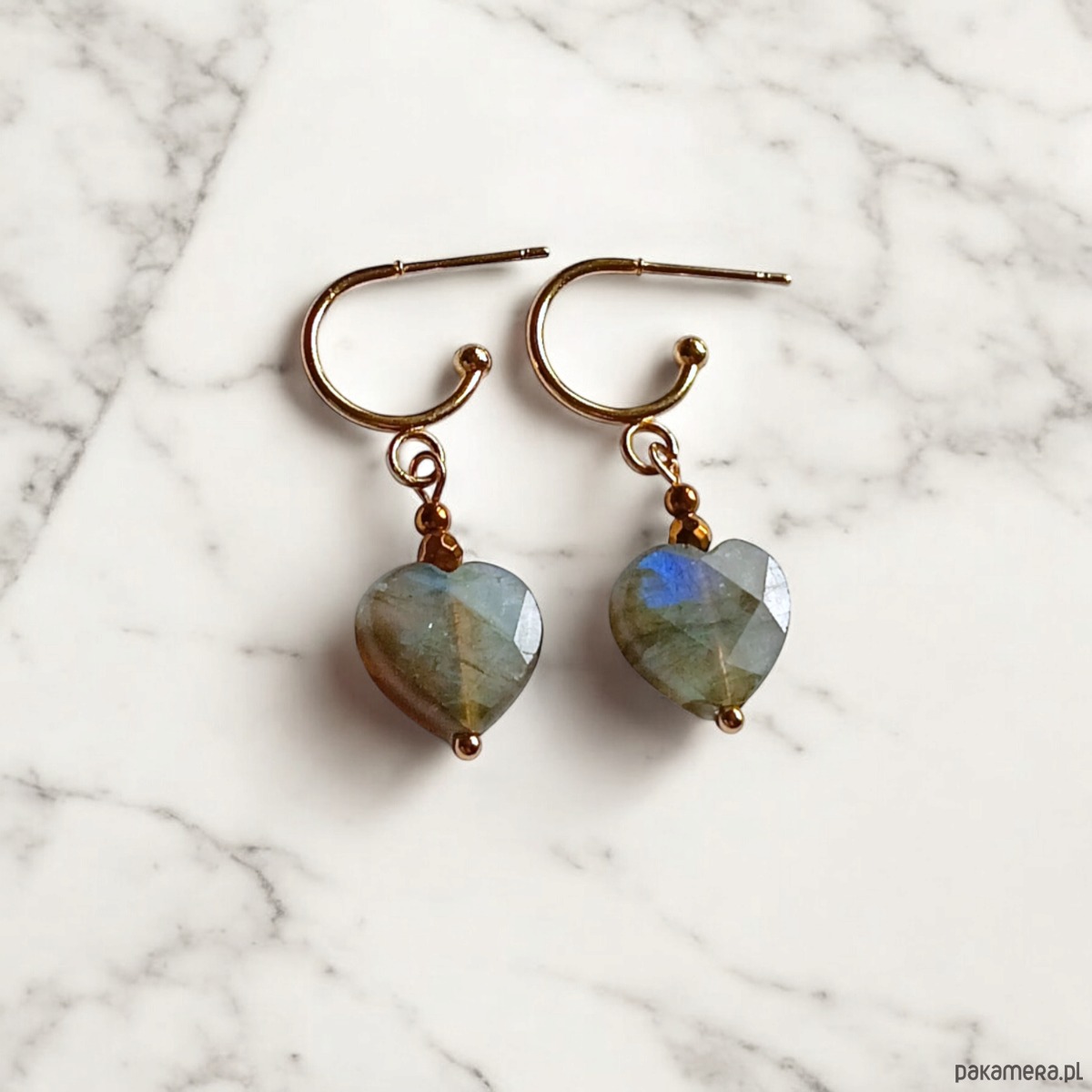 TUTAJ: urocze kolczyki wykonane z fasetowanych serduszek z labradorytu (barwa niejednolita - szara, pod odpowiednim kątem iryzuje na niebiesko) oraz przekładek ze złotego hematytu.