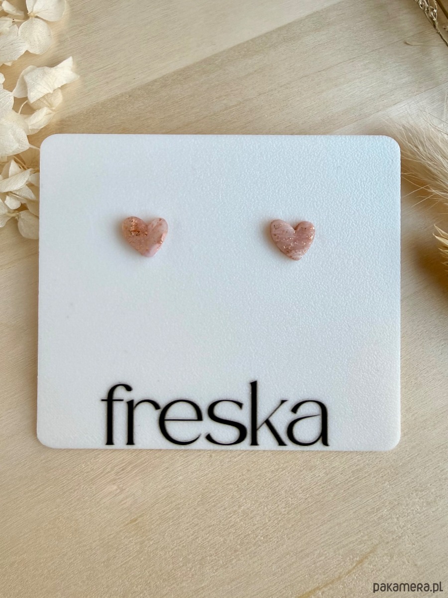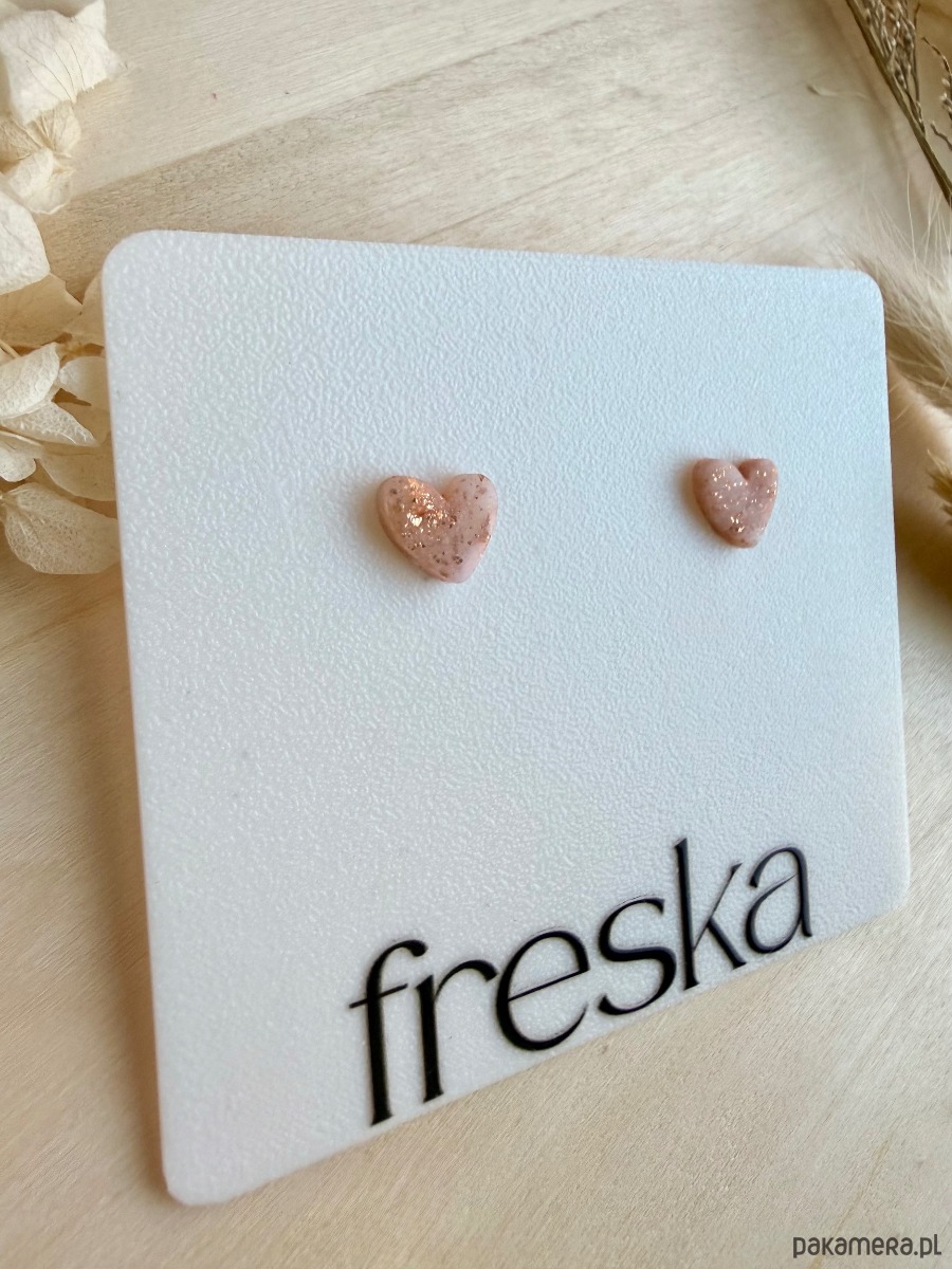 Delikatne kolczyki‑serduszka w pudrowym różu to subtelny, romantyczny akcent, który idealnie sprawdzi się zarówno na co dzień, jak i do bardziej eleganckich stylizacji. Zatopione w masie drobne, złote drobinki dodają im lekkiego blasku i sprawiają, że mimo niewielkiego rozmiaru pięknie rozświetlają okolice twarzy.