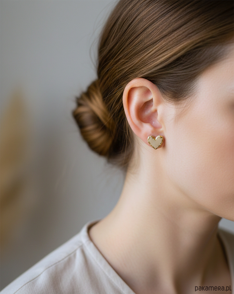 Małe, beżowe serduszka z cienką złotą ramką to biżuteria, która od razu przyciąga wzrok, ale nadal pozostaje elegancka. Matowa glina polimerowa w delikatnym odcieniu beżu pięknie kontrastuje ze złotym brzegiem, a całość osadzona jest na bazie ze stali chirurgicznej, odpowiedniej także dla wrażliwych uszu.