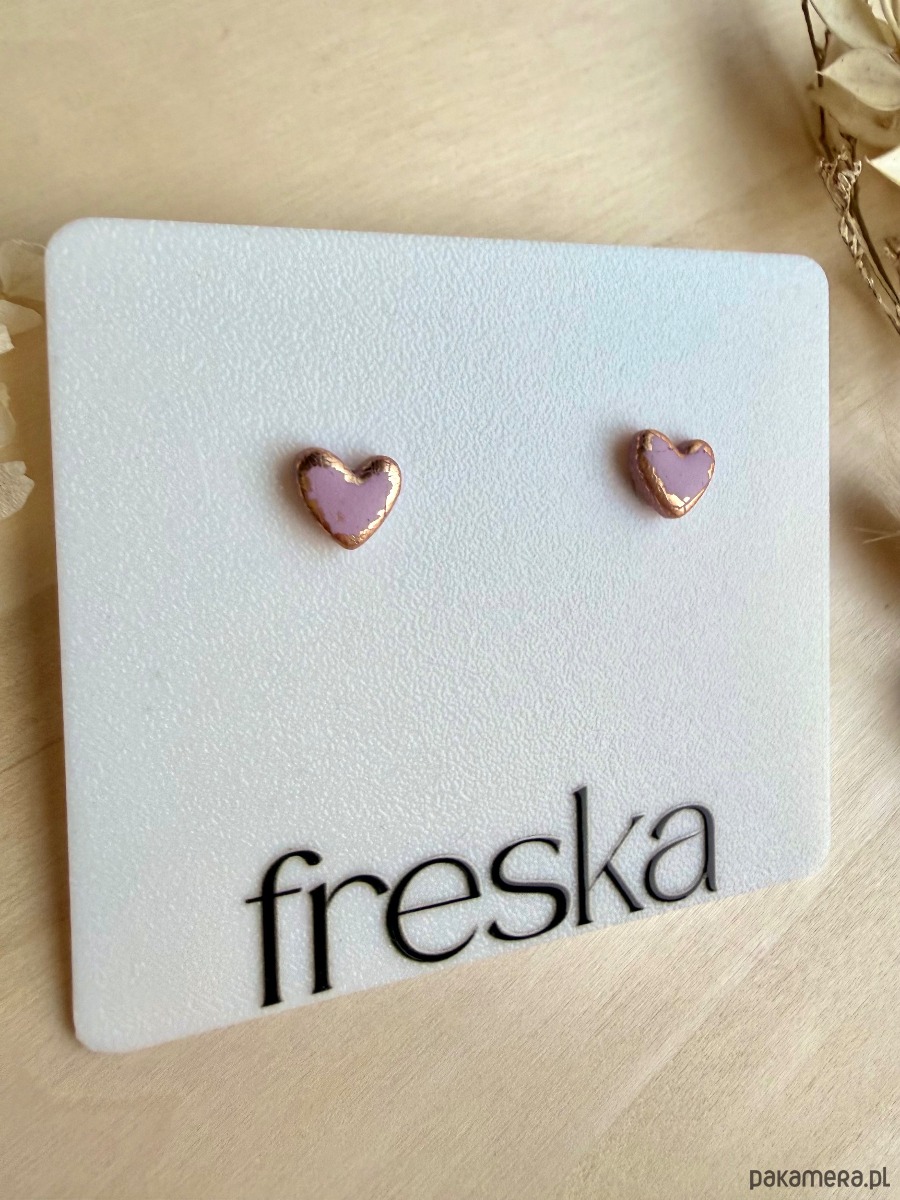Małe serduszka w odcieniu brudnego różu z cienką złotą ramką to biżuteria, która od razu przyciąga wzrok, ale nadal pozostaje elegancka. Matowa glina polimerowa w delikatnym różowym kolorze pięknie kontrastuje ze złotym brzegiem, całość osadzona jest na bazie ze stali chirurgicznej, odpowiedniej także dla wrażliwych uszu.