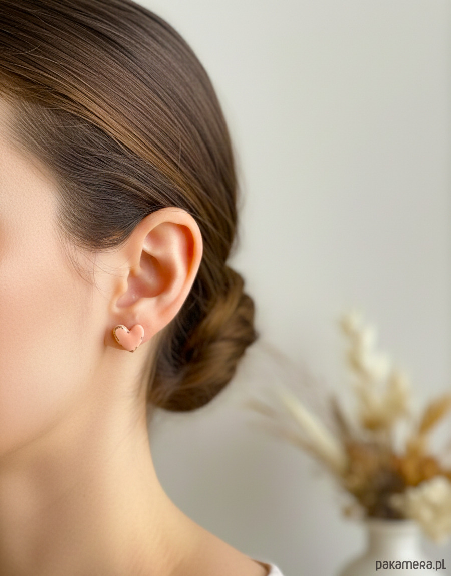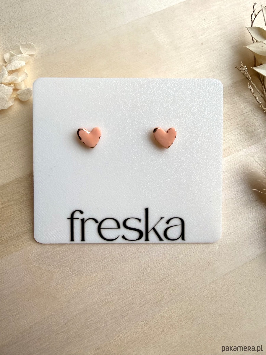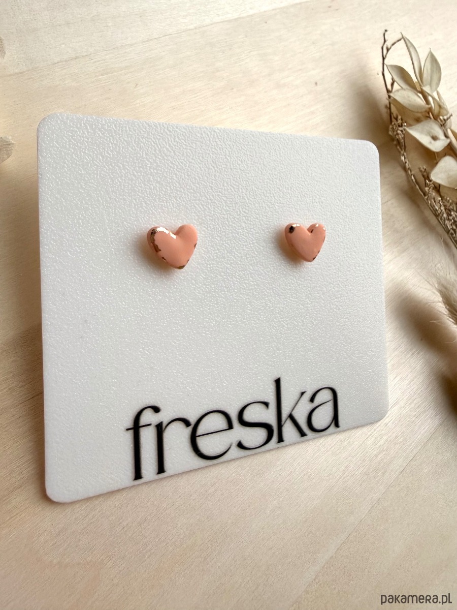 Małe, koralowe serduszka z cienką złotą ramką to biżuteria, która od razu przyciąga wzrok, ale nadal pozostaje elegancka. Matowa glina polimerowa w pastelowym koralowym odcieniu pięknie kontrastuje ze złotym brzegiem, a całość osadzona jest na bazie ze stali chirurgicznej, odpowiedniej także dla wrażliwych uszu.