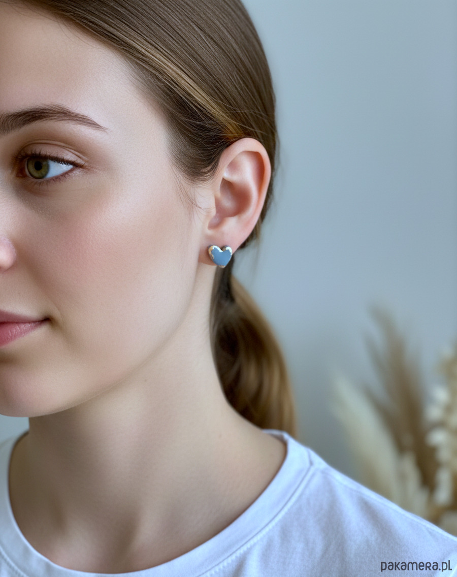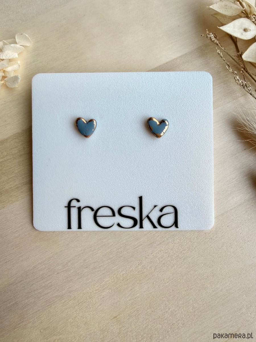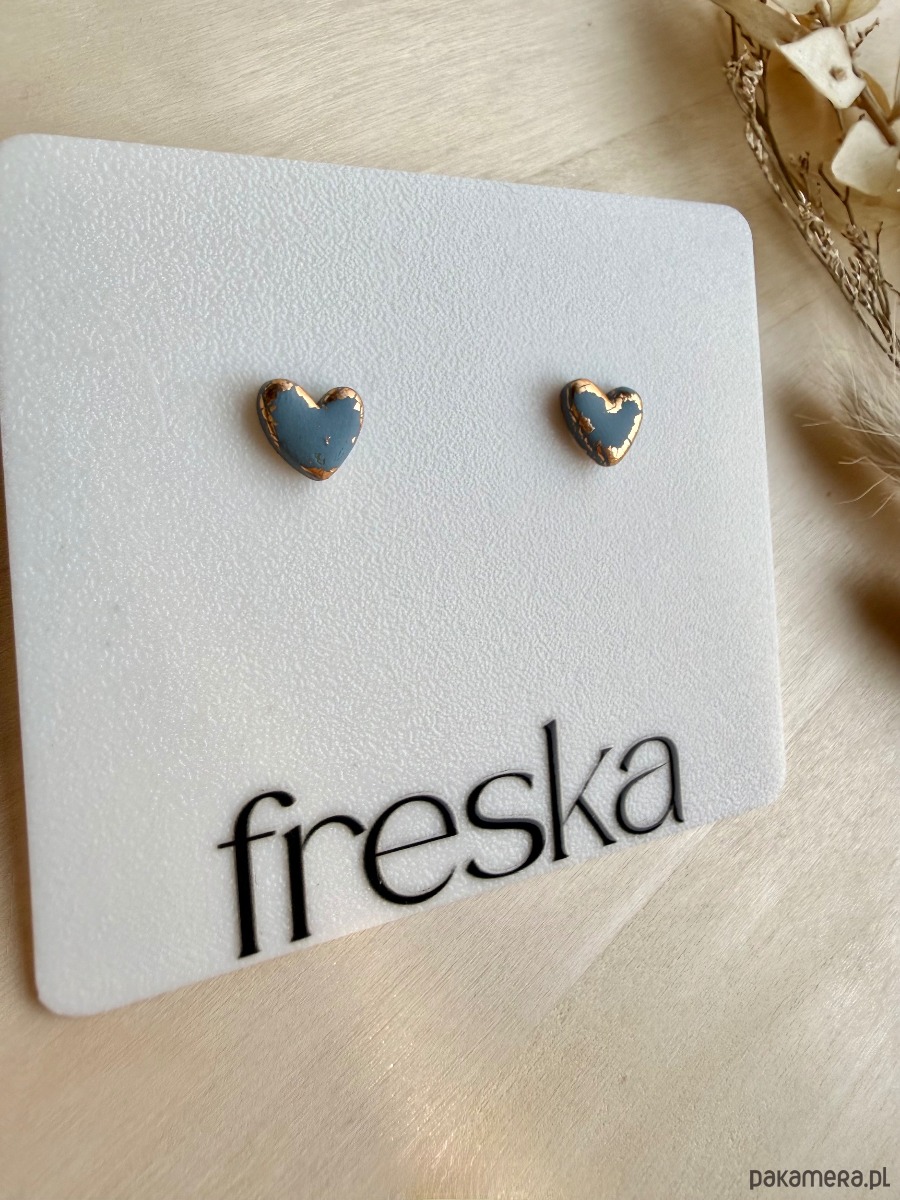 Małe, niebieskie serduszka z cienką złotą ramką to biżuteria, która od razu przyciąga wzrok, ale nadal pozostaje elegancka. Matowa glina polimerowa w przydymionym odcieniu niebieskiego pięknie kontrastuje ze złotym brzegiem, a całość osadzona jest na bazie ze stali chirurgicznej, odpowiedniej także dla wrażliwych uszu.