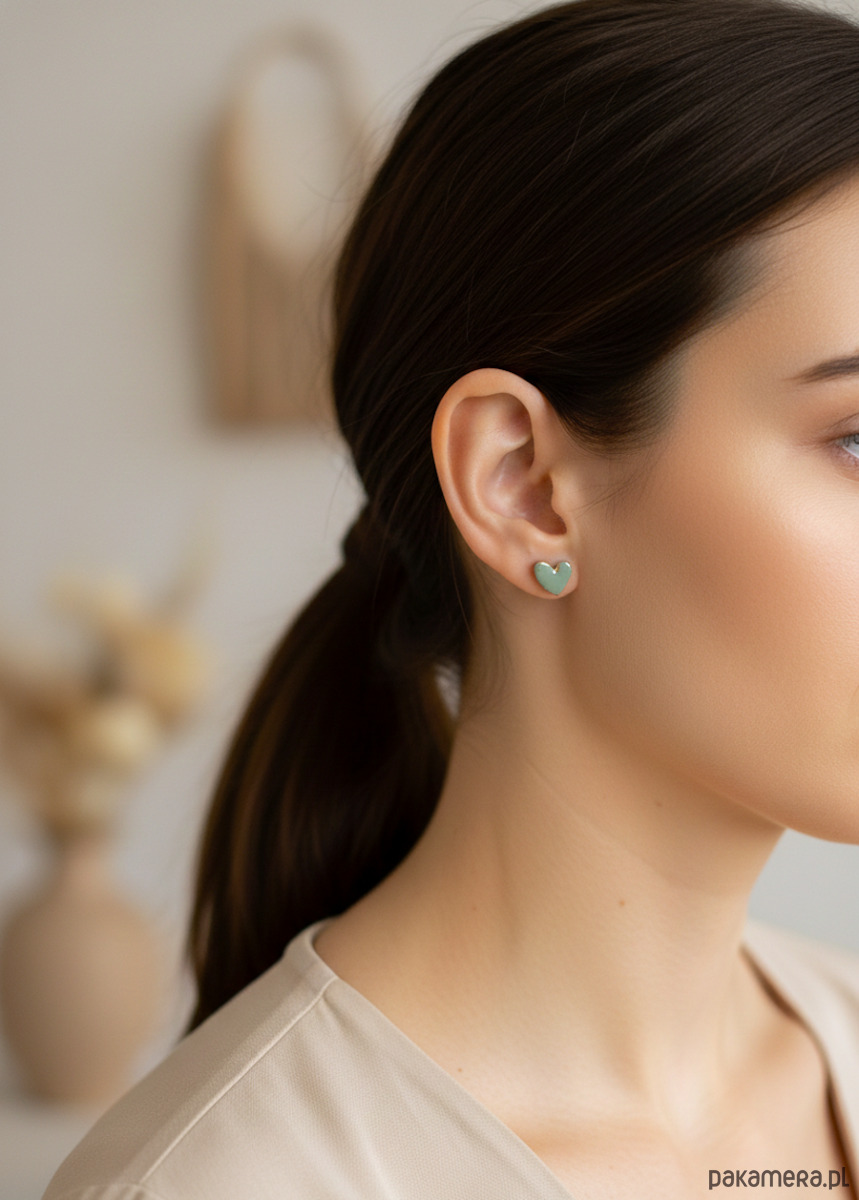 Małe, szałwiowe serduszka z cienką złotą ramką to biżuteria, która od razu przyciąga wzrok, ale nadal pozostaje elegancka. Matowa glina polimerowa w delikatnym szałwiowym kolorze pięknie kontrastuje ze złotym brzegiem, a całość osadzona jest na bazie ze stali chirurgicznej, odpowiedniej także dla wrażliwych uszu.